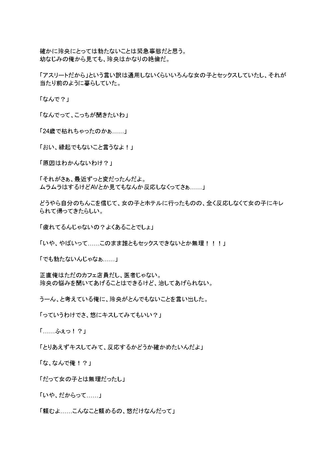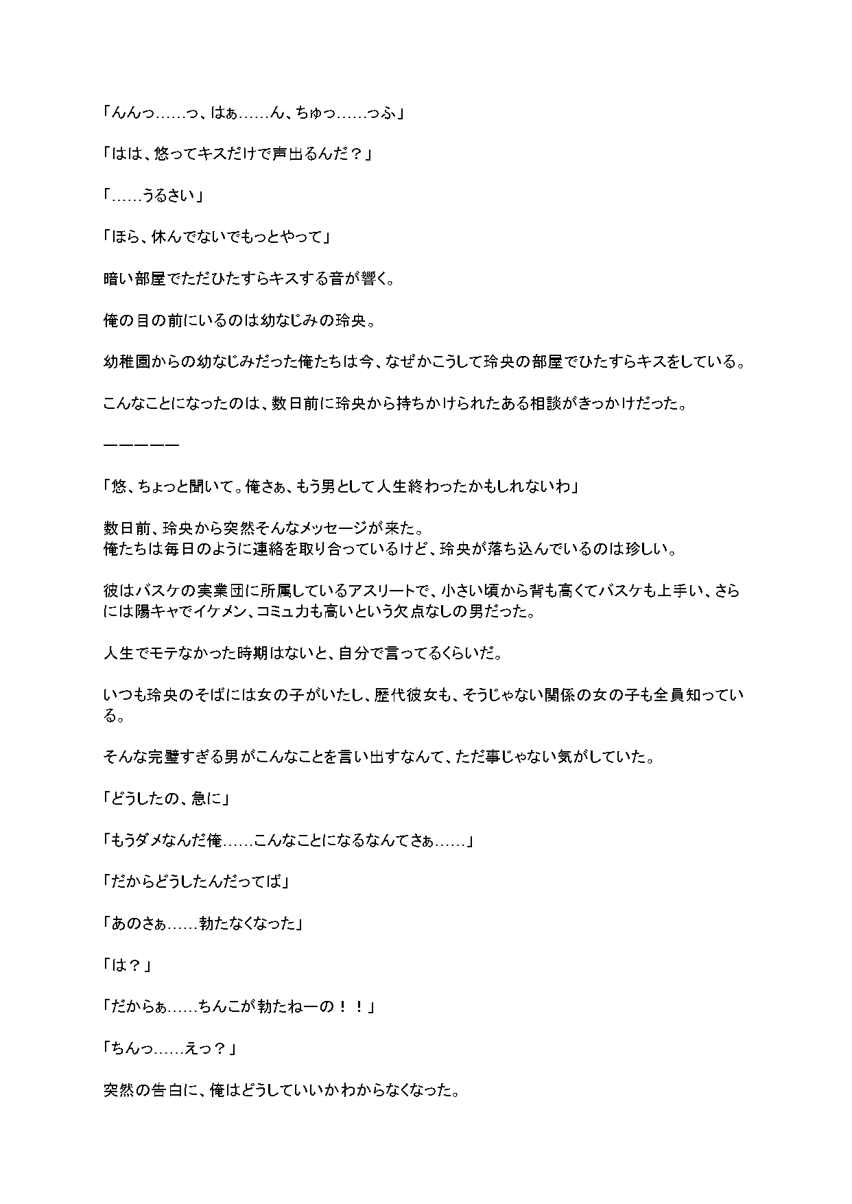 なぜかちんぽが勃たなくなった幼なじみ・玲央のために、えっちな雰囲気の中、キスをして興奮させることになった悠。