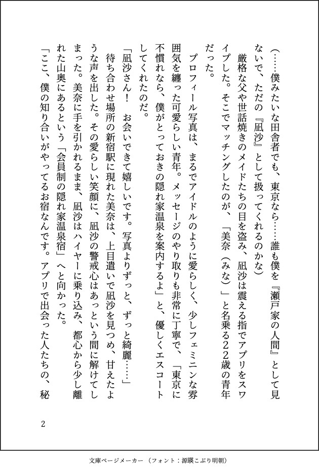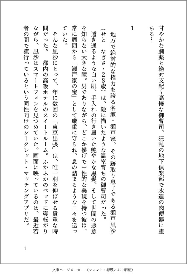 【あらすじ】 地方名家の次期当主として、厳格に育てられた瀬戸凪沙(28歳)。 息の詰まる日常から逃れるため、東京出張の夜にこっそり同性向けマッチングアプリを開いたことが、彼の運命を狂わせる。