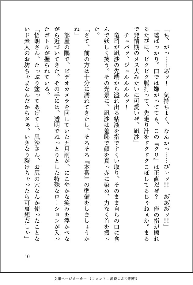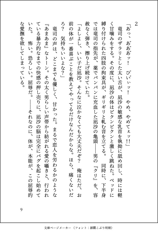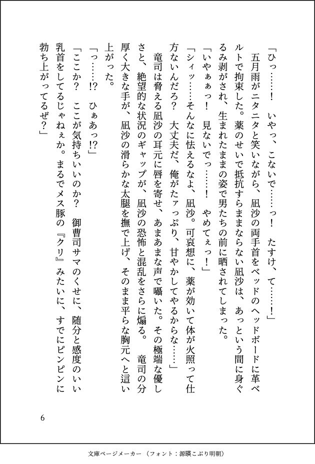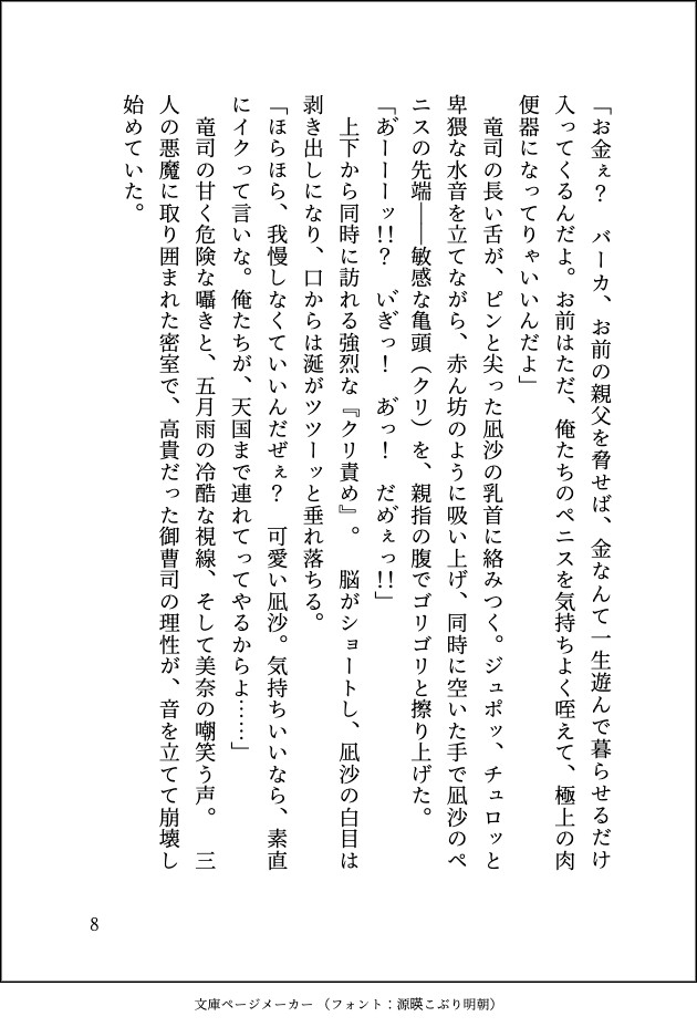 「狂っていいんだよ、凪沙。俺たちがお前の本当の姿を教えてやるからな」 竜司の「あまあま」な洗脳と、五月雨の容赦ない凌○の果て。 そして迎える、数十人のVIP会員の目が光る「狂乱の公開排泄&輪○ショー」。