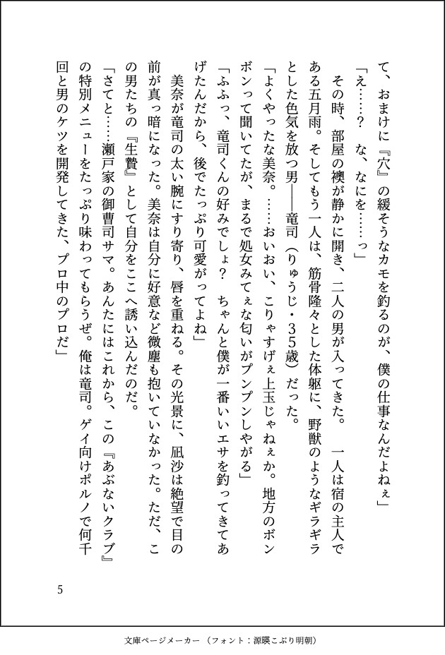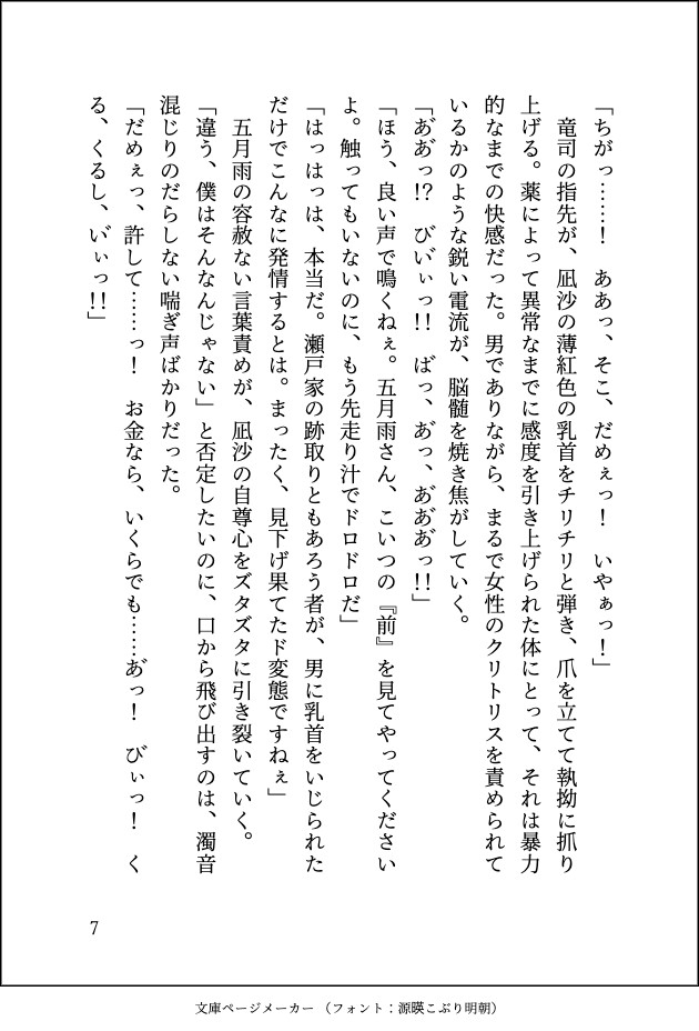 待ち受けていたのは、冷酷な宿の主人・五月雨と、ゲイポルノ界の調教師・竜司。 逃げ場のない密室で、薬によって感度を極限まで引き上げられた凪沙は、処女穴を容赦なく極太の楔で貫かれ、前後の穴を同時に蹂躙される。