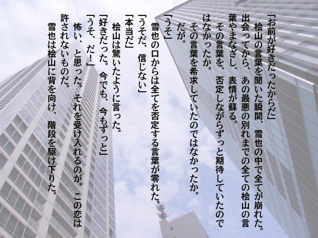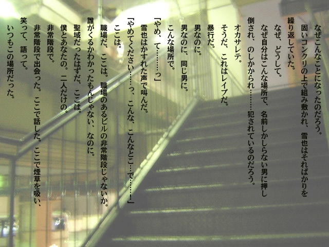 サラリーマン・雪也は喫煙場所にしている非常階段でエリート社員の檜山に出会う。他愛ない話をしながら次第に心惹かれていく雪也。