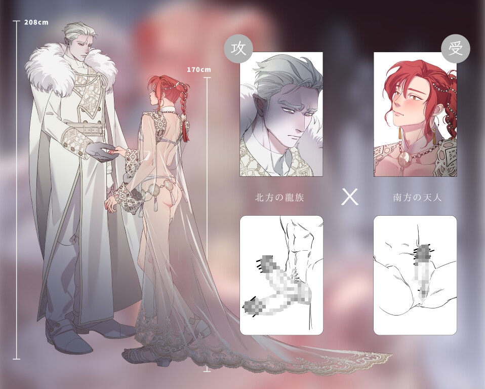 攻,130歲(外表約20歲),208cm,色薄,性格孤僻偏執,對早年遇到的外國貴賓一見鍾情,從此不婚娶直到爭取到跨族聯姻。因為是龍所以有兩隻陰莖。