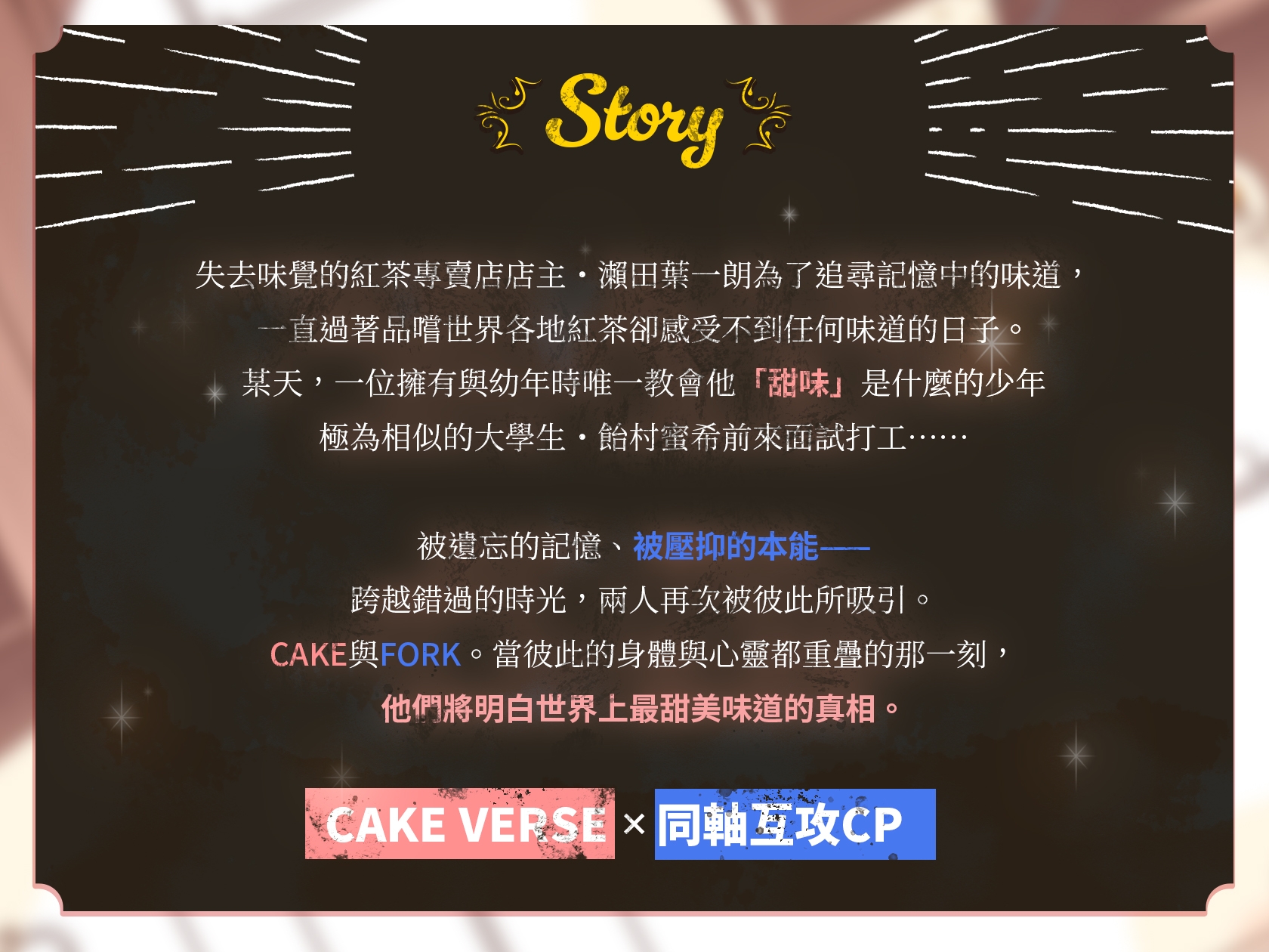 本作所使用的「CAKEVERSE(ケーキバース/蛋糕叉子)」世界觀,係經由原案者Magnolia授權後,由本社團加以採用。