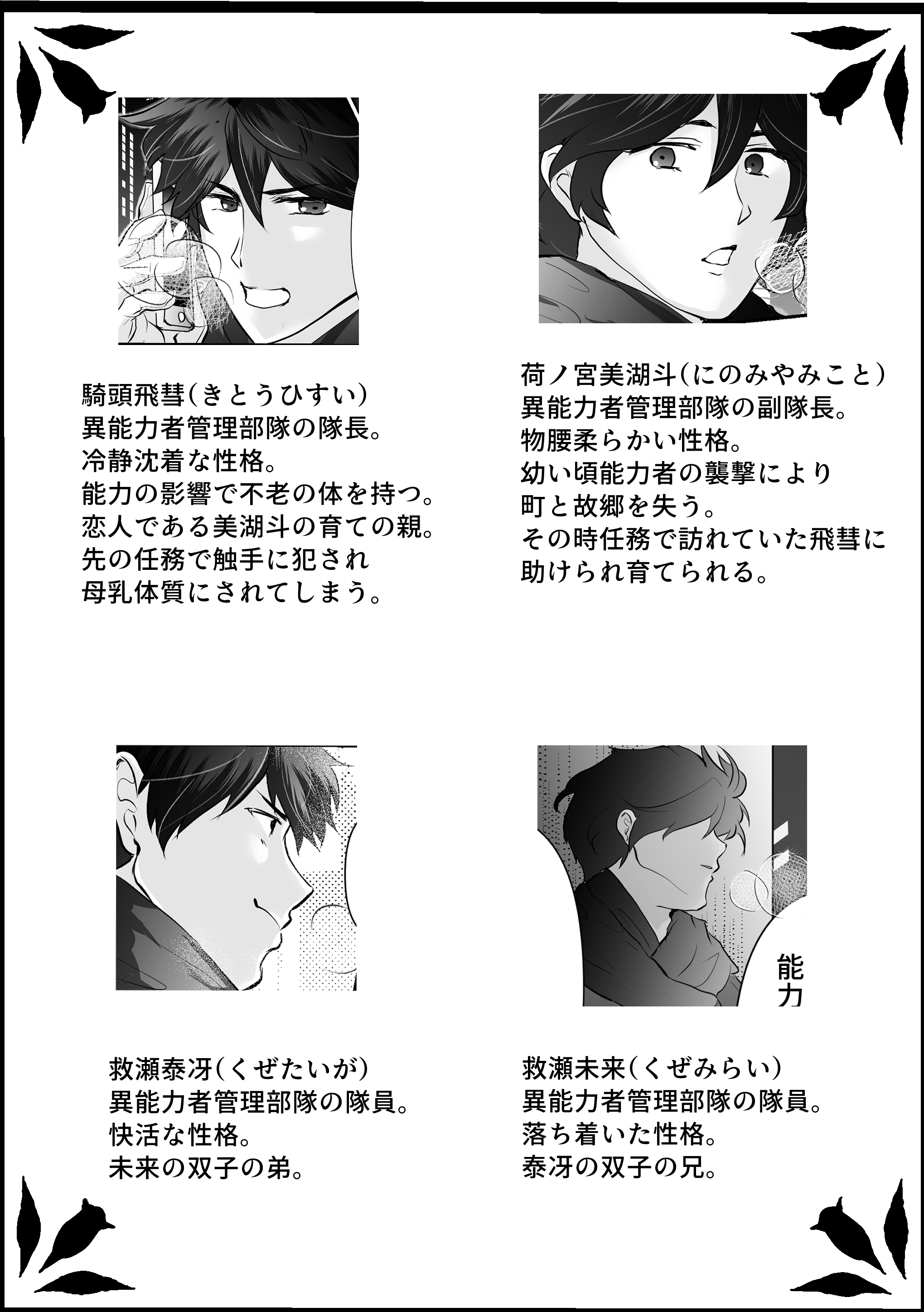 異能力者管理部隊の隊長・騎頭飛彗と、副隊長で恋人の荷ノ宮美湖斗。