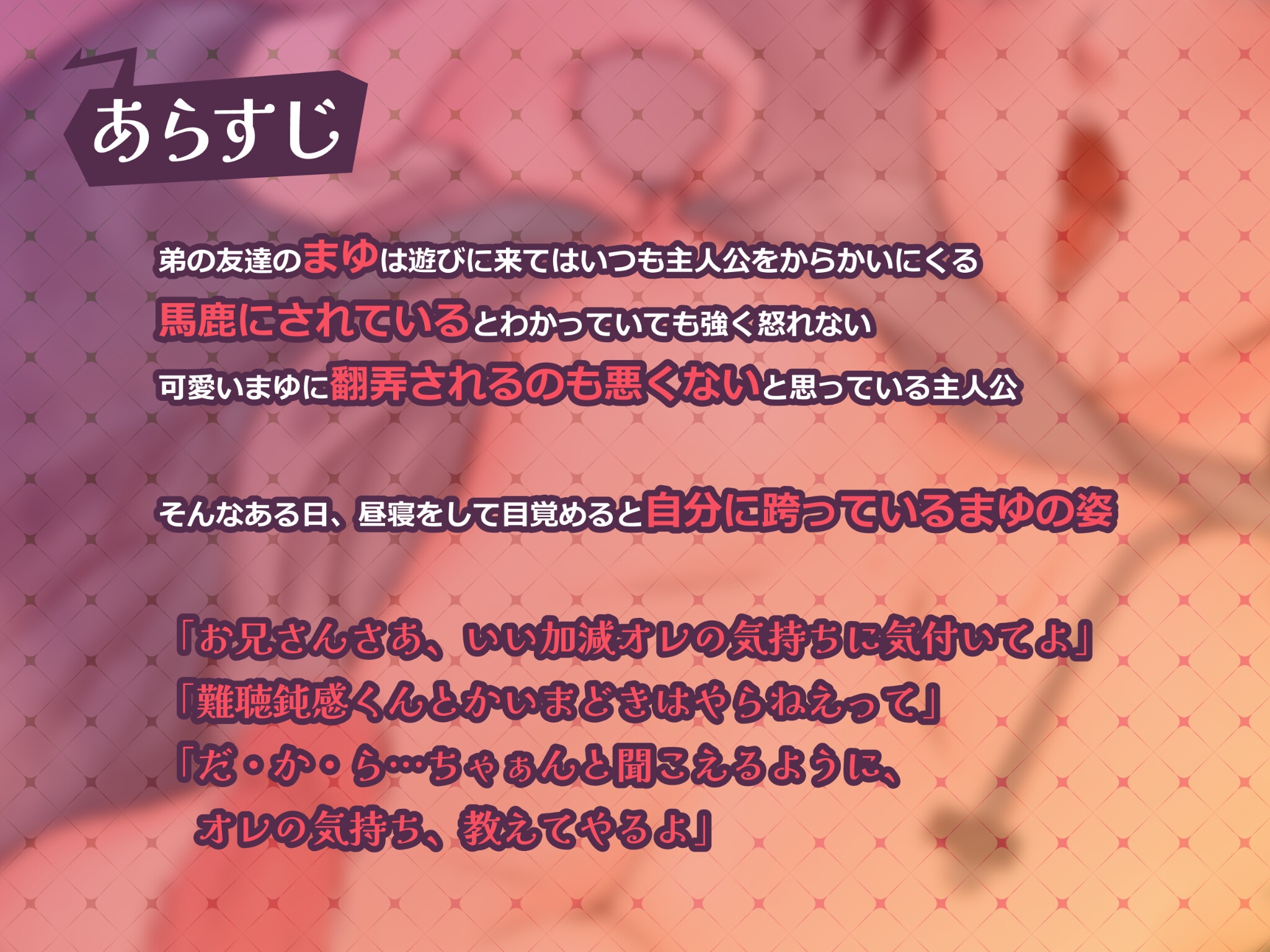 ![生意気なメ○ガキまゆちゃんの甘蕩スキスキ♡囁き♡M向け連続寸止め&射精地獄♡ ~唾液多めぐぽぐぽぢゅるぢゅる耳舐め♡愛情いっぱい密着すきすき囁き~ [ドスケベですけど何か問題でも?] 生意気なメ○ガキまゆちゃんの甘蕩スキスキ♡囁き♡M向け連続寸止め&射精地獄♡ ~唾液多めぐぽぐぽぢゅるぢゅる耳舐め♡愛情いっぱい密着すきすき囁き~ [ドスケベですけど何か問題でも?]](http://img.dlsite.jp/modpub/images2/parts/RJ01564000/RJ01563405/1584d5e15747282a54f00223d6ca412d.jpg)