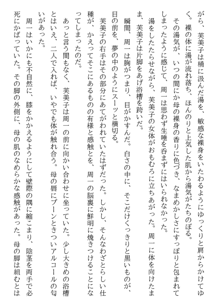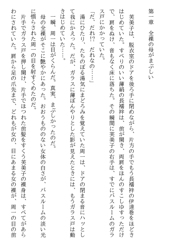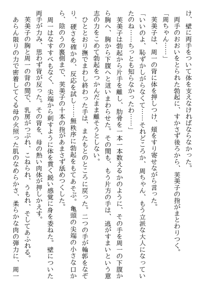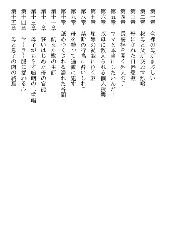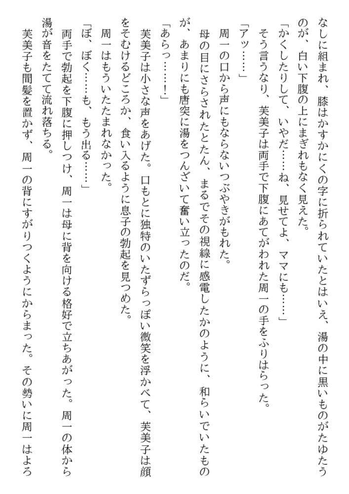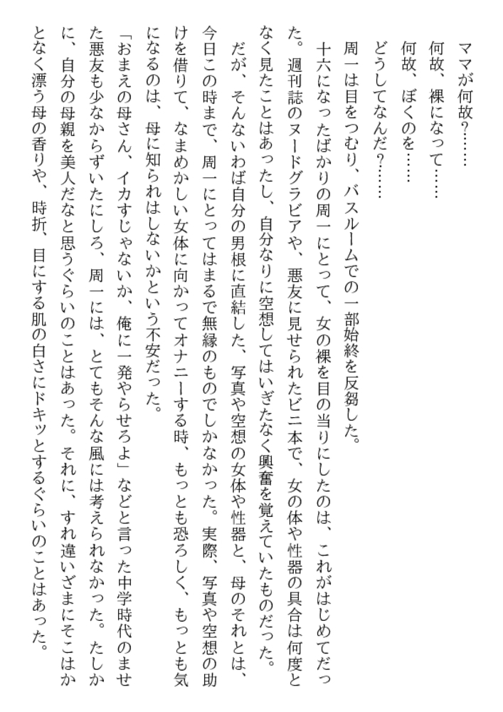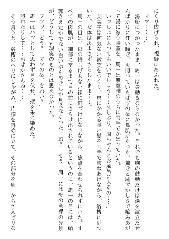 禁断の母子相姦でしか味わえない肉悦が、貞淑な母と純粋な息子を狂わせた! 大きく股をひろげ、息子にすべてを晒す母に、今やためらう気持ちはなくなっていた。「周一、ママの……アソコにキスして」夫のいない昼下がり、二人は今日も……