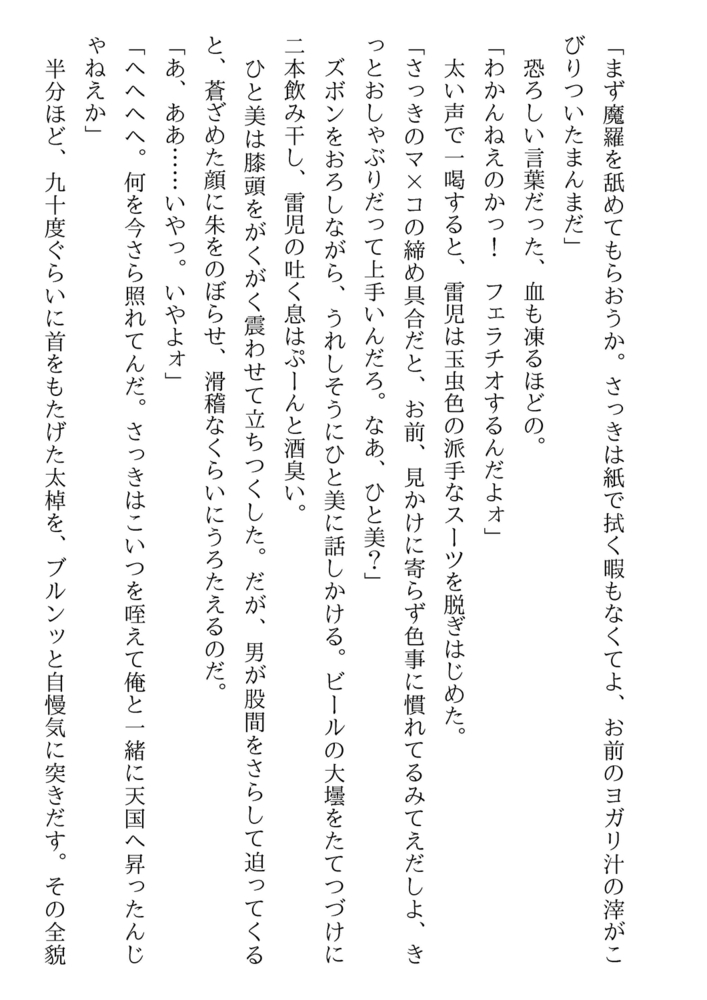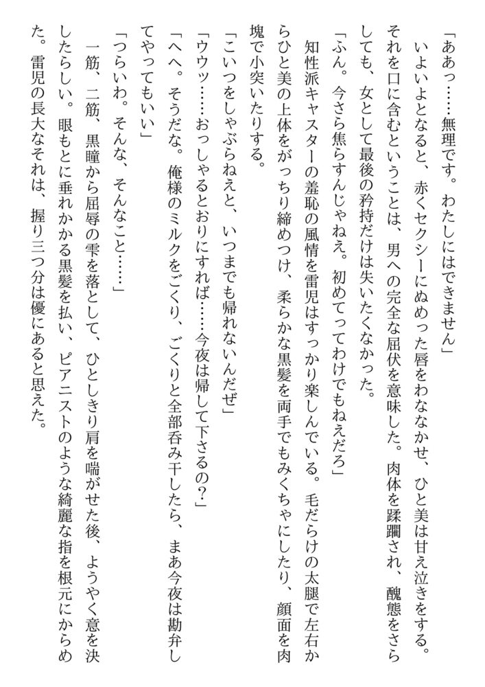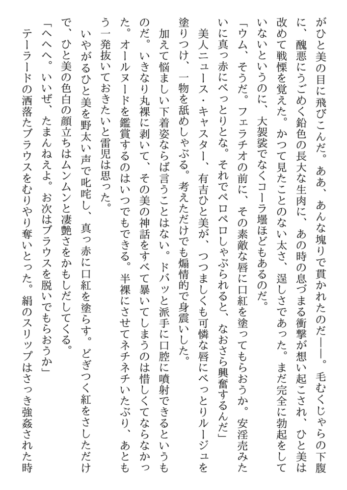 ついにやった! ひと美の身体を奪ってやった。日本中の男が憧れる美人キャスターの果肉を、貫きながら、獣はたおやかな乳房にむしゃぶりついた。知性美も、教養美も、気品美も、ひと美の女のすべてが、汚辱に震え、嬲られ、突かれ、地に堕ちていく。地獄の底でひと美は男の「隷獣」に化身する……