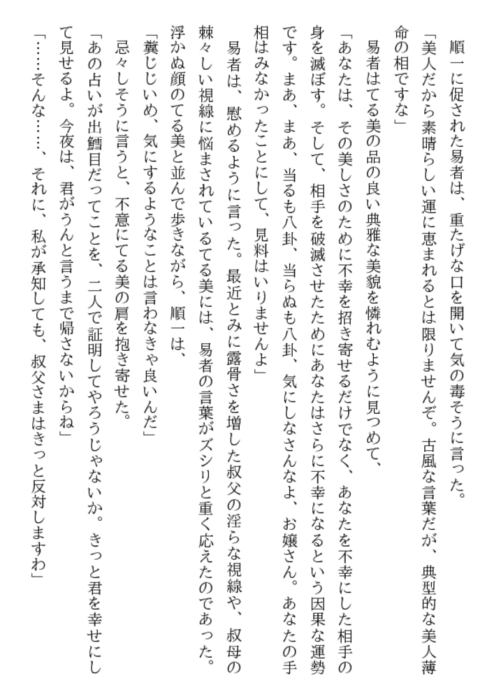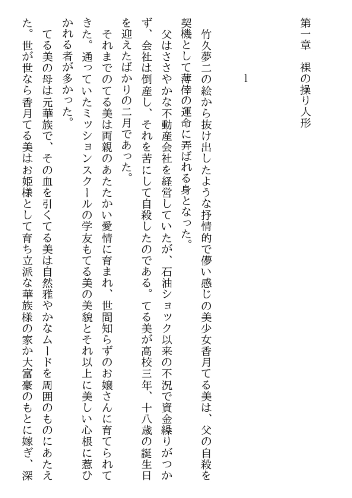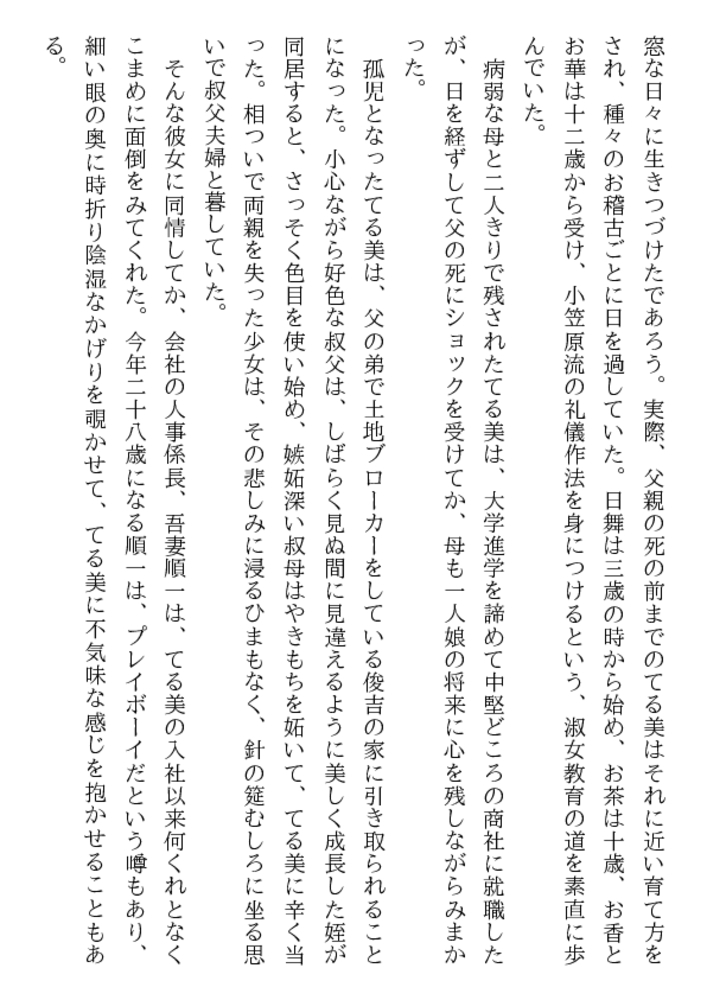 美貌ゆえに薄幸の運命に弄ばれる、てる美は19歳。 淑やかな肉体に魅せられた男たちの欲望が まぶしい雪白の若々しい肌を汚す。 朱い唇から目覚めはじめた愉悦の喘ぎが洩れるとき、 男たちの獣欲と肉器官が淫らにスパークする。 群がる男の淫戯に、19歳の人妻の裸身が痙攣する。
