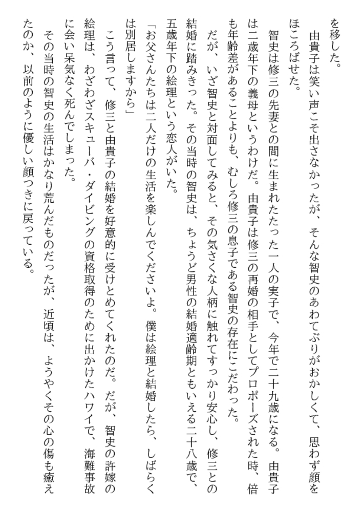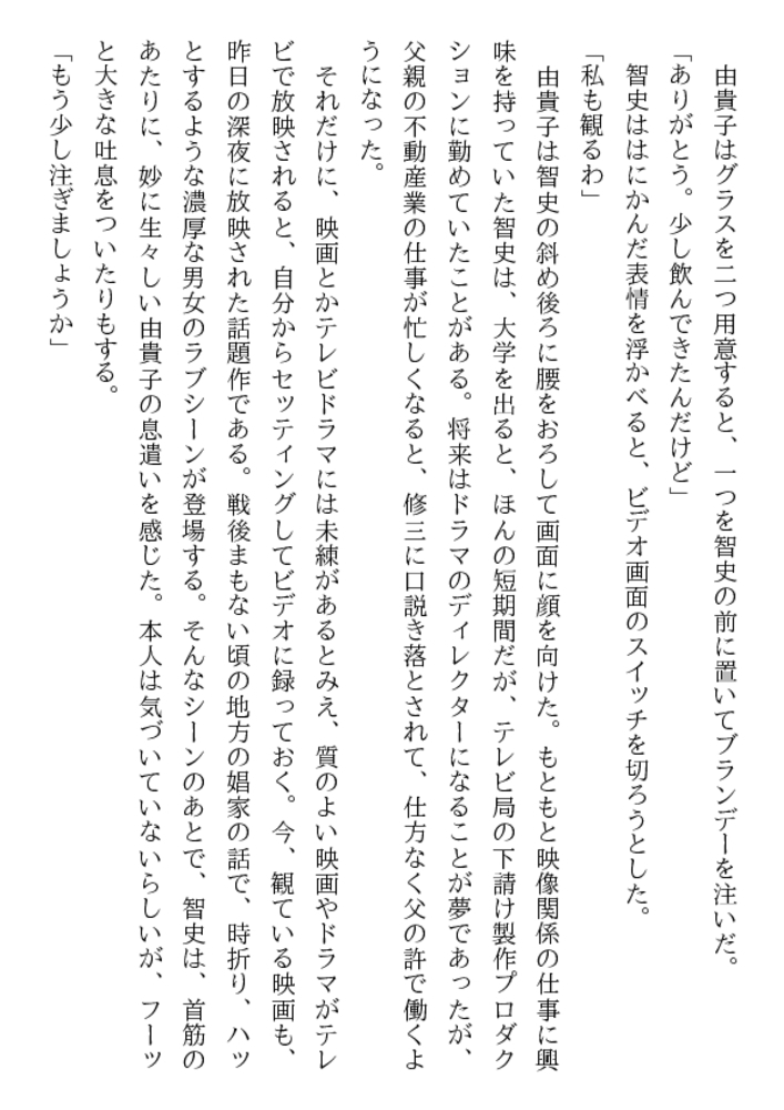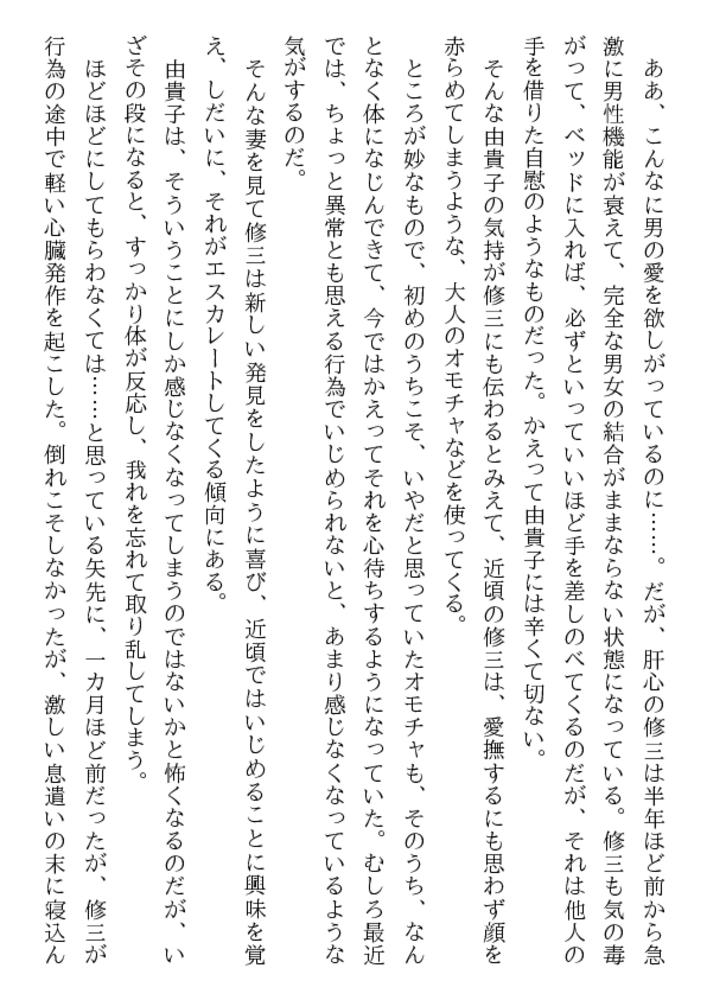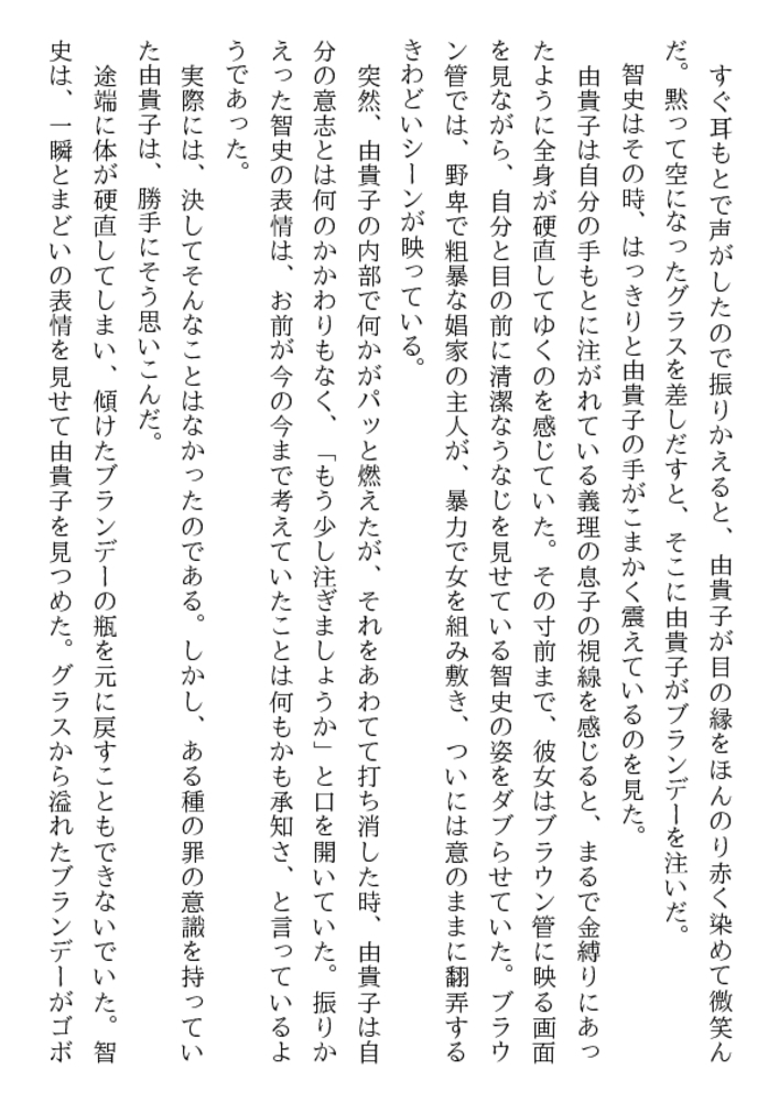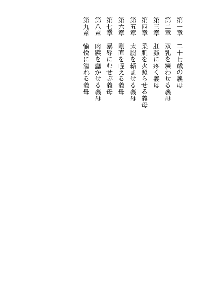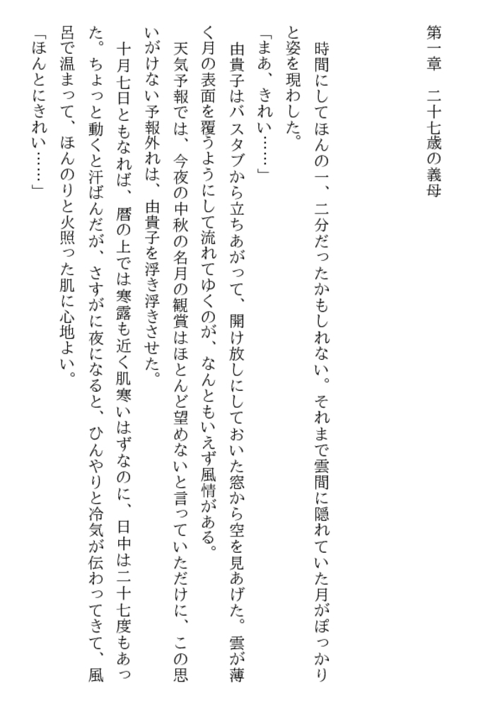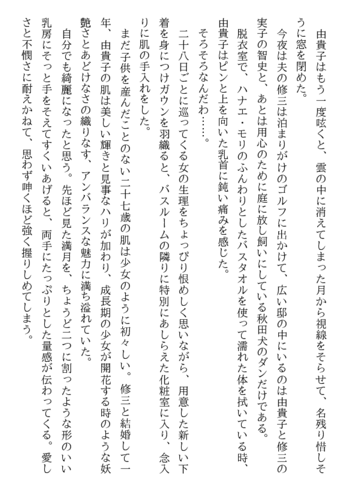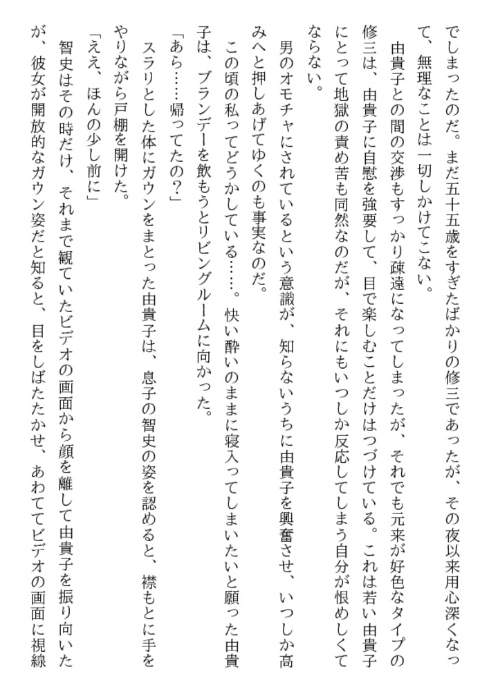 夫が眠るベッドの下で義理の息子との 性愛に溺れていく由貴子は27歳。 やめなくてはと思いつつも29歳の息子の 若く逞しい剛直を握りしめ頬擦りしてしまう。 雪白の肢体をのけぞらせ、抑えても…… 濡れた朱唇を割って、本能の喘ぎが洩れる。