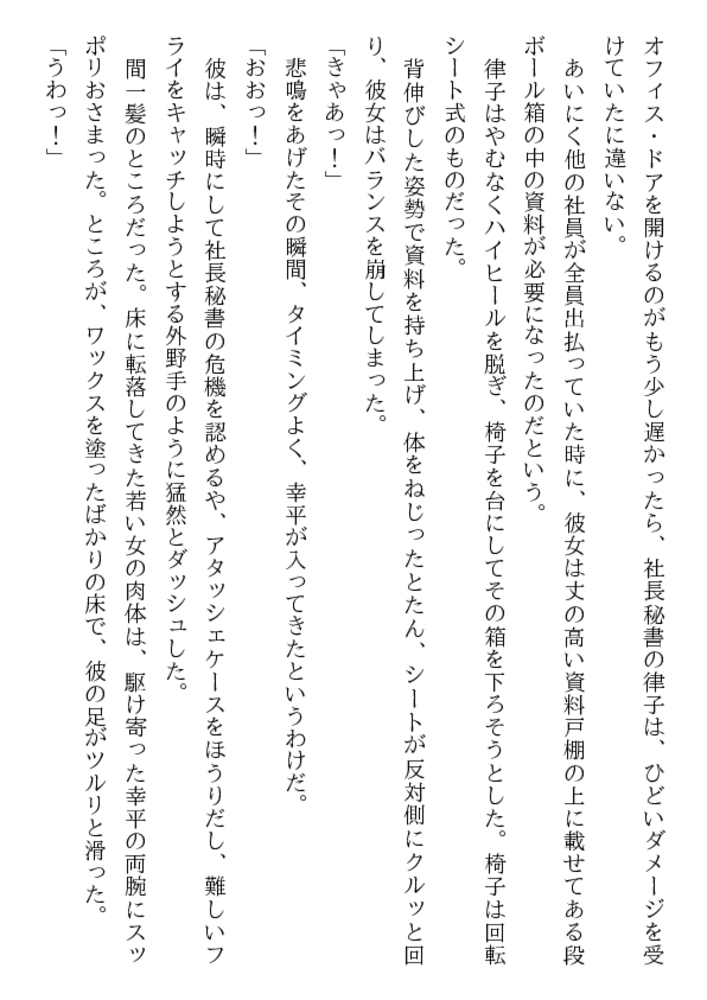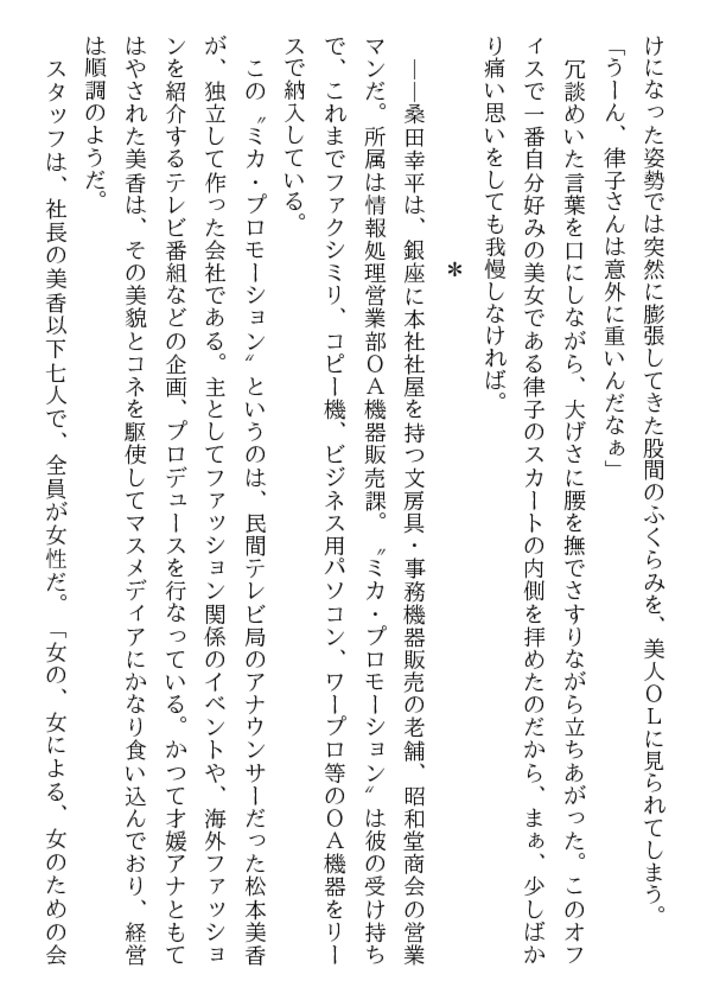 男を寄せつけずに来た29歳の美人社長、 松本美香の成熟した肉体が、暴漢の肉茎に 貫かれて一気に弾け、花蜜をほとばしらせる! 黒髪を振り乱し、汗まみれの裸身が震える。 凌○の限りを尽くされながらも、美人社長は 真の女の快楽を求めて脚を絡めていった……