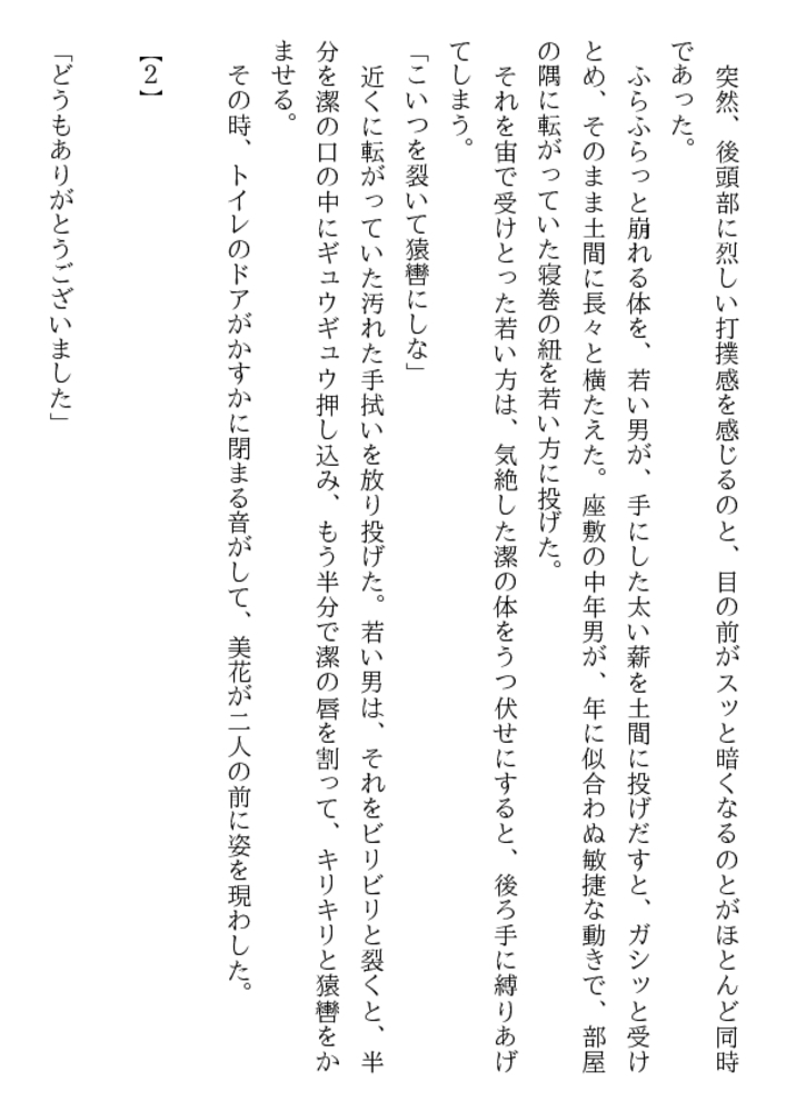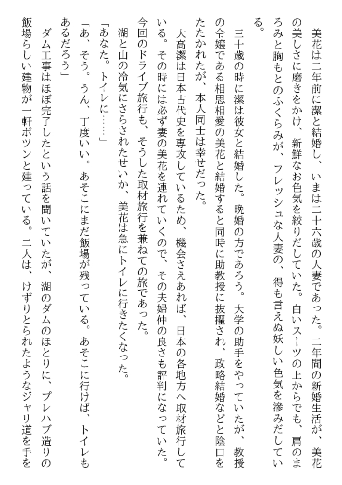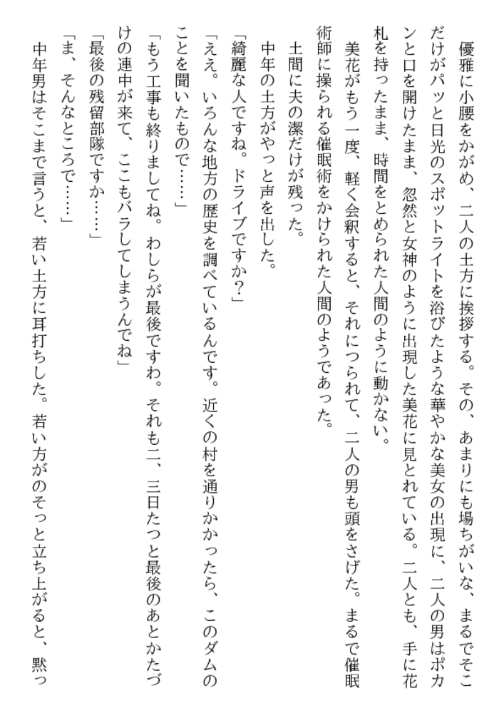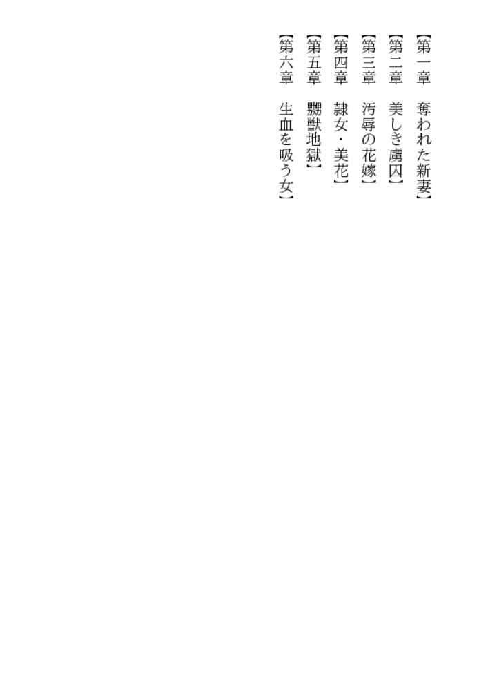 26歳の人妻とは思えない瑞々しさを湛えた花唇。いままで夫とどんな性生活を送ってきたんだ? 目映いばかりのウエディングドレスを剥かれた、美花はもはや牡に従う、麗しの奴○妻……「前の亭主のことなんか忘れて、悶え狂いな」新しい主人となった凌○者が、肉の楔を叩きこむ!
