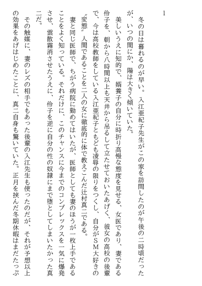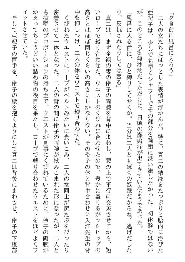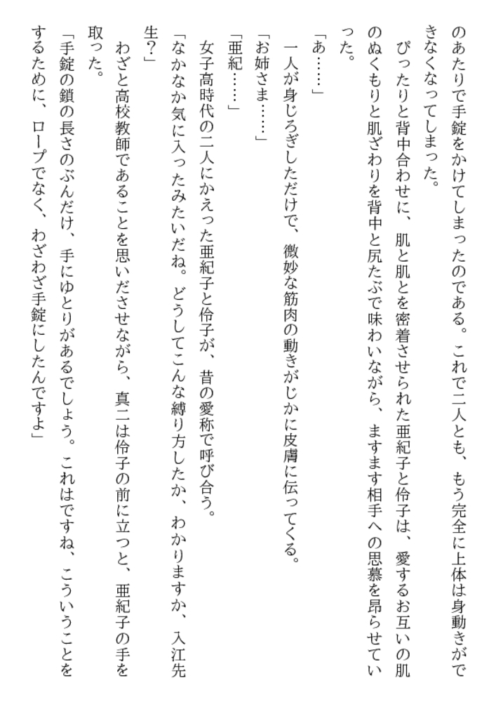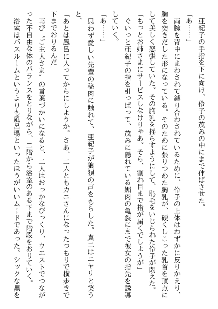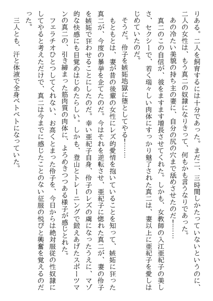大股開き、緊縛……ザクロのようにぱくりと晒された 女教師の割れ目を舌で抉り、愛液を啜る牡支配者! 傍らでは美しく知的で高慢な妻が、美体をよじらせている。 亜紀子も伶子も、肉悦が欲しがる牝獣に変えさせられていた。 いまや二人の美貌も類い希な知性も男のコンプレックスを、 逆転させる性奴のアクセサリーでしかない!