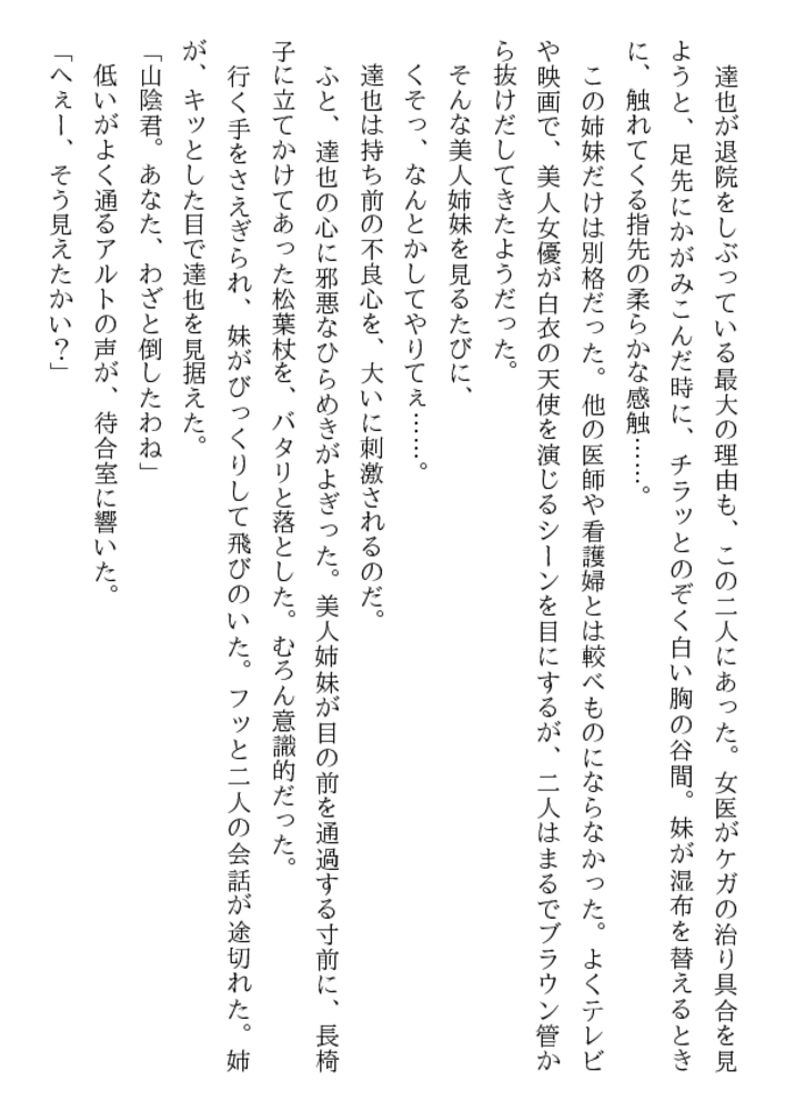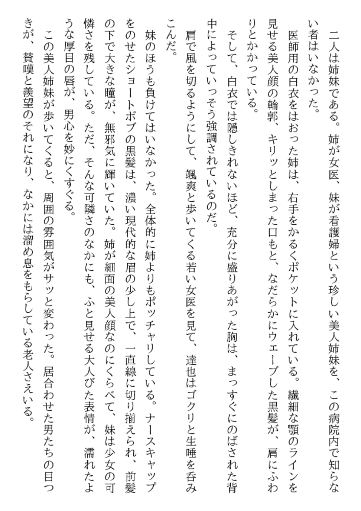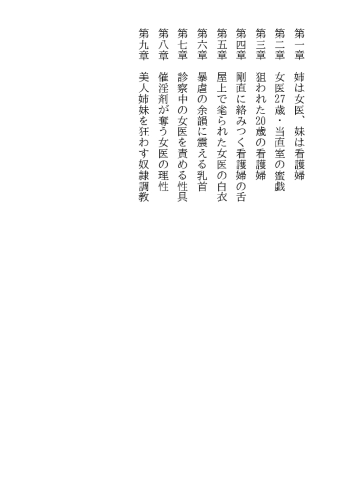 私立M病院、美貌の女医と看護婦・姉妹が、 理事長父子の卑劣な魔罠に陥れられた! 巡回中を襲われ、口辱奉仕を強○される沙知。 アヌス輪○の屈辱に双殿を震わせる美江。 汚れを知らなかった女医と看護婦をいたぶる、 おぞましい病院内麗肉調教は終わらない!