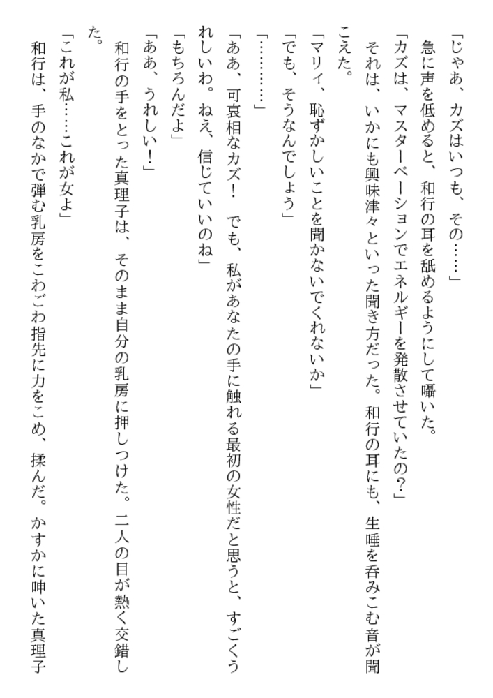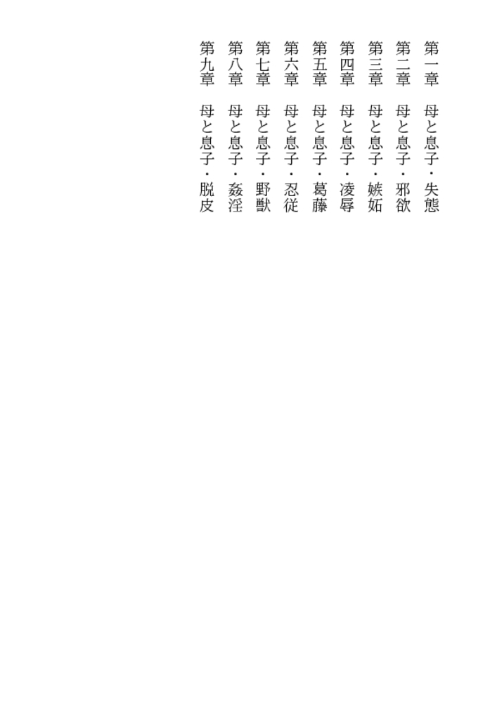 日ごとに男臭くなる我が子に、めまいする母。 若さを失わず艶めかしさを増す母に、昂る息子。 空閨と青い獣欲に懊悩する二人が数カ月ぶりに 再会したとき、母子の関係は崩れかけていた。 その夜、母の寝室では理性を忘れた獣の肉宴が……