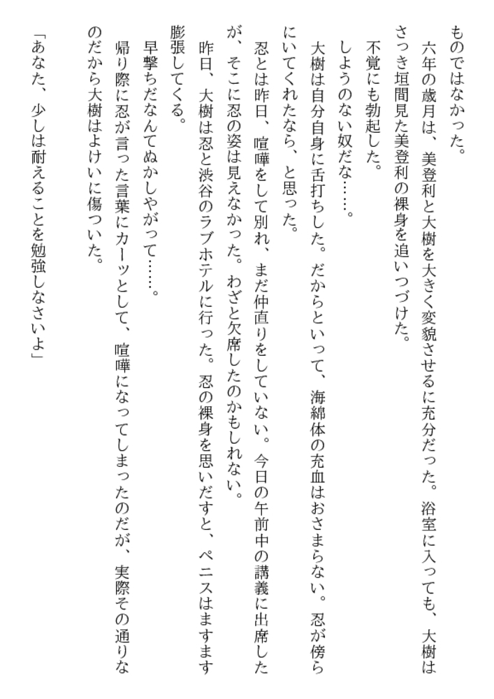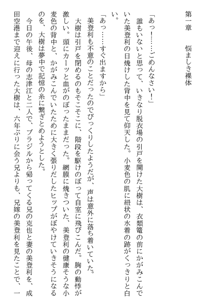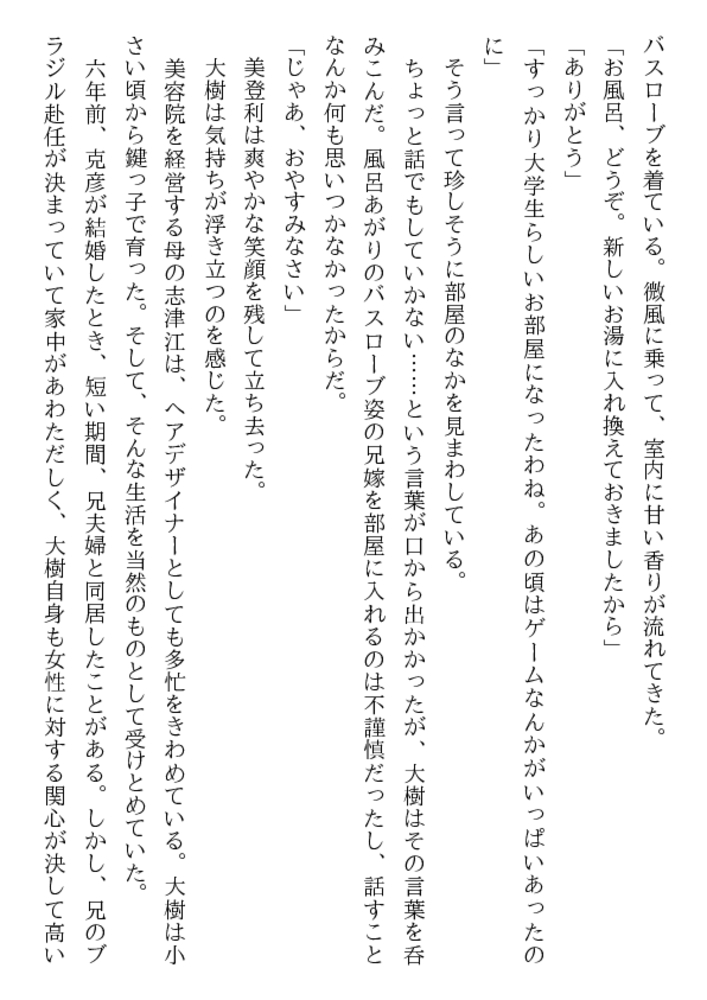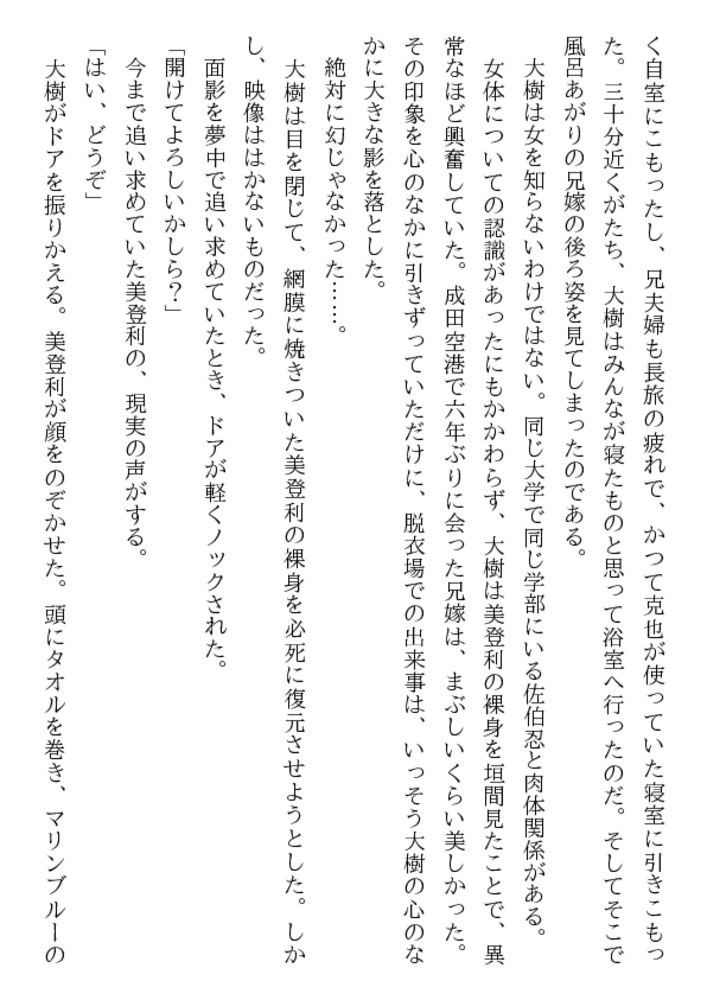 六年ぶりに再会した兄嫁の美しさに、大樹は狂わされた。 姦りたい! 美登利さんをぼくの女にしたい!…… 執念ともいえる青い欲望が、遂に実を結ぶ時がきた。 家族旅行の最中、兄が急用で帰京したのだ。 兄嫁が眠る部屋に忍びこんだ大樹の分身は、 熱く柔らかく優しい果肉を思い、猛り立っていた……。