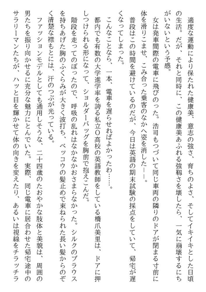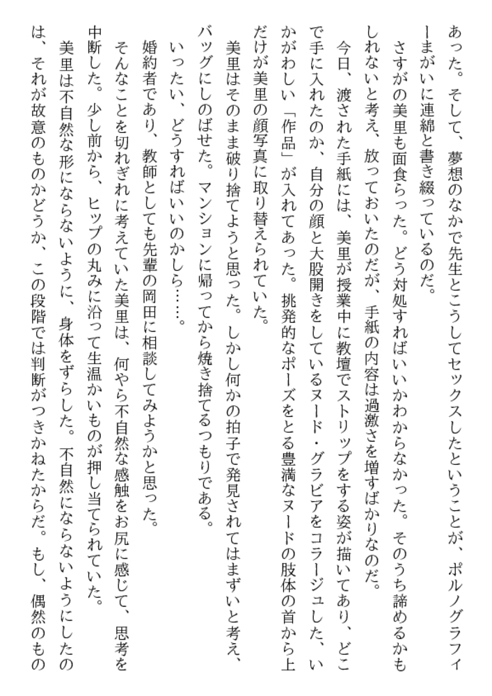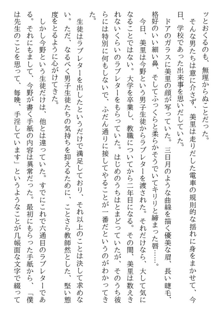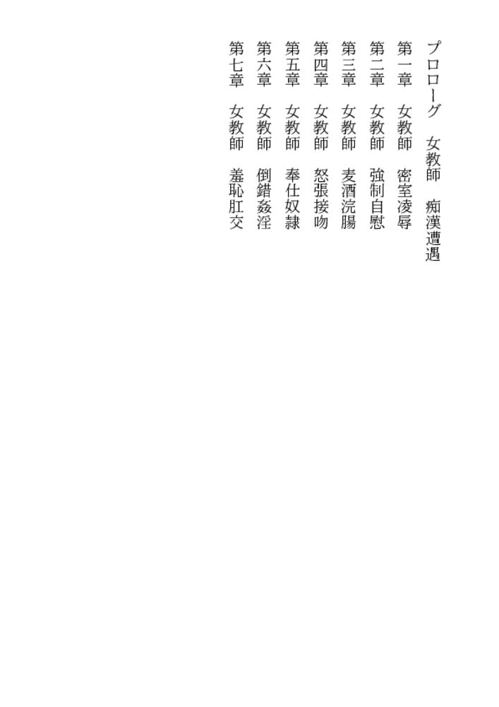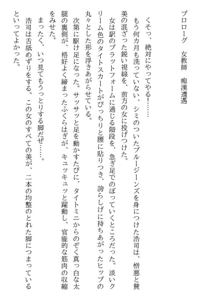 犯ってやる! 先生のプライドをブチ壊してやる! 高校を停学させられた復讐の念に燃える浩司の思いが、 やっと晴らされる時期が来た!…… 場所は女教師・美里が住むマンションの一室。 部屋に忍びこみ、緊縛した女体を朝まで貪るべく、 浩司は凌○のシナリオ通り、華麗な下着を引き裂いた!