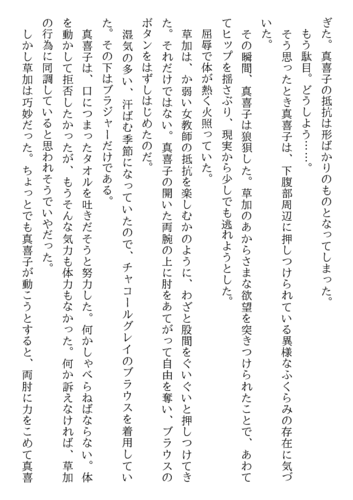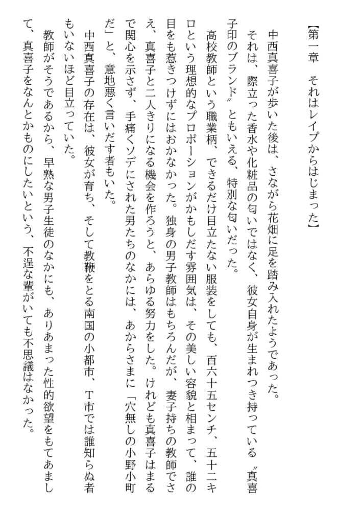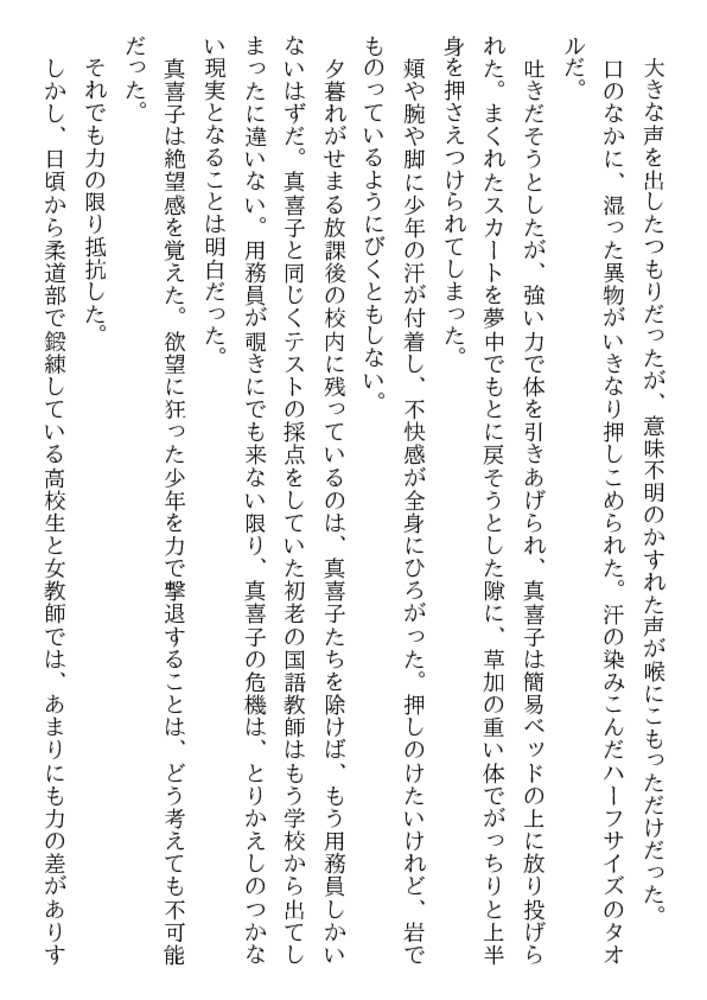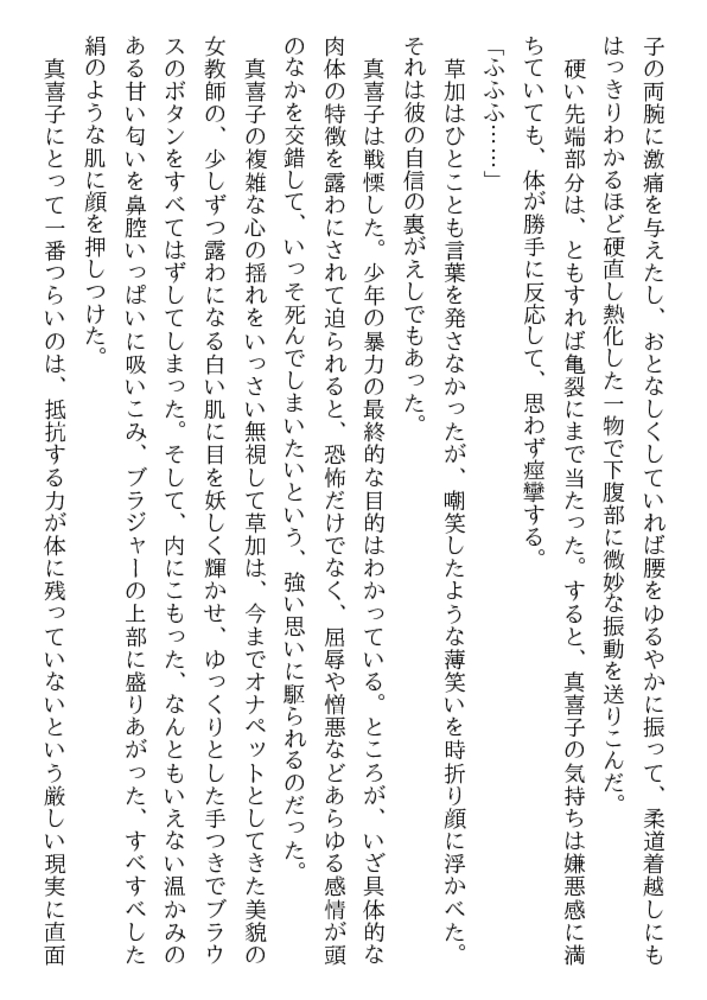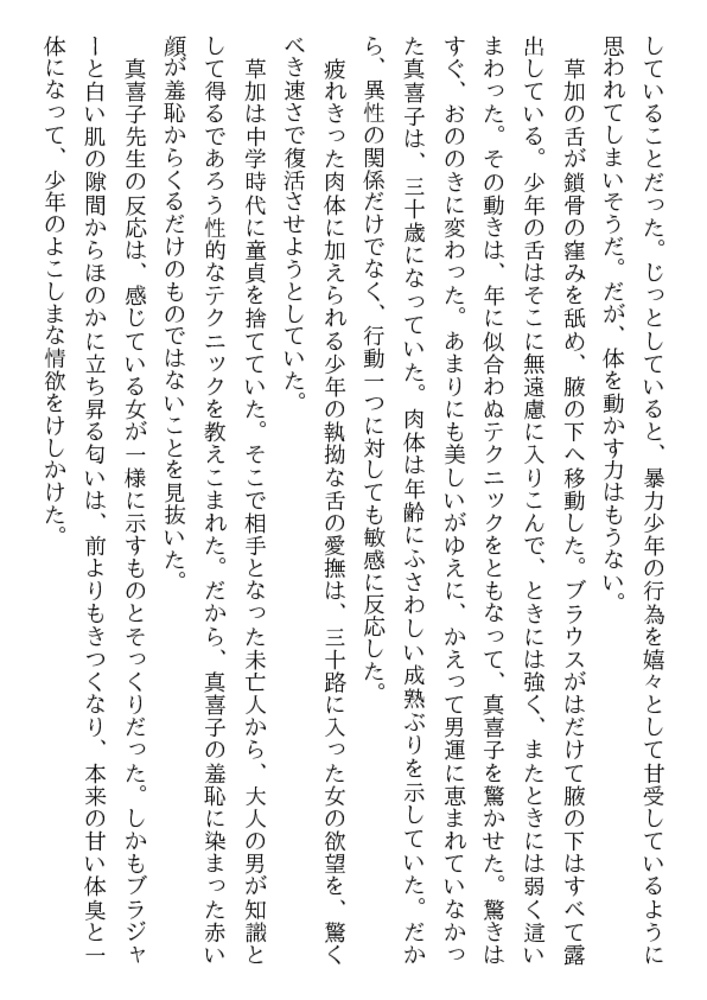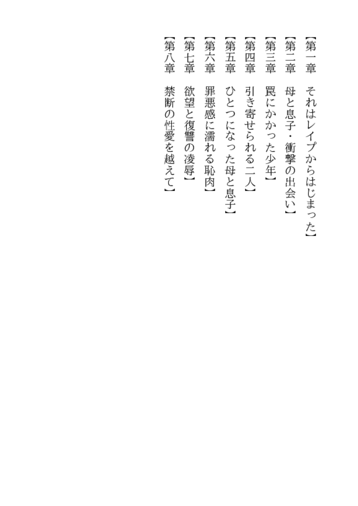 「先生が好きだ、抱きたいんだ!」 少年の熱い訴えを、真喜子は拒みきれなかった。熟れた淫肉を若く猛々しい剛直に荒々しく貫かれ、33歳の女体は熱い愛蜜をしとどに滴らせはじめる。許されざる性愛に狂う二人はまだ知らない、母と子という禁忌をも越えてしまったことを!
