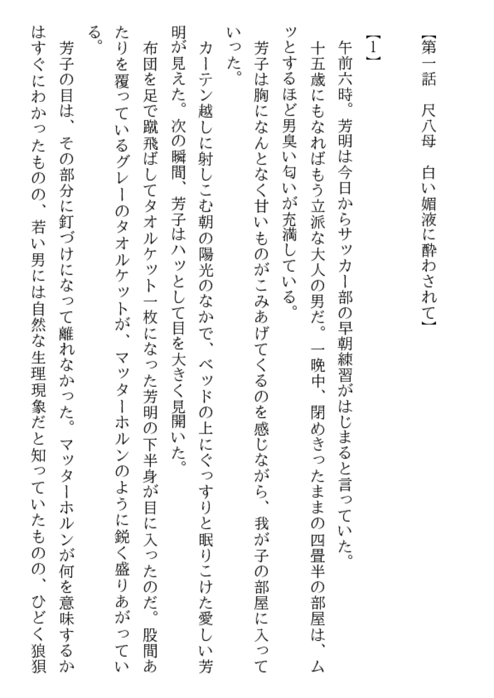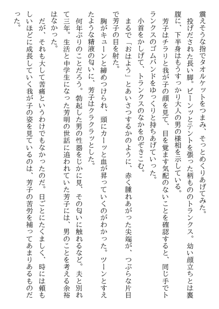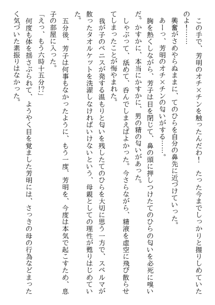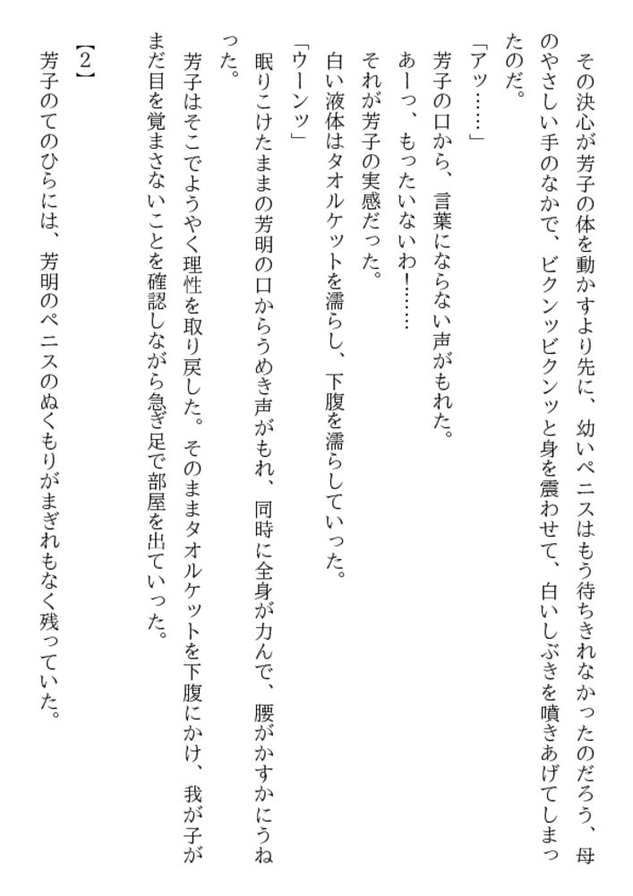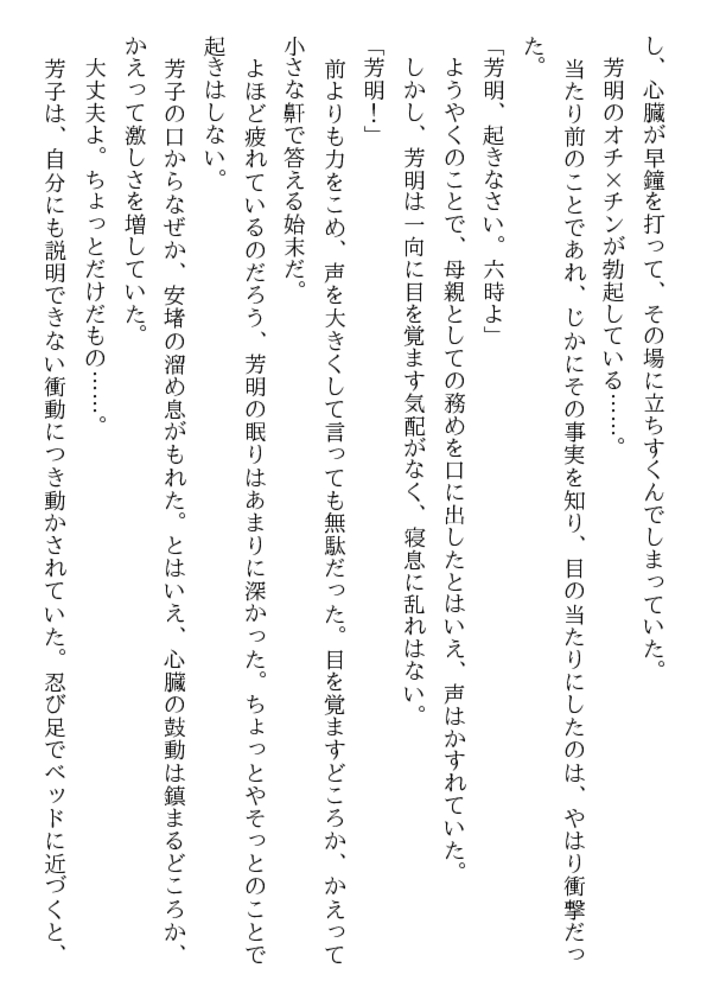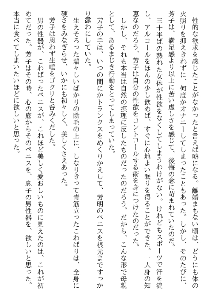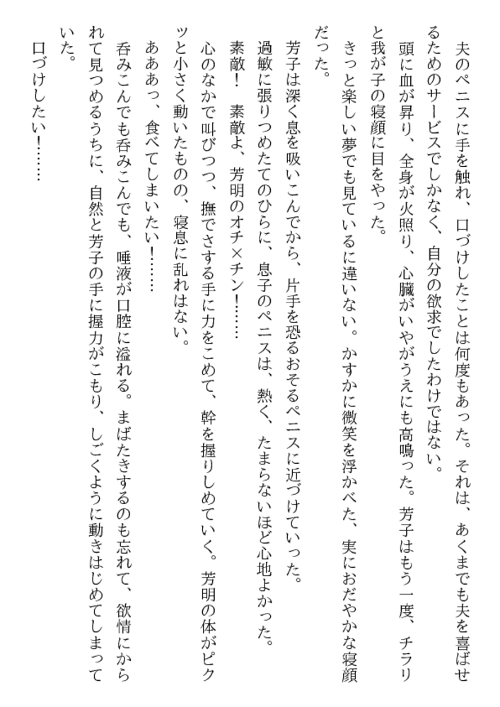 私は淫らな母親、欲望に惑わされては駄目……。 自分を戒めても、息子の一物を見ると抑えられない。 眠った我が子の股間にうずくまり、 愛しき肉棒をそっと舐め味わい、咥えてしまう。 芳明に気づかれているとも知らず、 舌戯に耽る芳子に、「決心」の時が迫っていた。