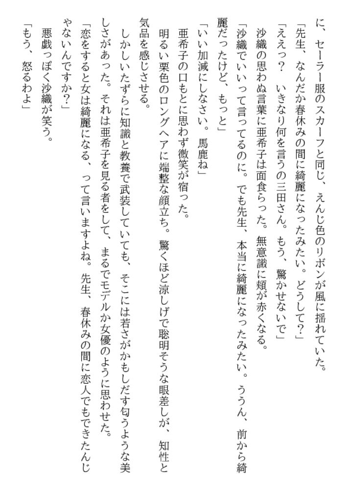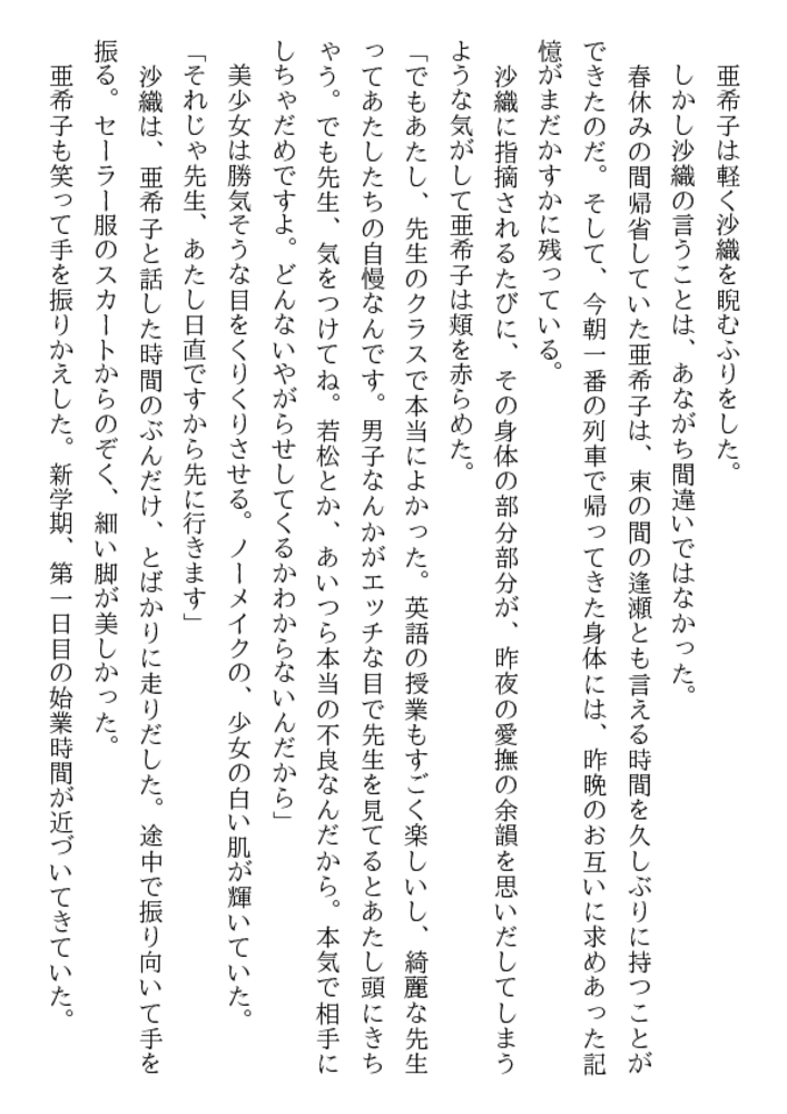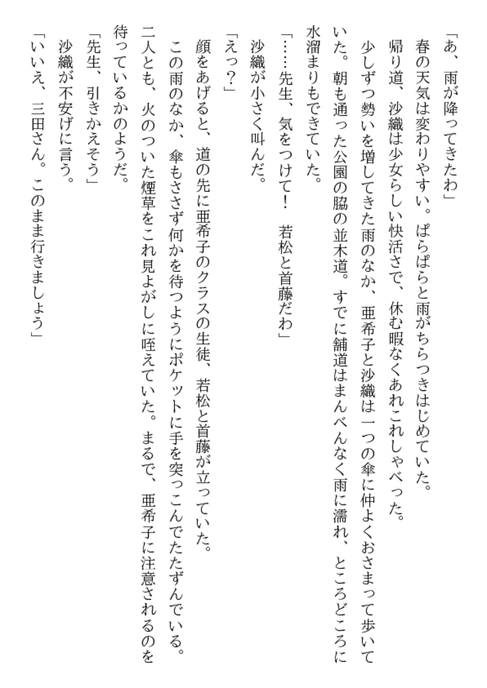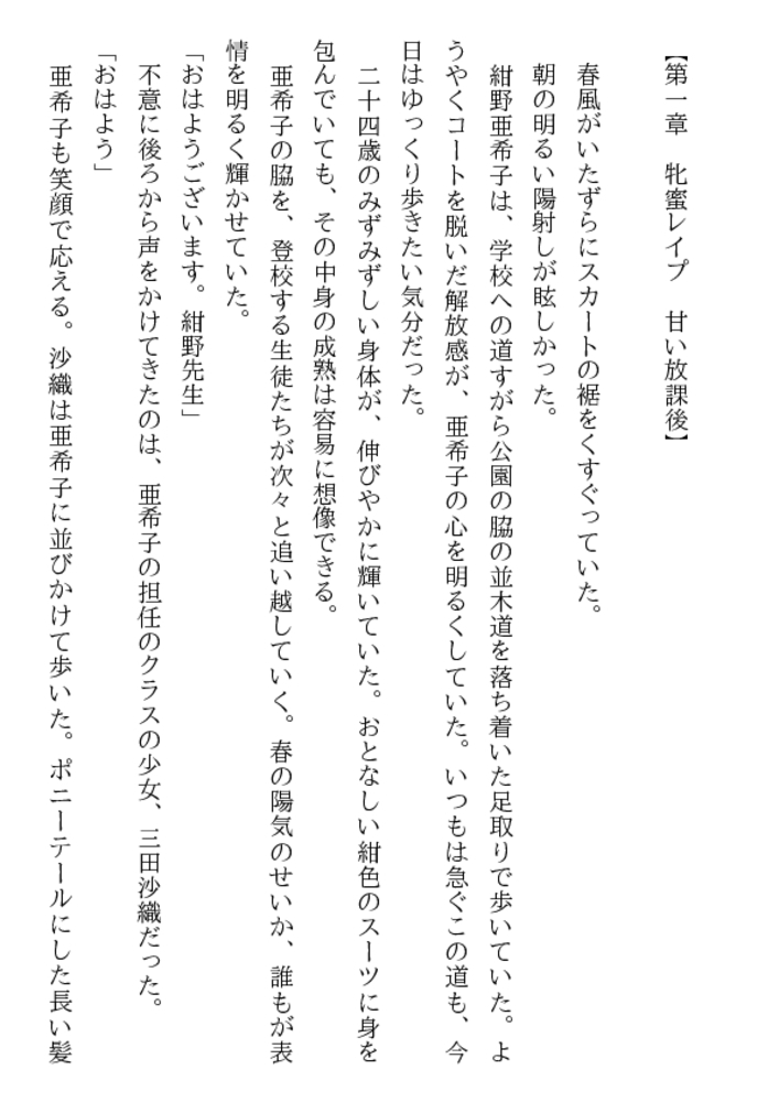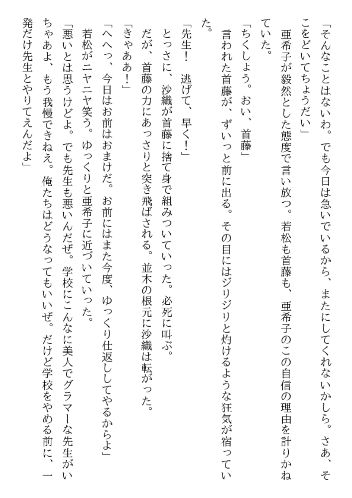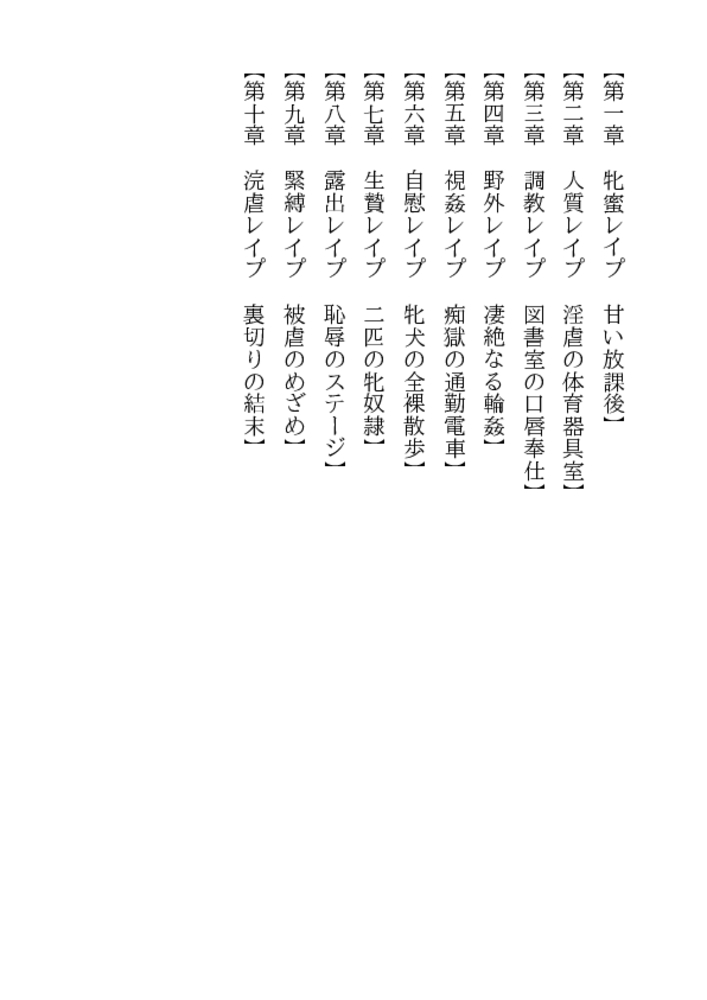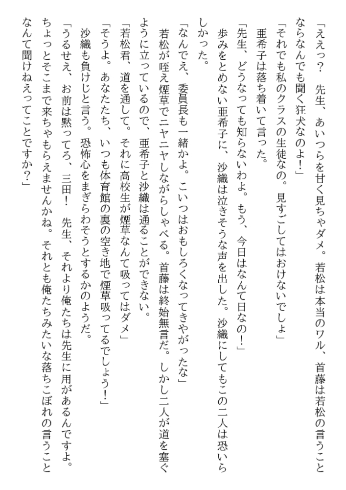 放課後の体育器具室。囚われた女生徒を救うため、亜希子は教え子たちの玩嬲に裸身をゆだねた。「先生、輪○される悦びを強烈に教えてやるぜ!」三本の猛々しい剛直が襲う凄惨な凌○の嵐のなか、牝辱の妖しい愉悦に目覚めていく二十四歳の官能。エスカレートする弄虐。学園はレ○プ教室と化した!