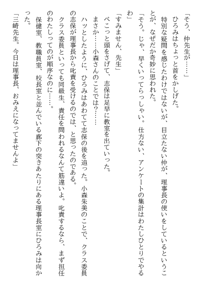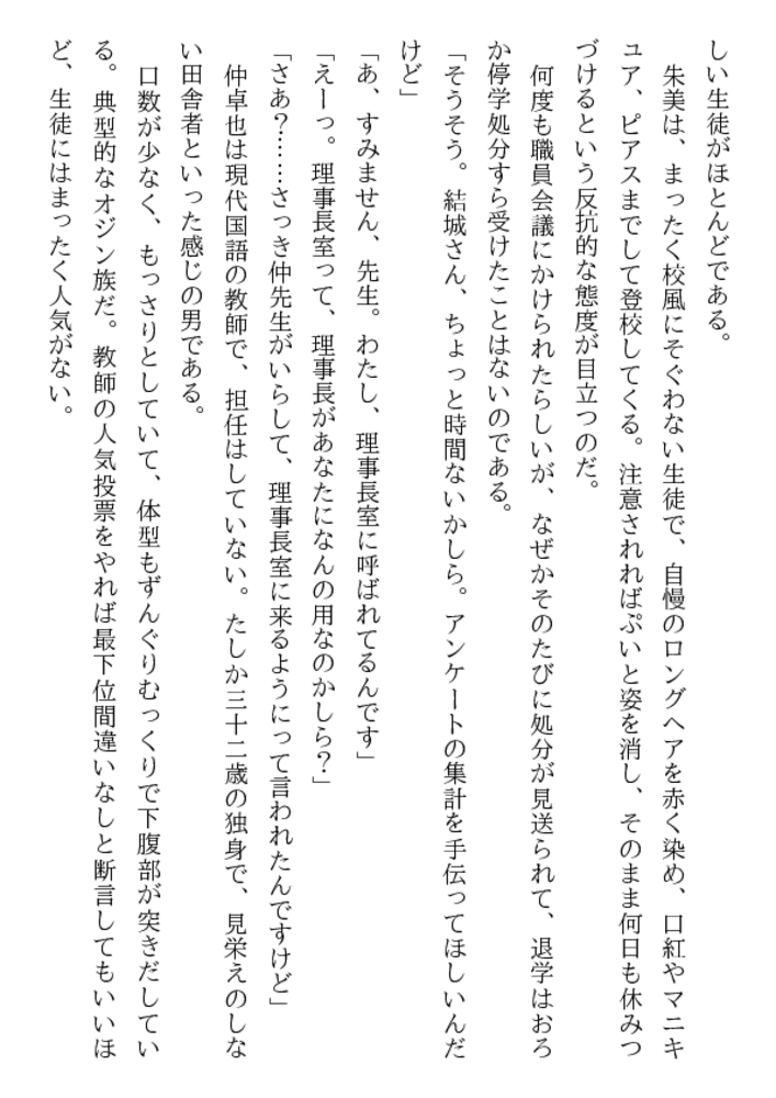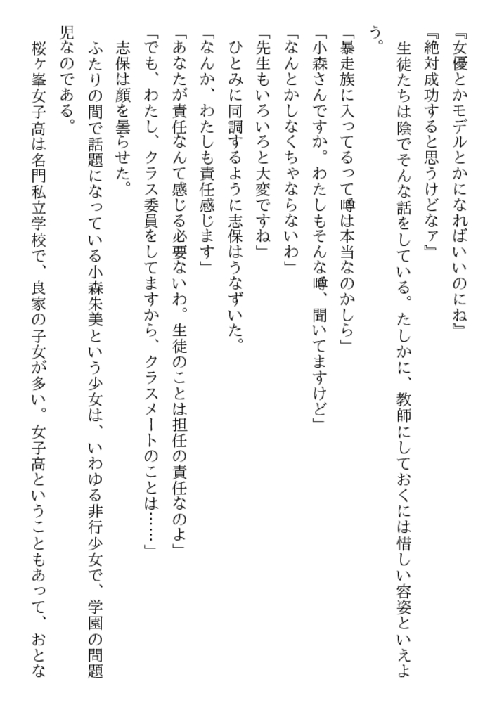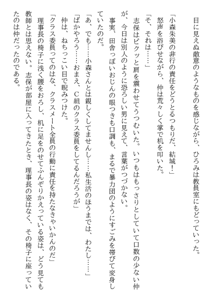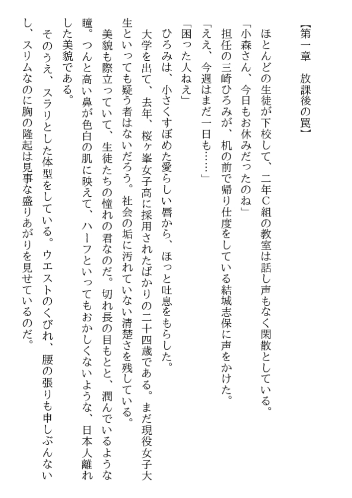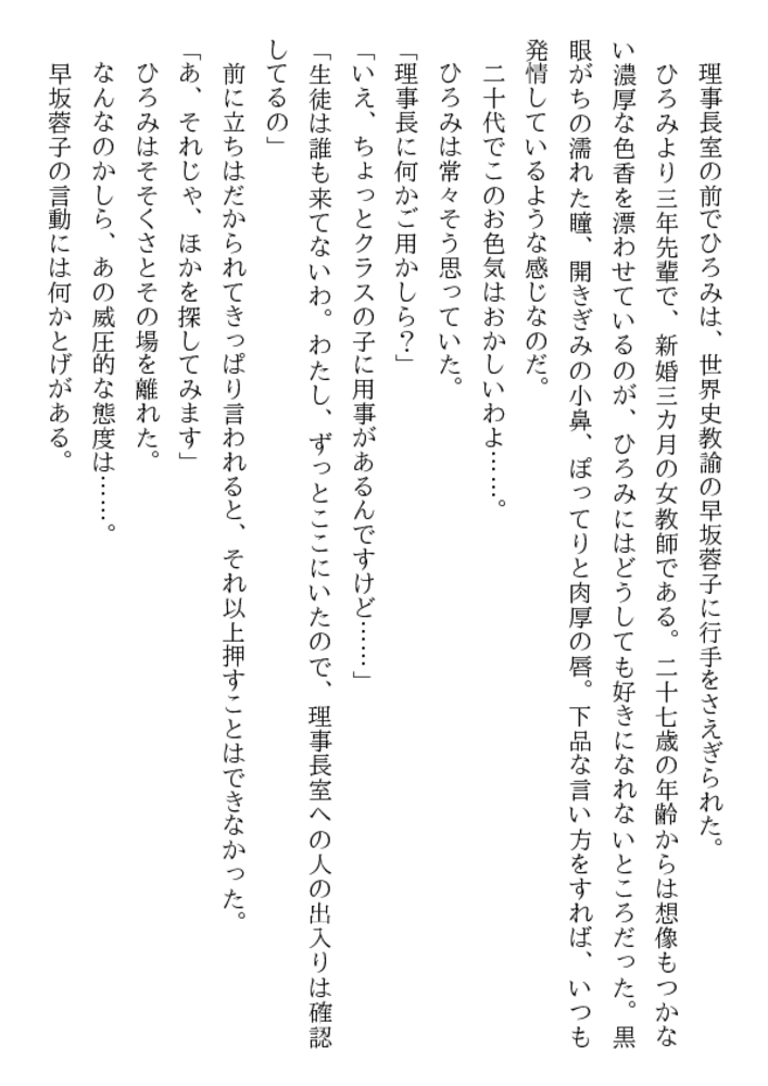 まるで解剖するように着衣が剥かれ、二十四歳の瑞々しい裸身が露わにされる。女教師ひろみを狙う同僚教師の肉具は、眠っていた官能を狂わせずにはおかない。そんな……だめよ、レ○プで感じるなんて! だが媚液の湧出はもはやとめようがなかった。