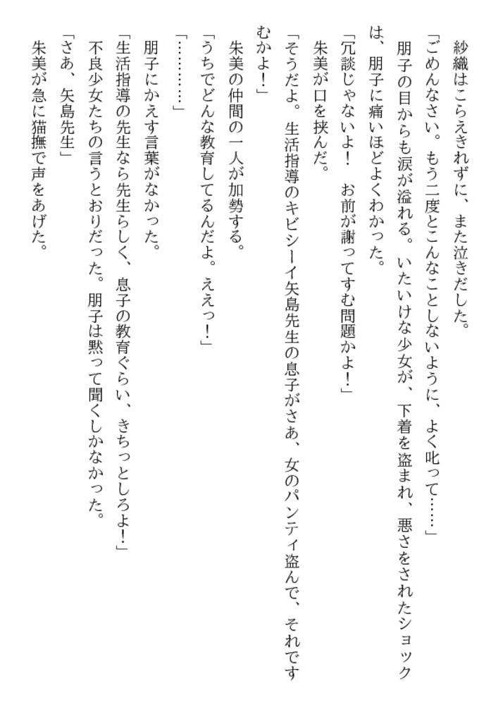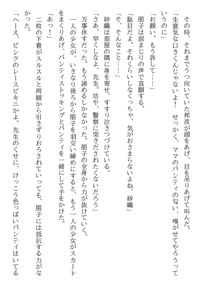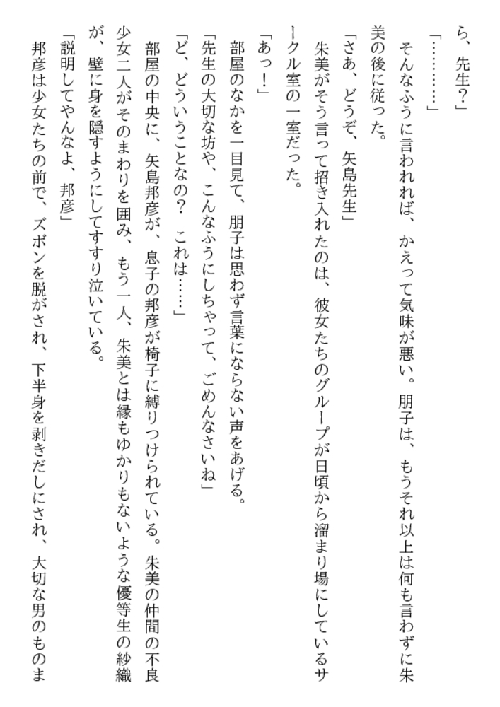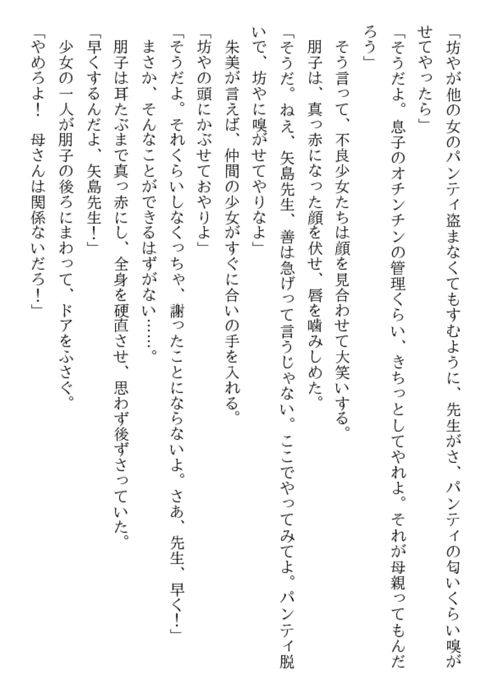 女教師と生徒が、ましてや母と息子が、 全裸でお互いの性器を貪り合ってはいけないの…… わかっていても朋子の身体は肉欲に支配されている。 放課後のトイレで、部屋で、寝室で、 我が子の剛直を咥え舐め、迎え入れる。 鬼頭龍一が放つ倒錯母子相姦の金字塔!