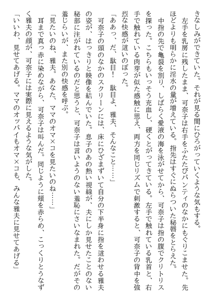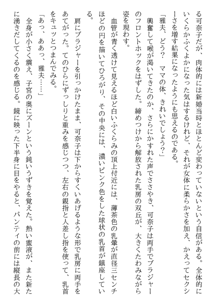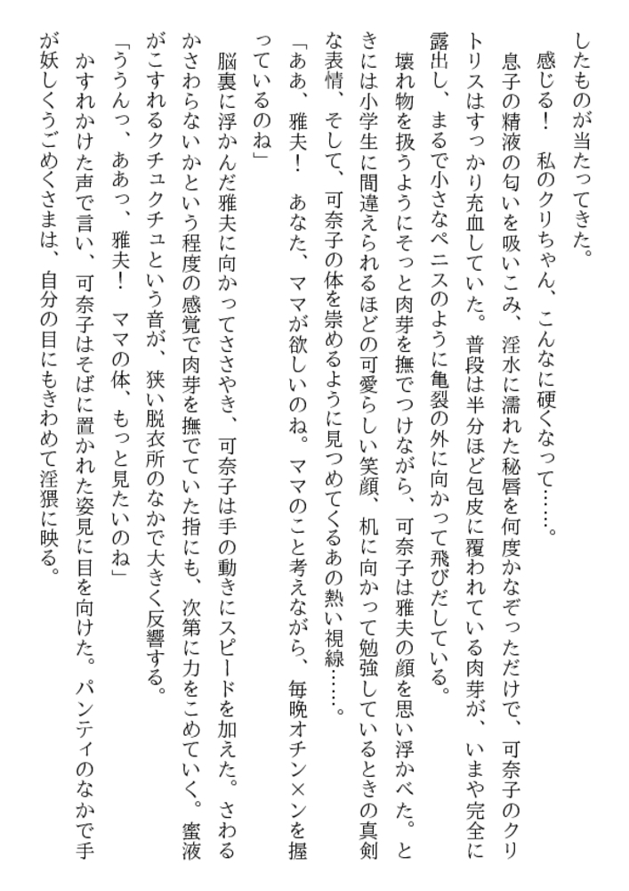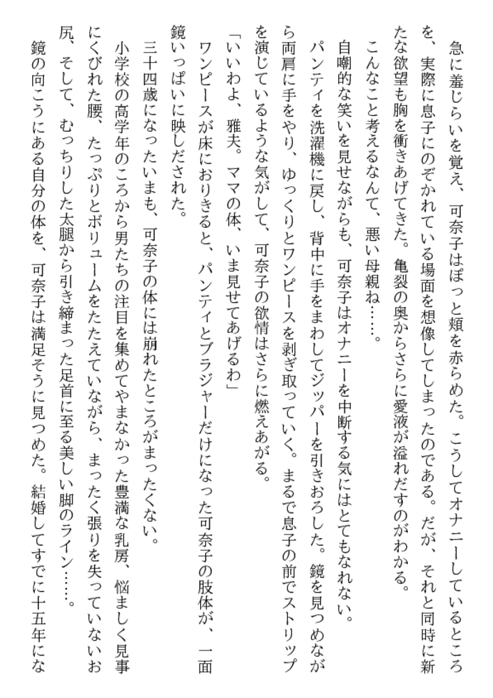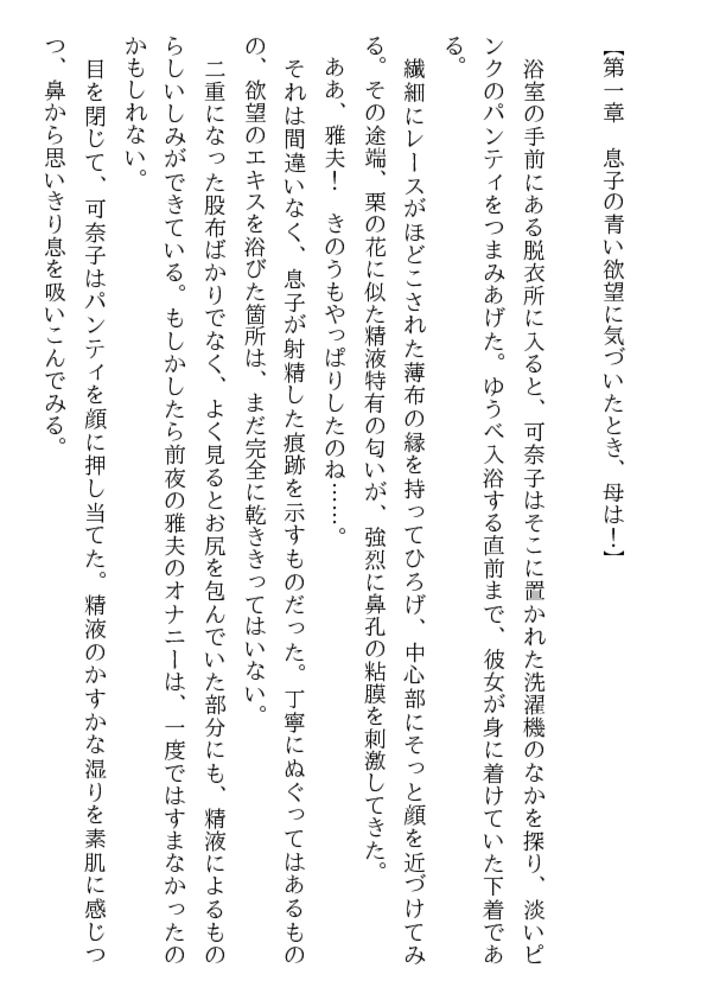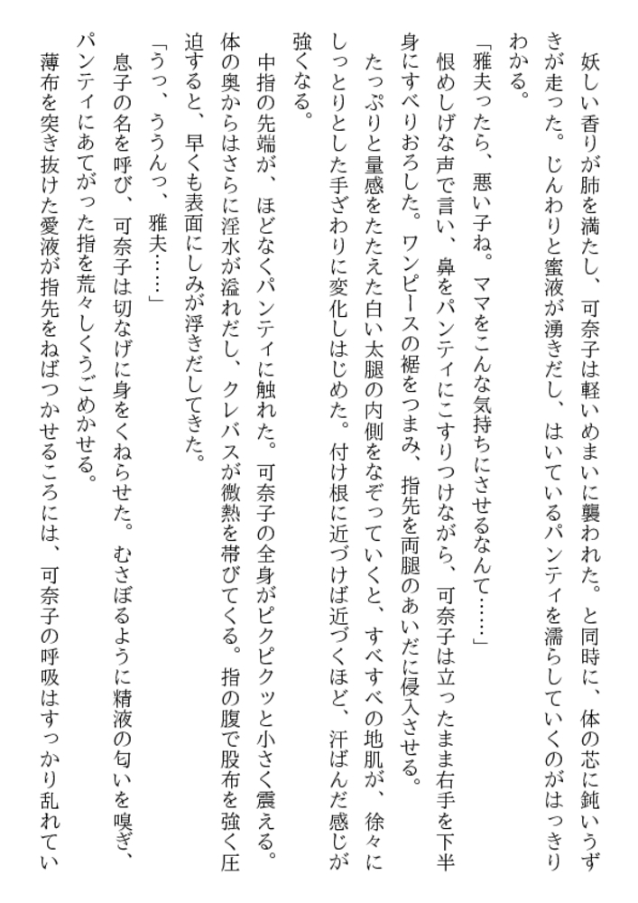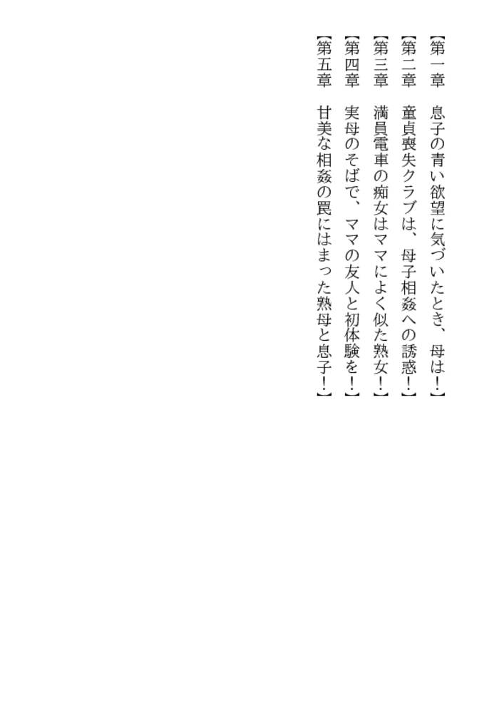 可奈子のパンティの濡れ染みは、雅夫の青い欲望が、母の熟れきった女体に向けられている証だった。樹液の強烈な牡臭が可奈子の理性を狂わせる。あの子に抱かれたい、あの子の童貞を奪いたい……。可奈子からの悩みの相談を受けた親友の真紀は、息子の隆之とともにダブル母子相姦の計画を練った!