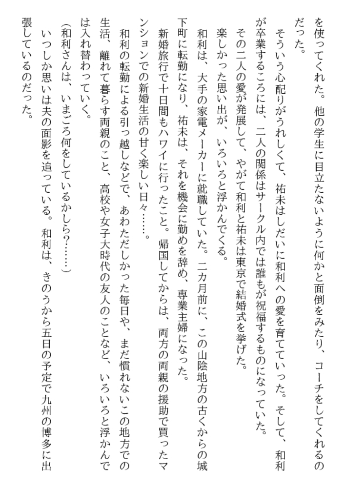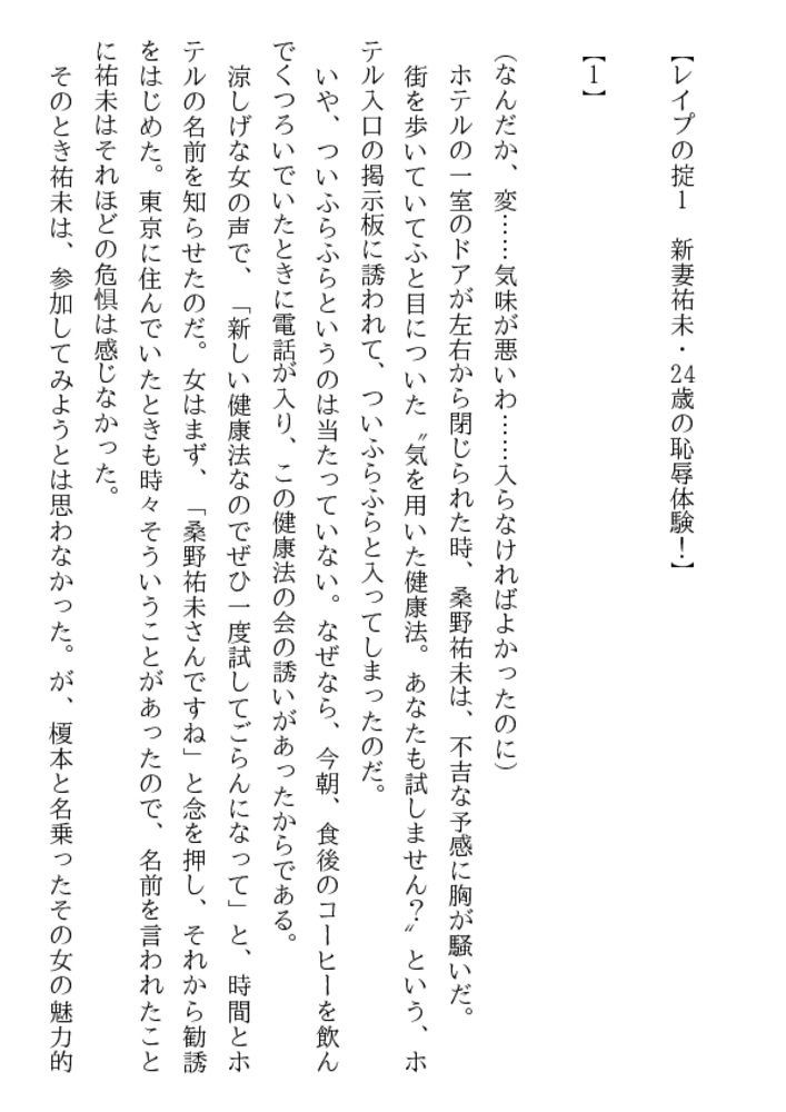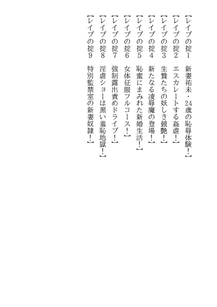 女を徹底的に嬲り抜きつつ、めくるめく恥辱と被虐の エクスタシーを味わわせる!――それがレ○プの掟だ。 新婚まもない24歳の若妻・祐未を襲った凌○鬼は、 夫とでは得られない妖しく激しい愉悦をもたらした。 屈辱に打ち震える裸身がやがて甘美にわななきだし、 肉の剛直で荒々しく蹂躙される淫裂に恥汁が溢れる!