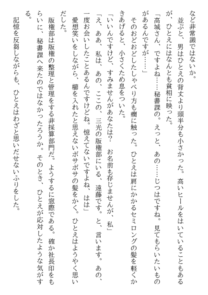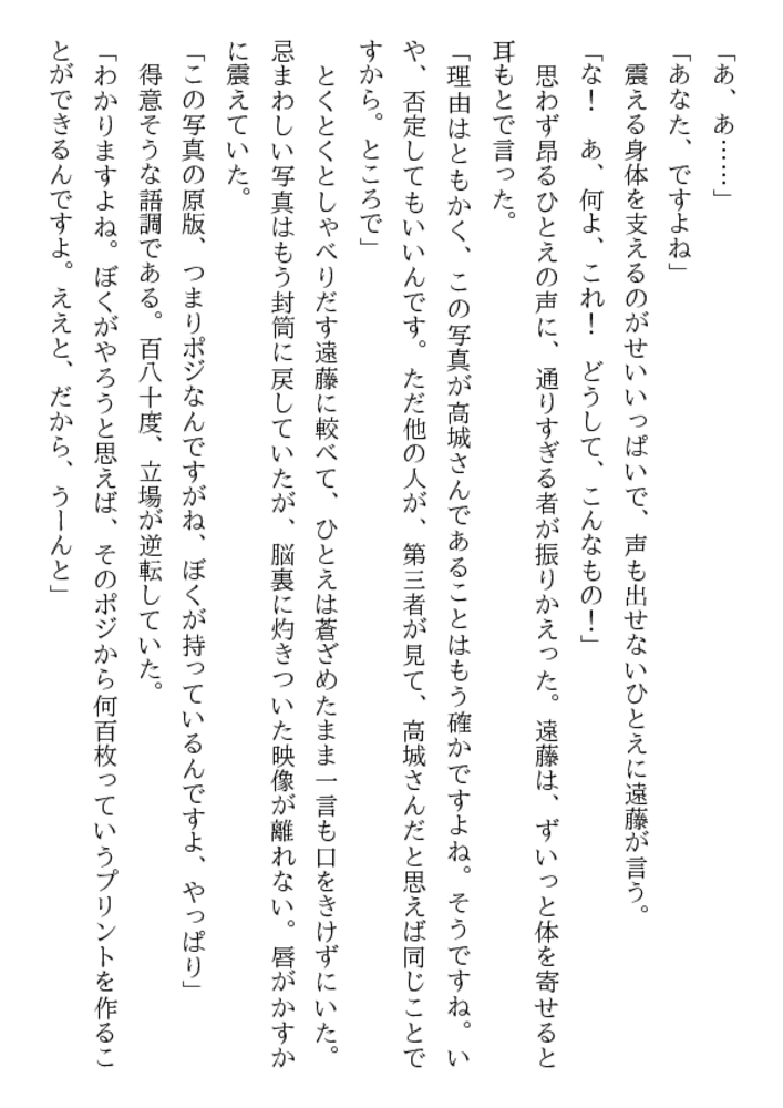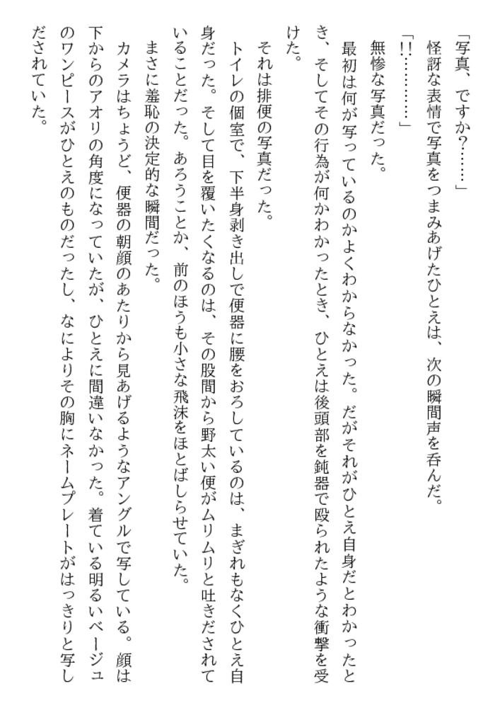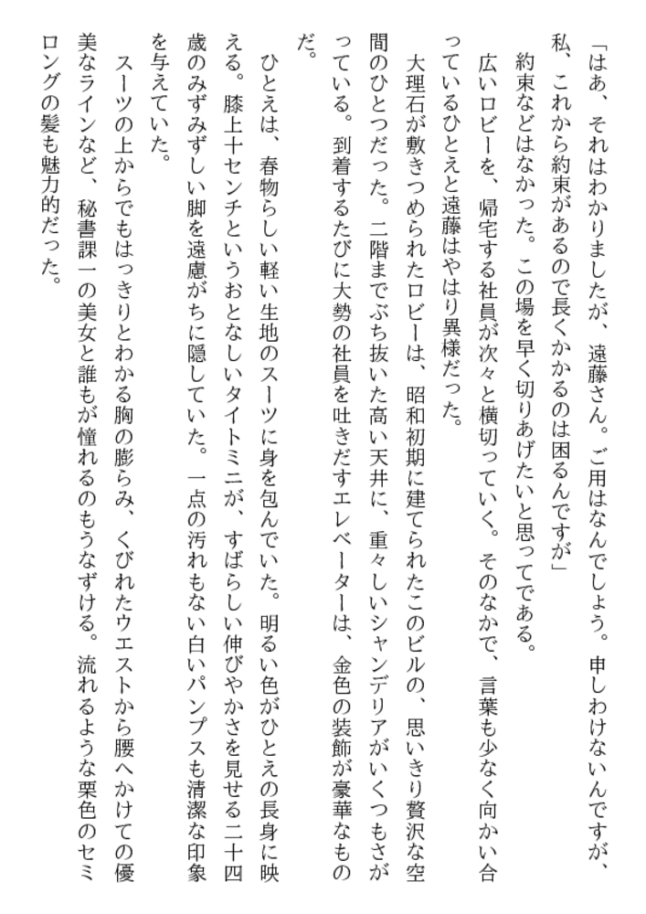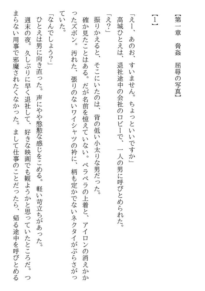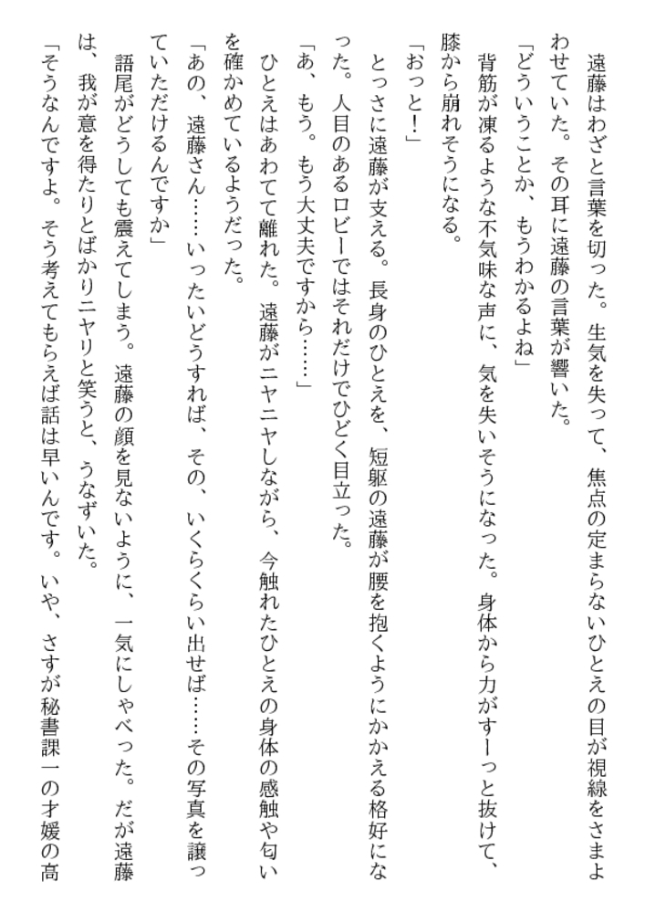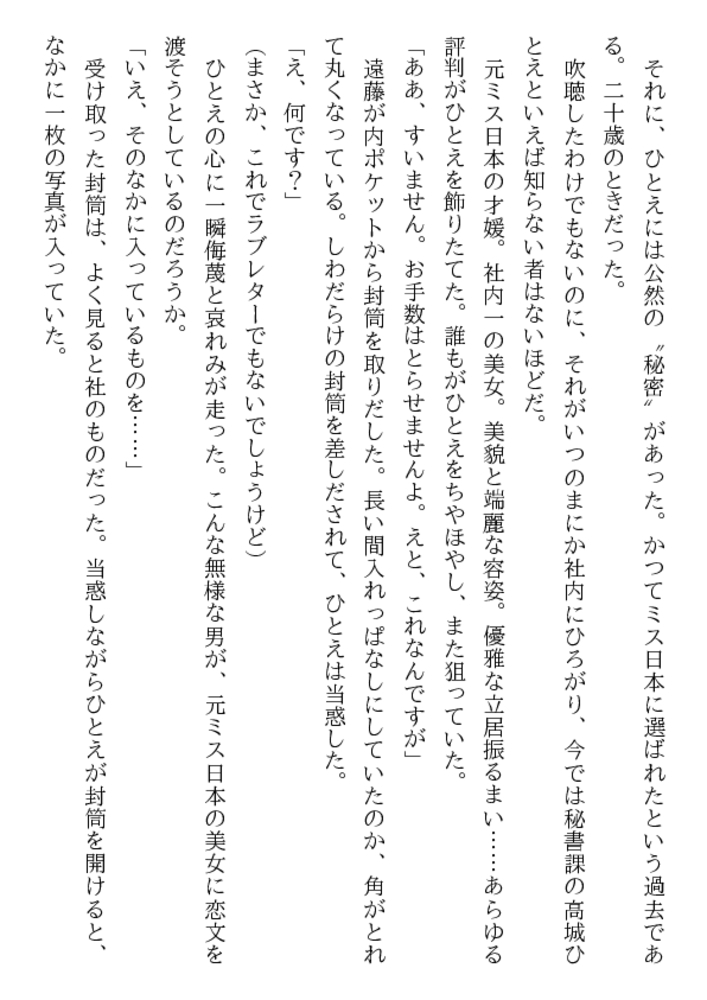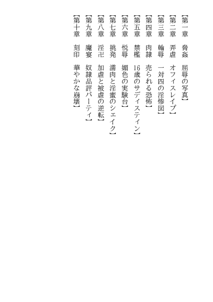 高城ひとえ24歳。知的な美貌と端麗な容姿、優雅な立ち居振るまい……社内随一の美女を狙って、屈折した窓際社員が卑劣な罠をしかけた! 牡の玩弄物に堕ちた美人秘書に繰りだされる露出責め、緊縛、口辱奉仕、浣腸、輪○……。魔辱と恥虐の波状淫撃が、ひとえを牝に変える!