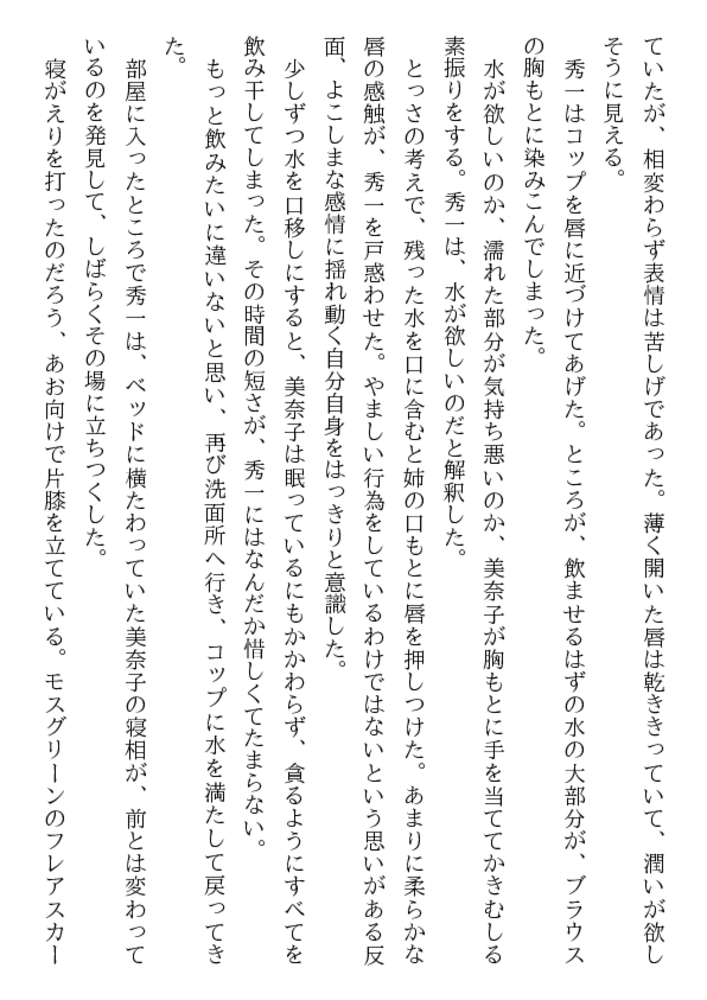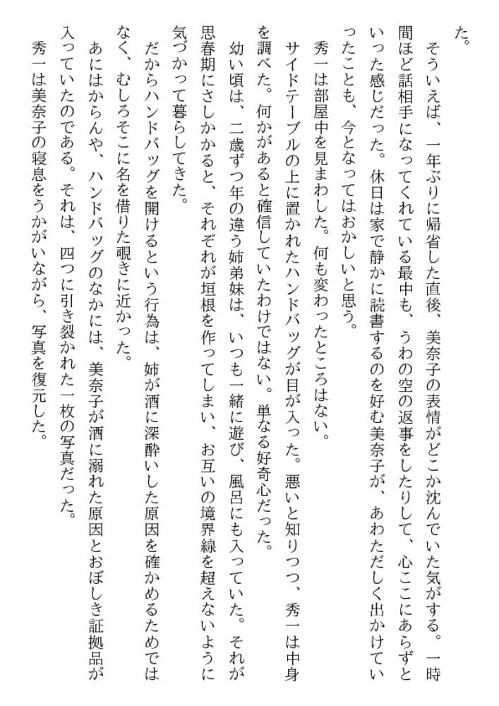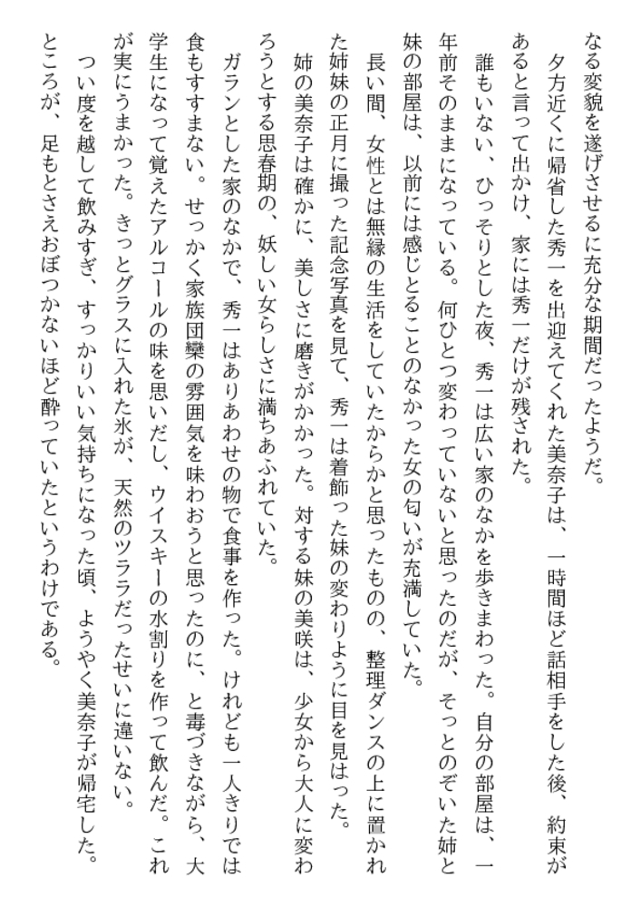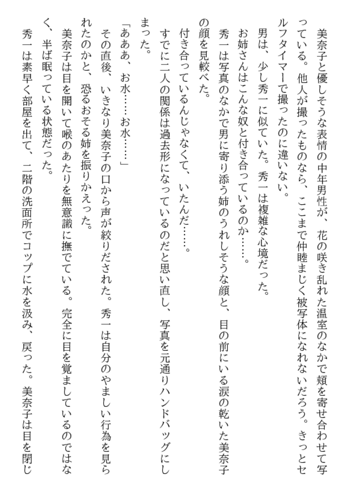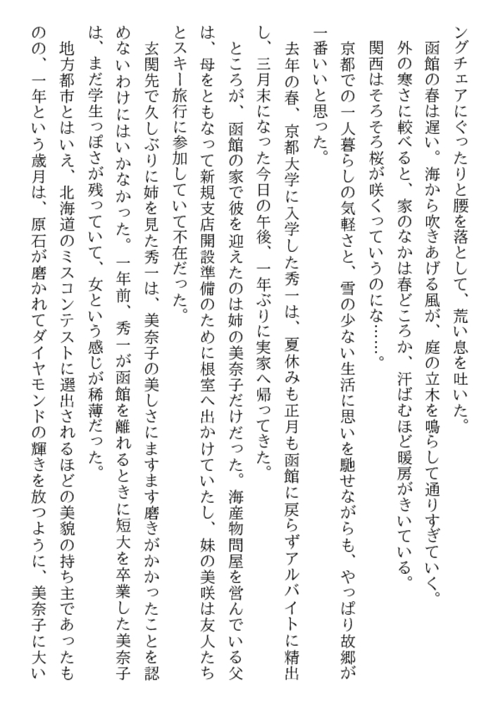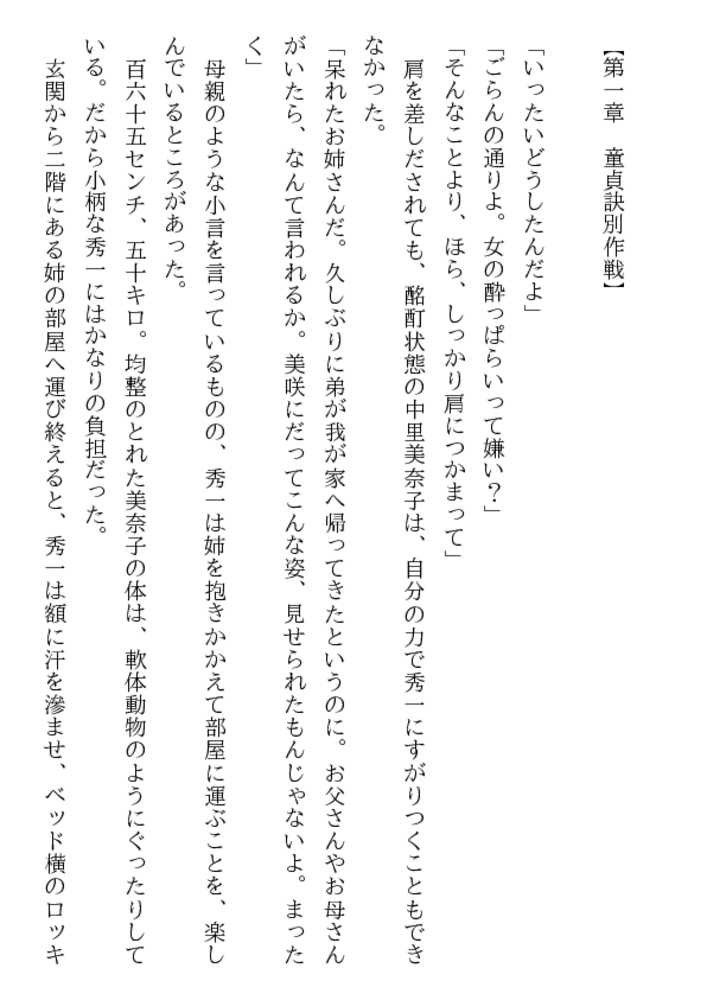 初めて見る姉の美しくも淫らがましい裸身だった。 白い滑らかな太腿の付け根で息づく魅惑の亀裂。 紅梅色の肉片が蠢き、甘美な香りが漂ってくる。 酔って帰宅した美奈子を介抱するまで考えなかった― お姉さんをレ○プしたい! 初体験はお姉さんと…… 猛る勃起は21歳の美肉の前で、弟を凌○者にした!