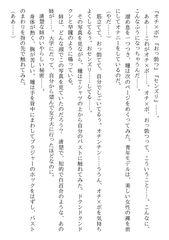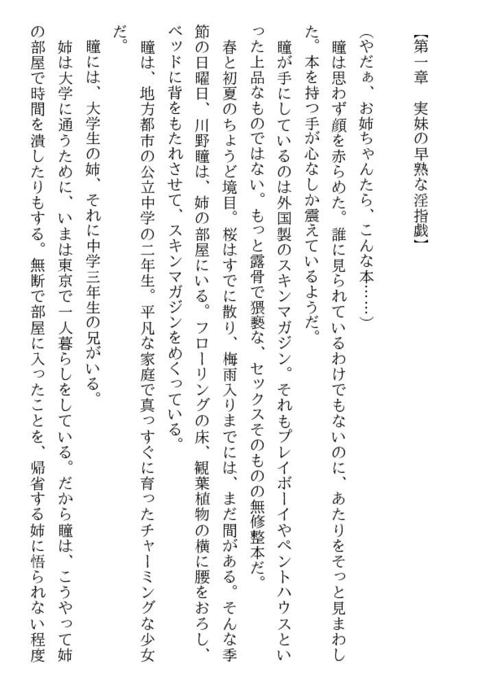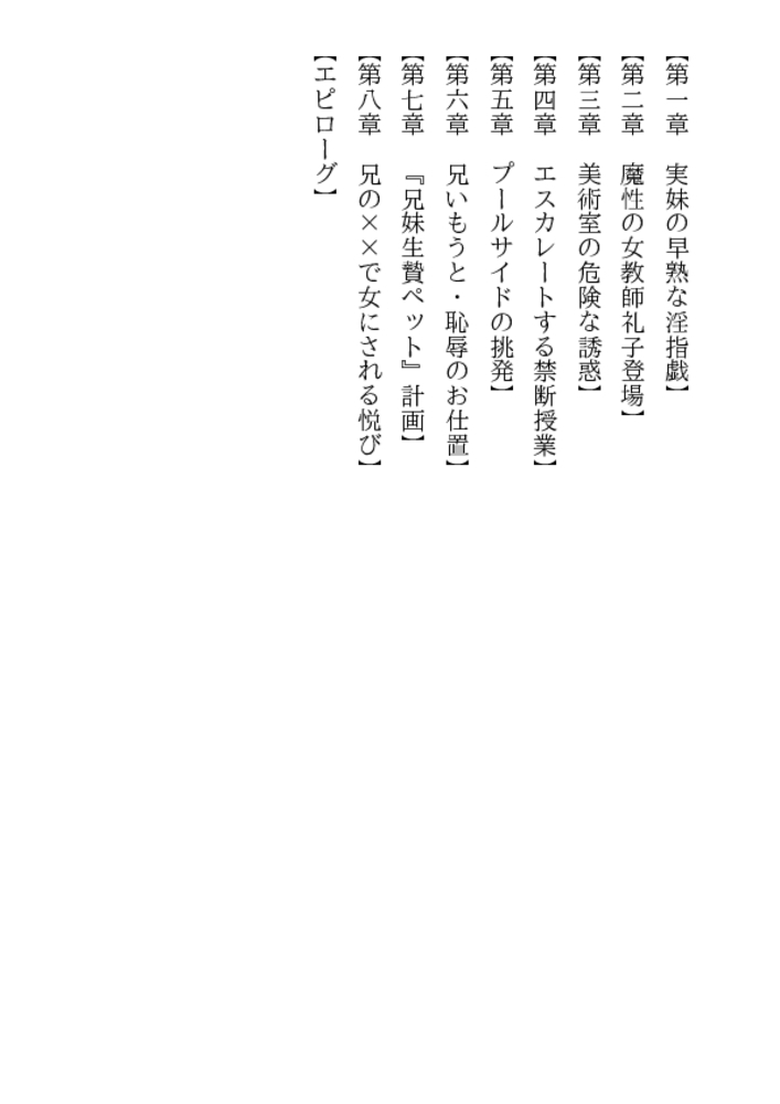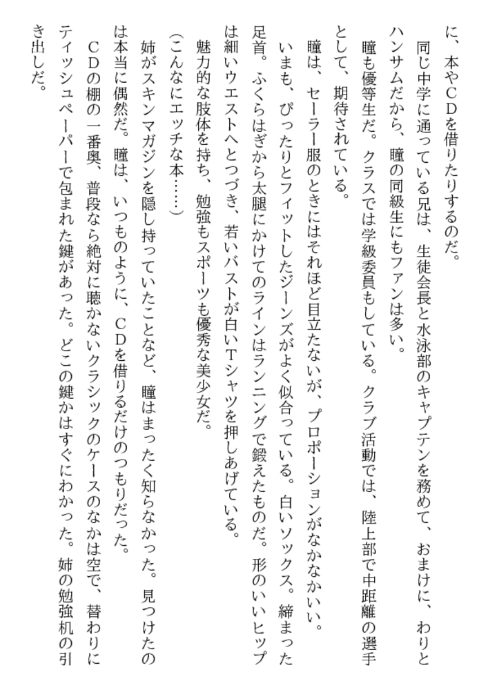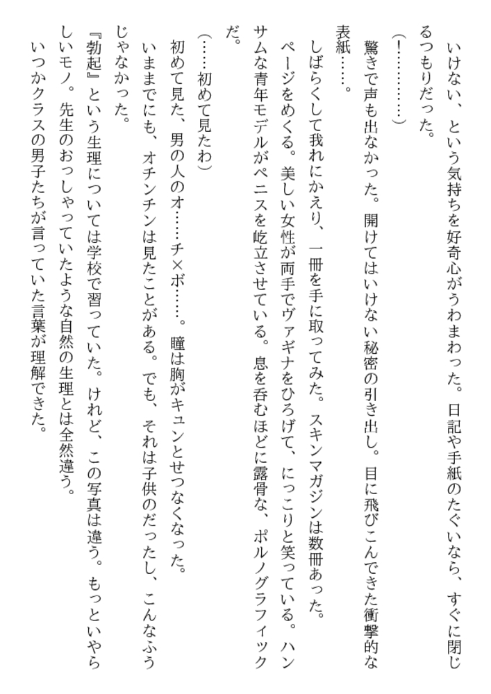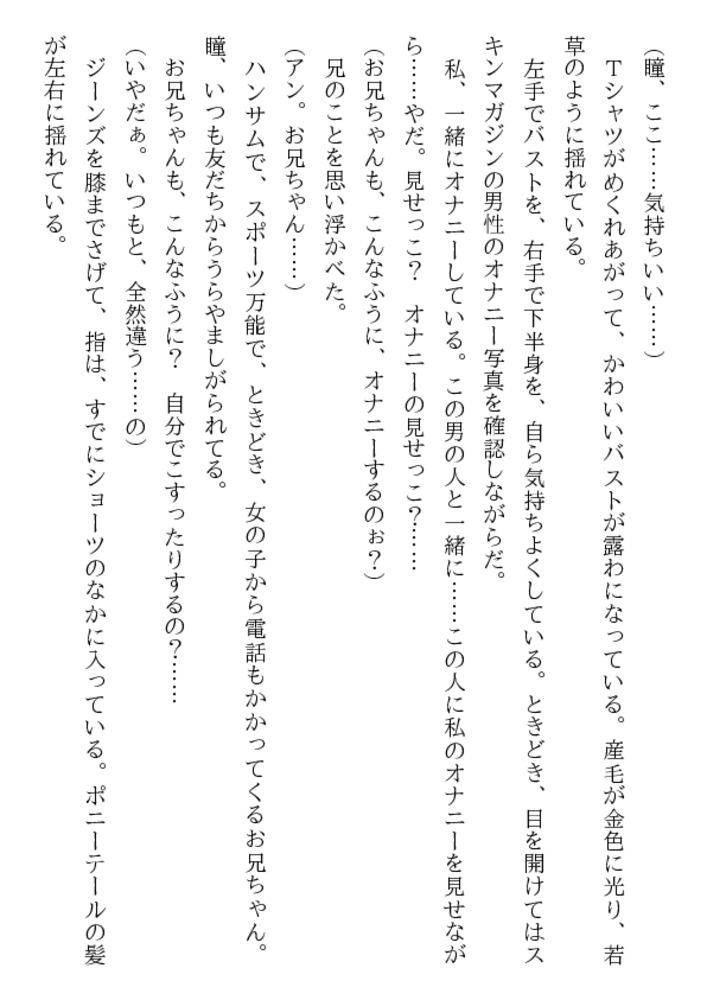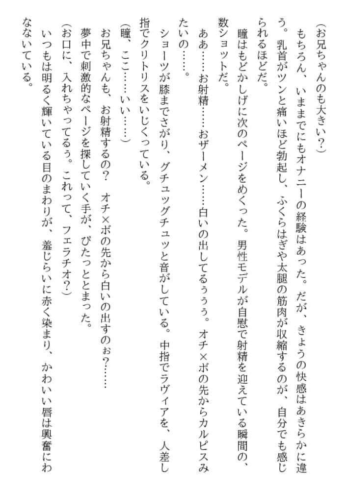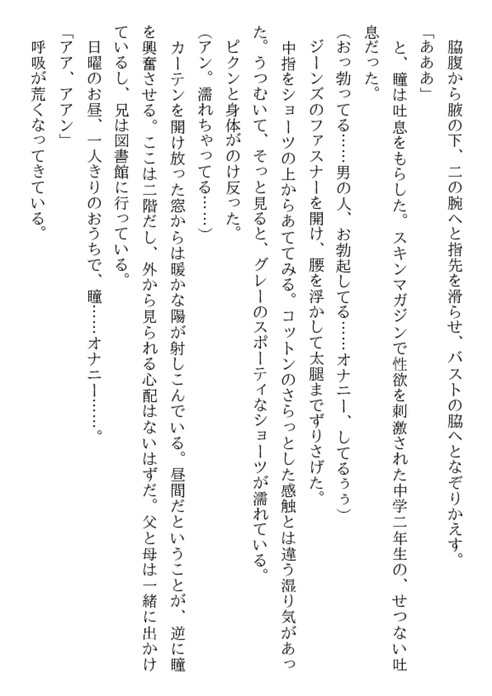 ああッ、お兄ちゃん、勃起してるゥ……。初めて見る兄の剛直は、大きく硬くたくましかった。瞳も素っ裸で、濡れた恥肉を兄の熱い視線に晒している。「さあ瞳、お兄ちゃんのペニスで女になるのよ」魔性の女教師・礼子が個人教授する禁断の相姦レッスン。14歳の処女肉が初めて知る禁断のわななき……。