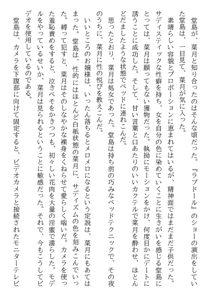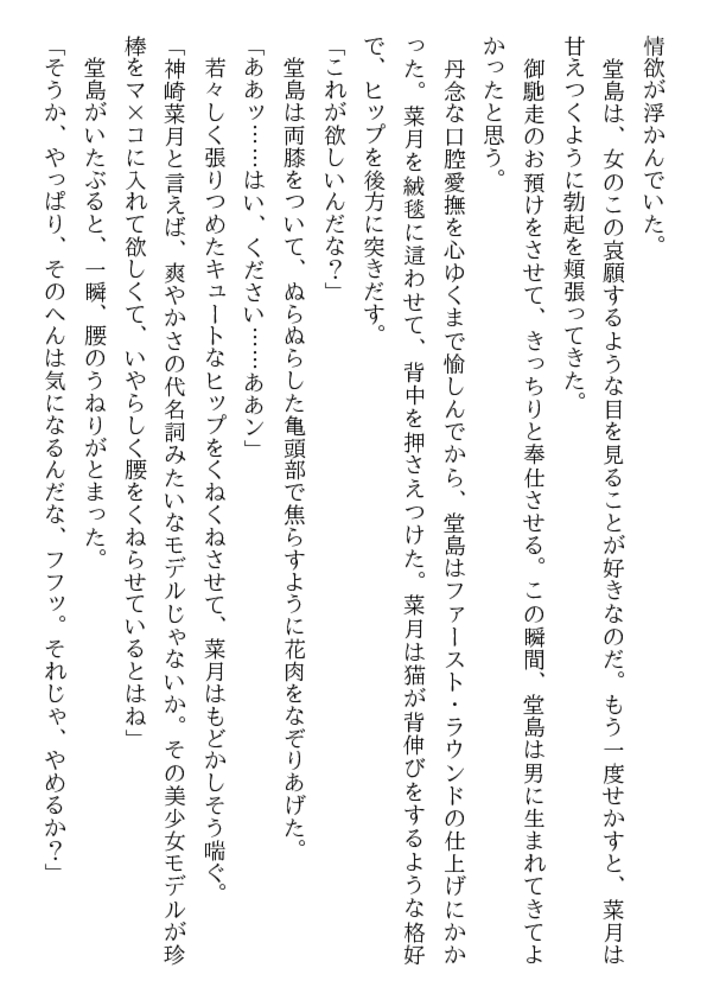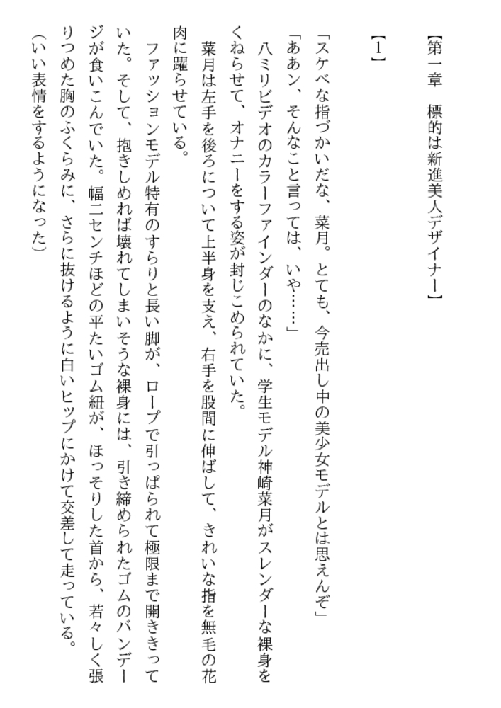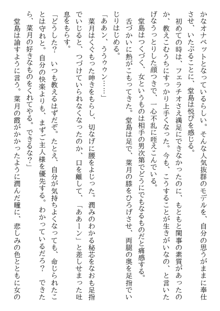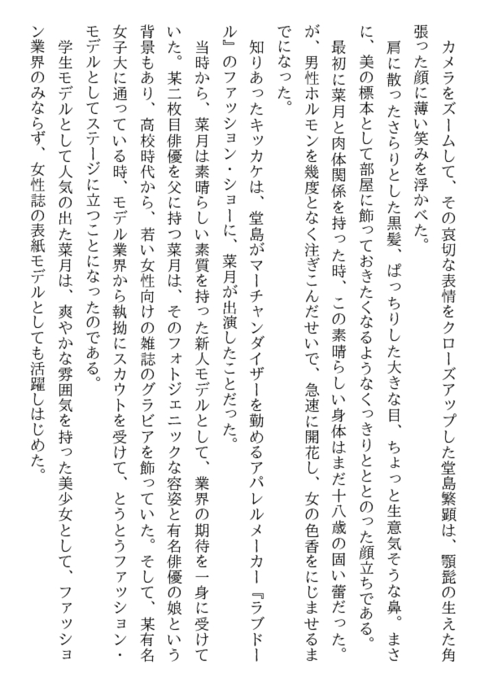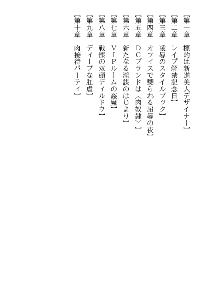 強烈なスポットライトが、くびりだされた美乳を、剥きだされた媚肉を、大勢の男たちの目に晒しだす。ああ、本当に私は奴○に堕ちてしまったんだわ……モード界の期待の新進美人デザイナー槇村志保美が、ステージの上で全裸に剥かれ、恥辱の肉接待が強要される。名声と才能を妬む男たちの復讐劇が今、幕を開けた……