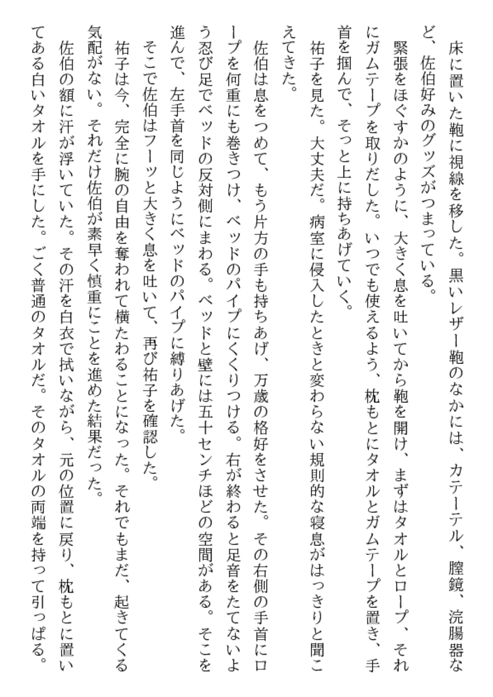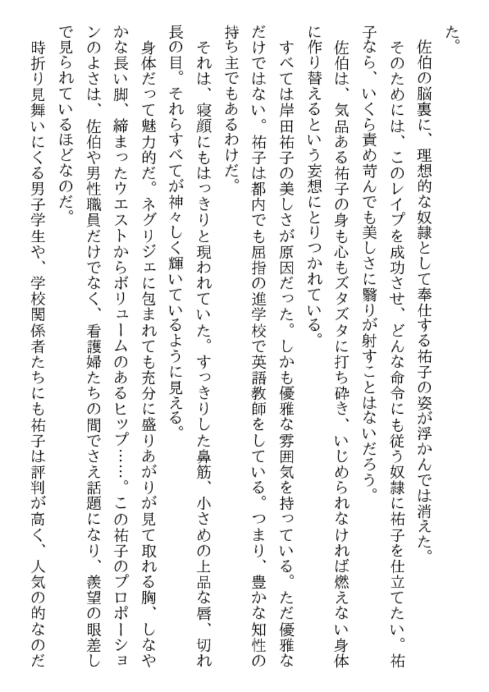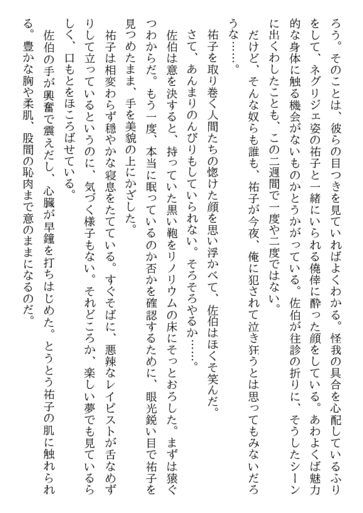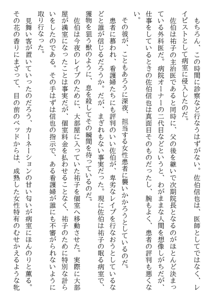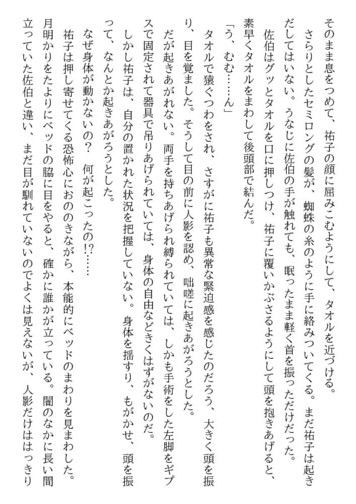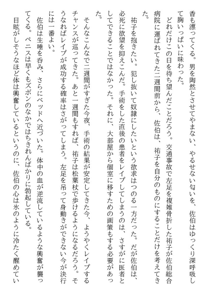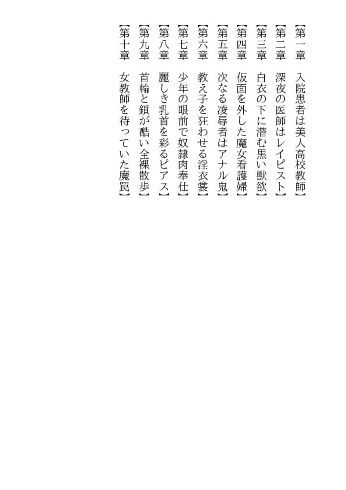 やめて! 医者が患者を縛って○すなんて!……深夜の病室、足にはギプス、両手には縄、口には猿轡、自由を奪われた祐子が全裸に剥かれ恥肉を晒される。ベッドに欲望も露わに群がる医師、看護婦……。学園のマドンナ美教師を入院中に奴○調教を施さんと、倒錯者達は性具や医療器具を手に女体へ飛びかかった。