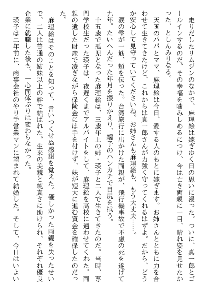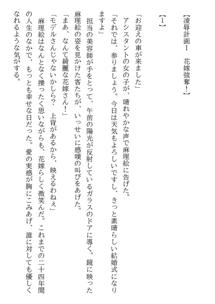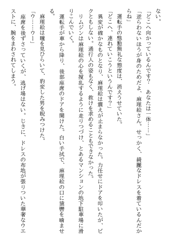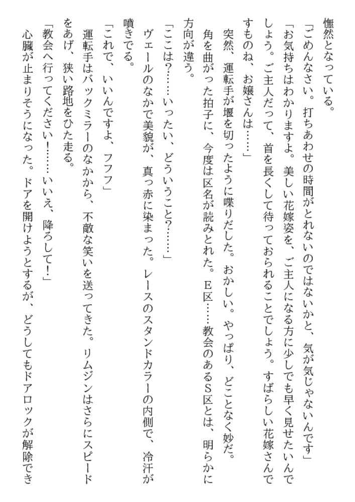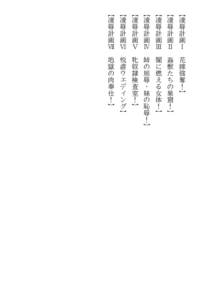 清純で気品あふれる美貌、均整のとれた肢体──。24歳の麻理絵に映える純白のウェディングドレス。なのに結婚式当日、ドレス姿のまま拉致されて淫狼の巣窟に監禁され、レ○プされようとは……。さらに姦獣たちは姉の瑛子まで誘拐し、緊縛、肛虐、輪○……と、牝特訓の恥辱宴は果てしなくつづく!