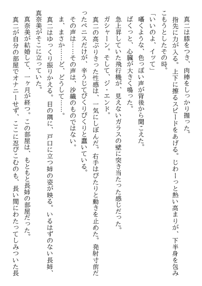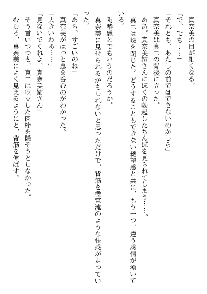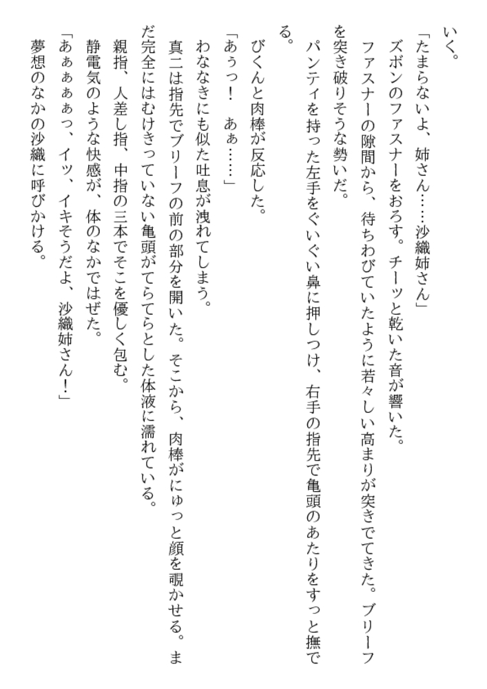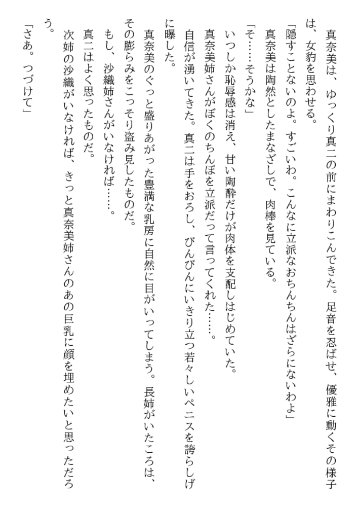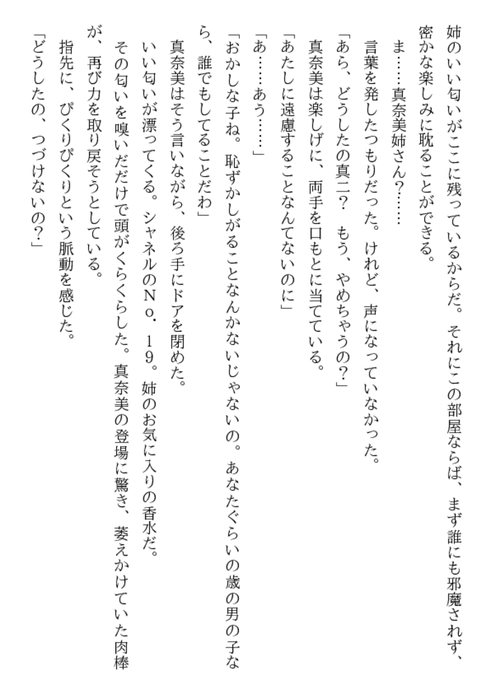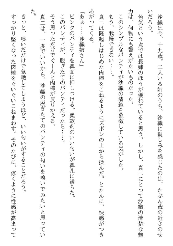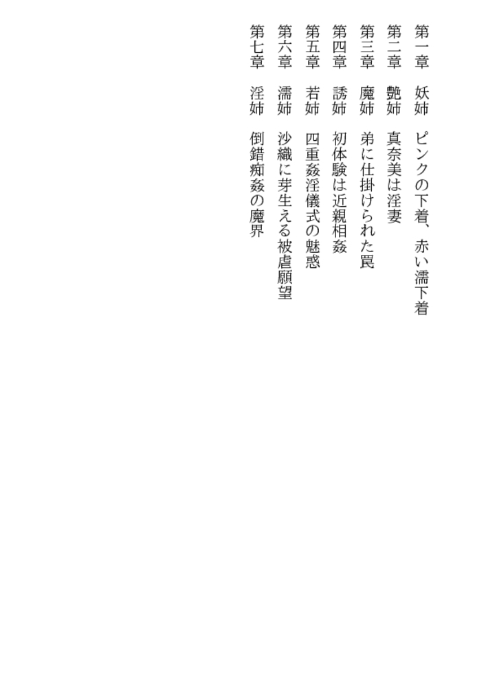 少年の手には沙織がはいていたピンク色のパンティ。眼前には真奈美が赤いレースパンティをチラつかせる。脱いだばかりの、むせるほど甘い牝臭を溜めた下着だ。加えて姉は、黒い陰毛と痴肉を弟に舐めさせようと……人妻と19歳、二人の美姉に憧れる弟を挑発し、相姦と倒錯の魔界へ誘う淫姉の奸計が今、幕を開けた!