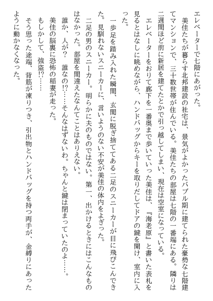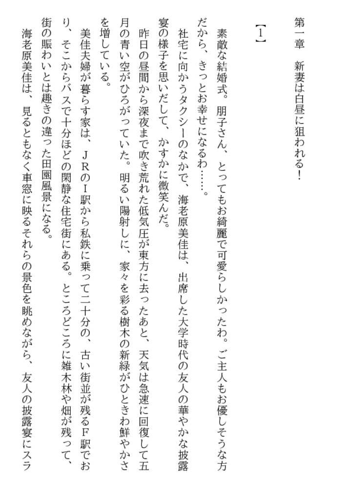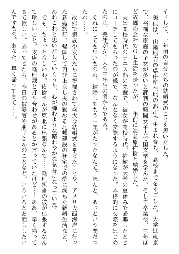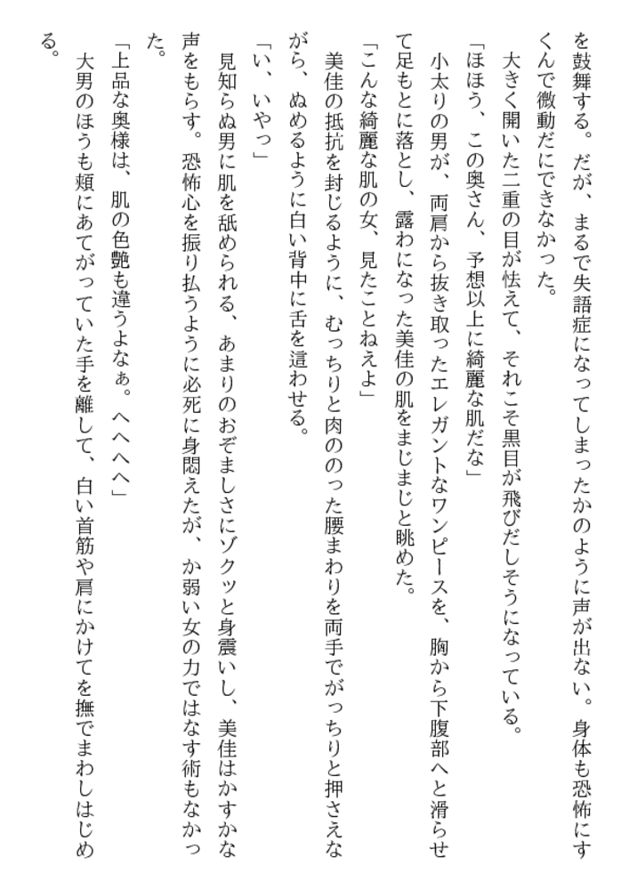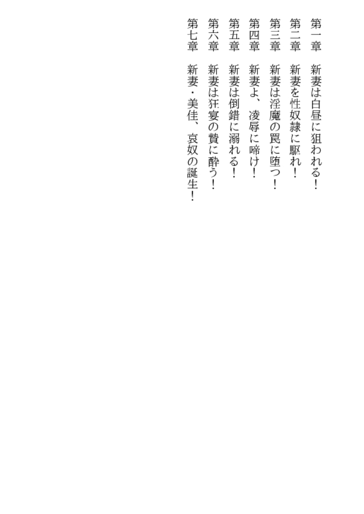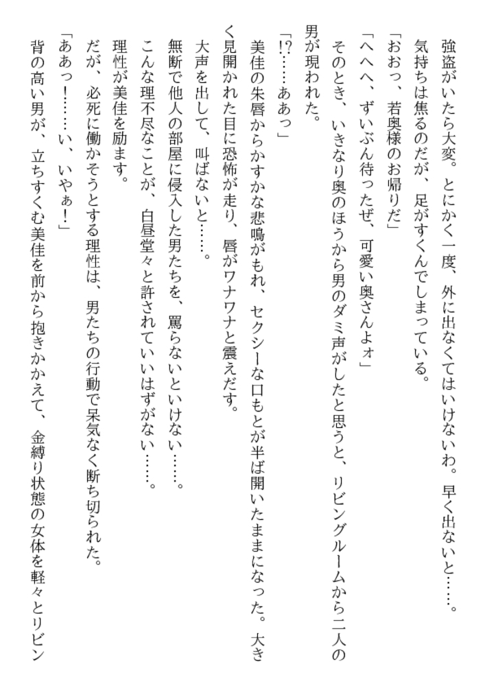 自宅のドアを開けた途端、暴漢二人が新妻を襲う! 瑞々しい女体を裸に剥かれ、ベッドに縛られる! そして肉塊も露わな野獣達は新妻の股間と唇に迫る! 叫びたい。抗いたい。しかし声も出せない美佳! 幸せな新婚生活が一転して恐ろしい凌○と輪○に! 夫の上司まで加わり、新妻美佳の貞操は崩壊し性隷へ!