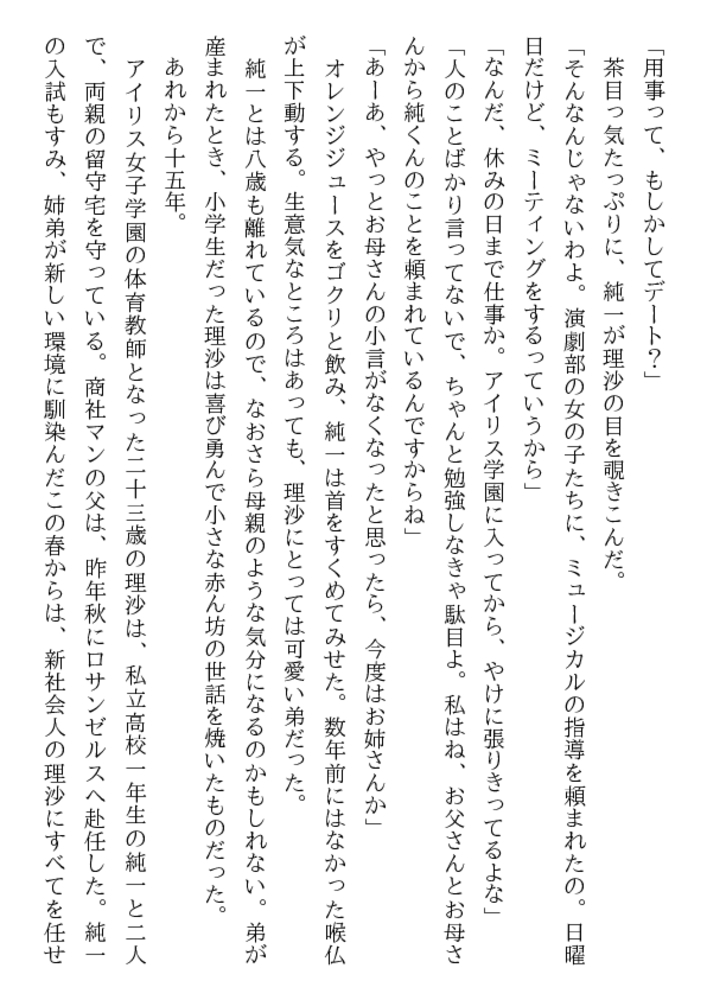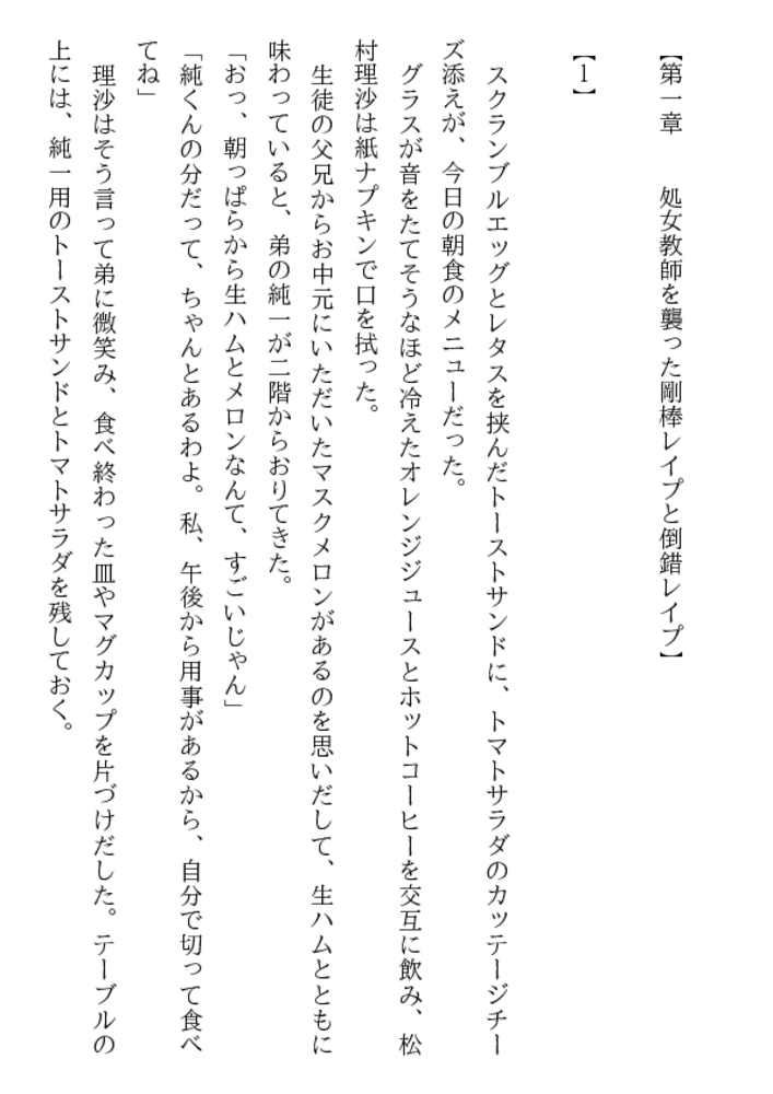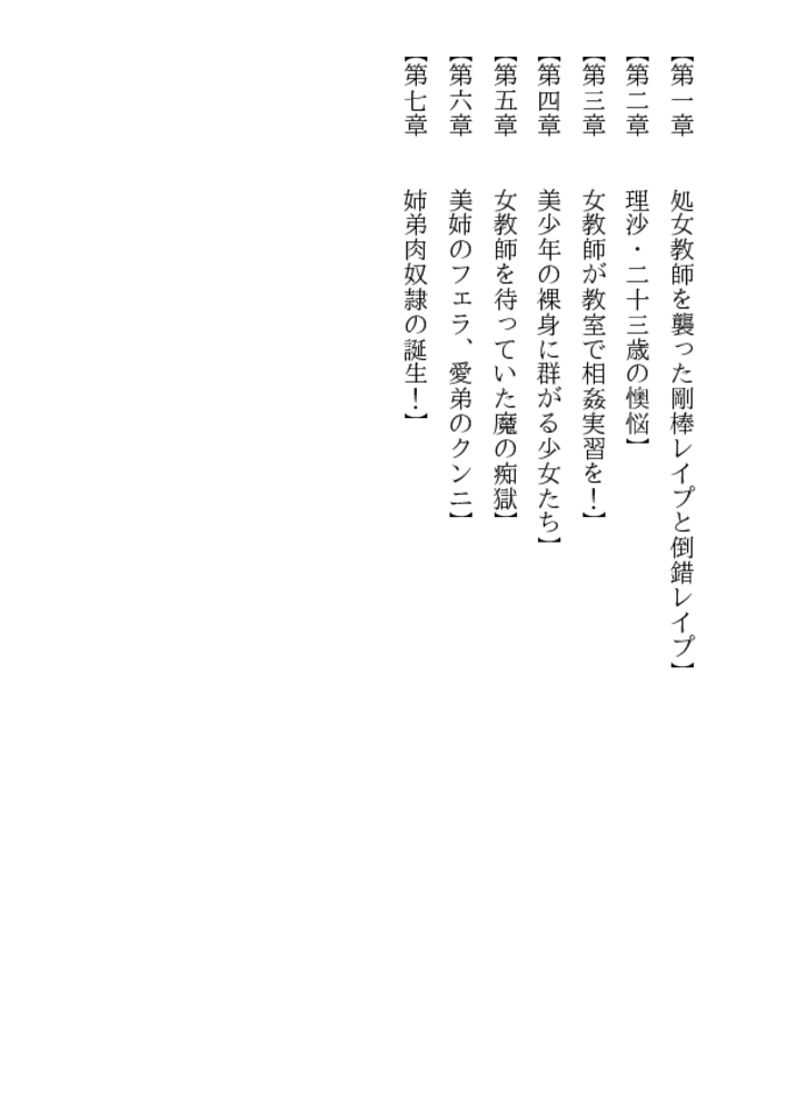 「先生、腰をおとして。弟の××がハマるようにね」教え子達を前に、教壇で姉弟は全裸だった。横たわる弟の性器を跨ぐ理沙の肩を少女が押す。レ○プで処女を失った女体に童貞の肉塊がめりこむ。授業中に女教師が相姦の実習をさせられるなんて……。しかし理沙たちには、もっと恐ろしい魔獄が!