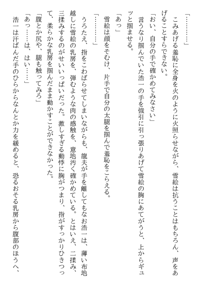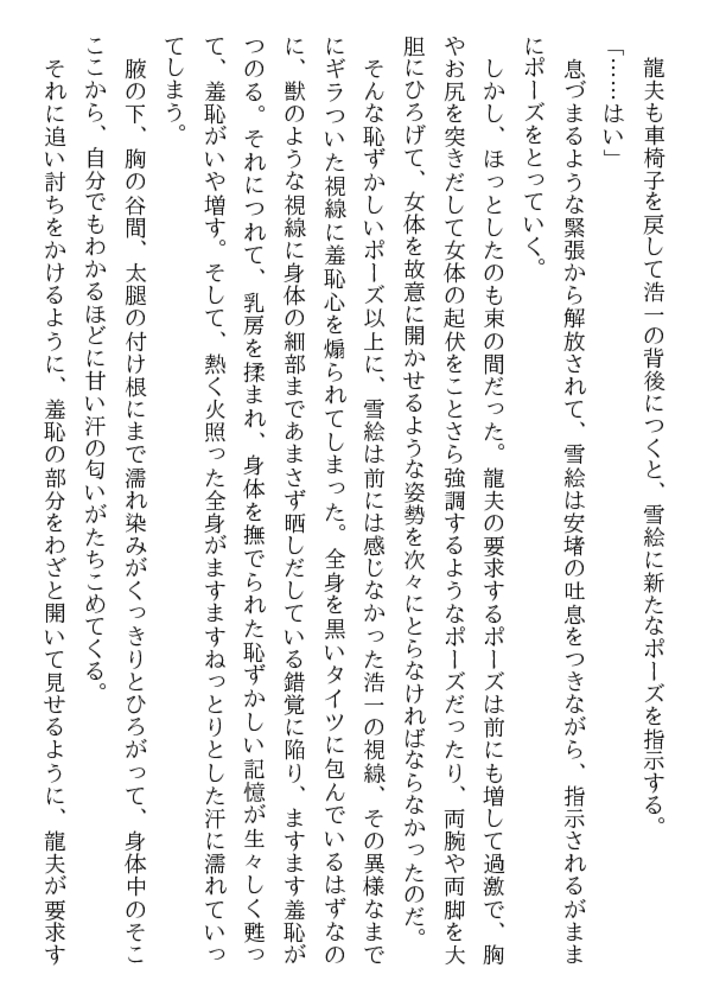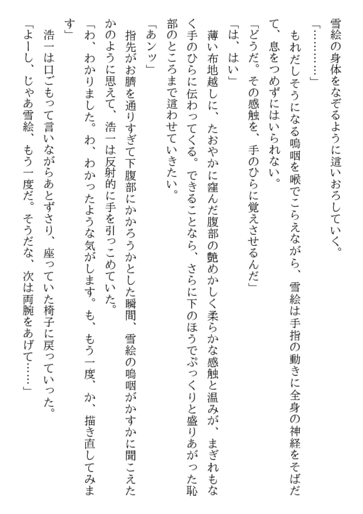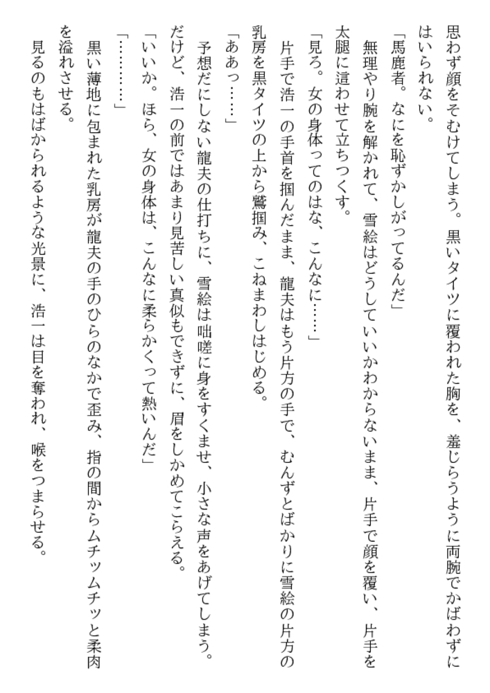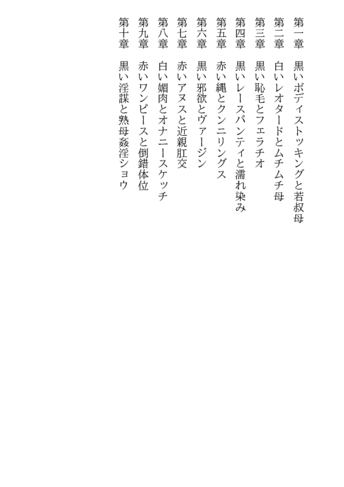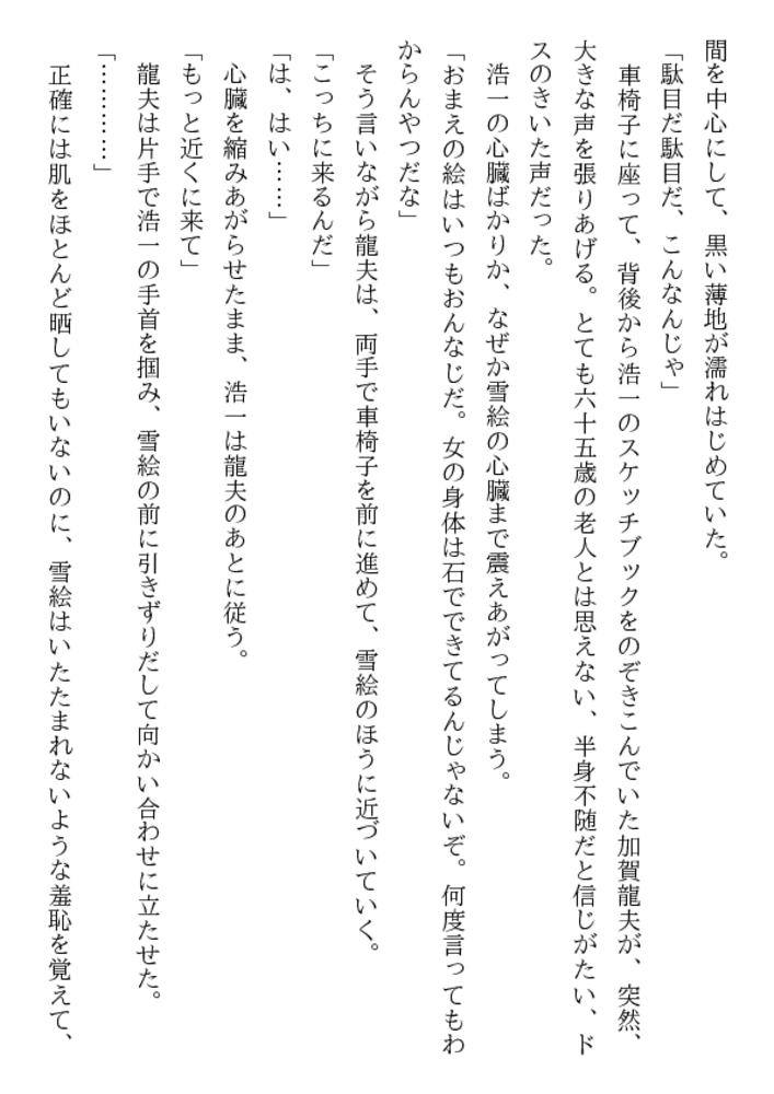 こんなに美味しそうな乳房、乳首があるだろうか。これほど淫靡で初々しい女陰がどこにあるだろう。処女のまま熟成され、倒錯の快楽に溺れる女体から、黒い全身タイツが剥かれ、ムチムチ肉が露わに……。甥のモデルとなり、恥部まで晒す熟れすぎた叔母。雪絵を鑑賞する甥の目は、芸術家ではなく凌鬼に!