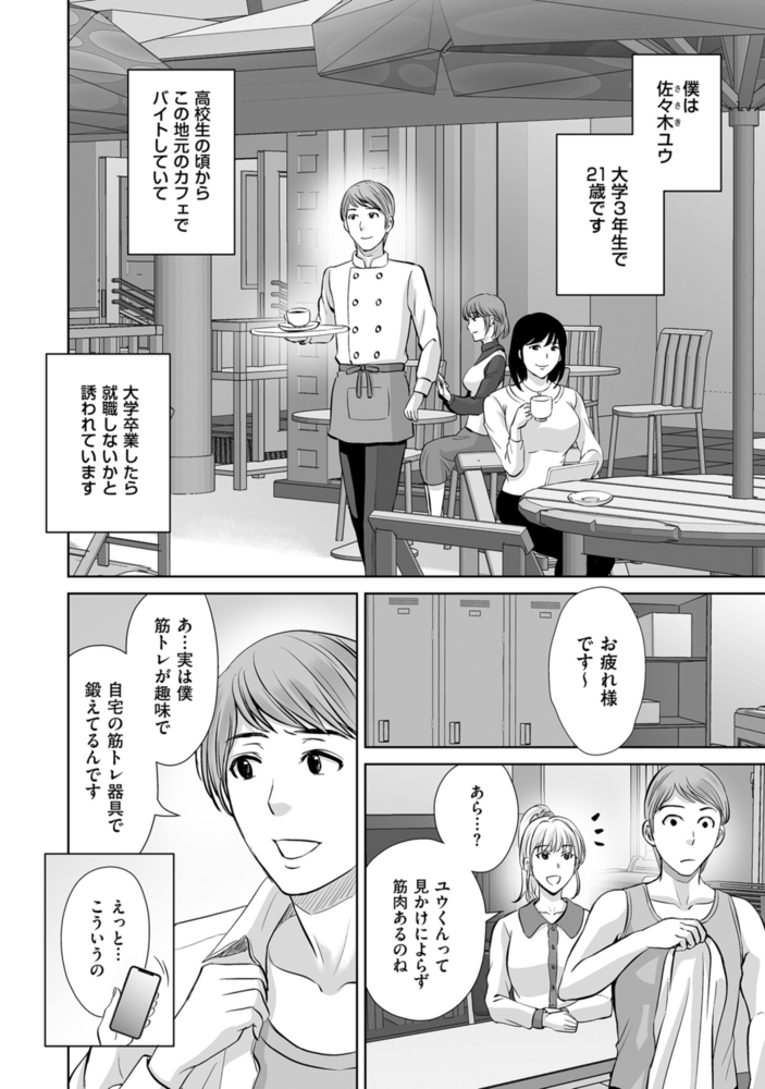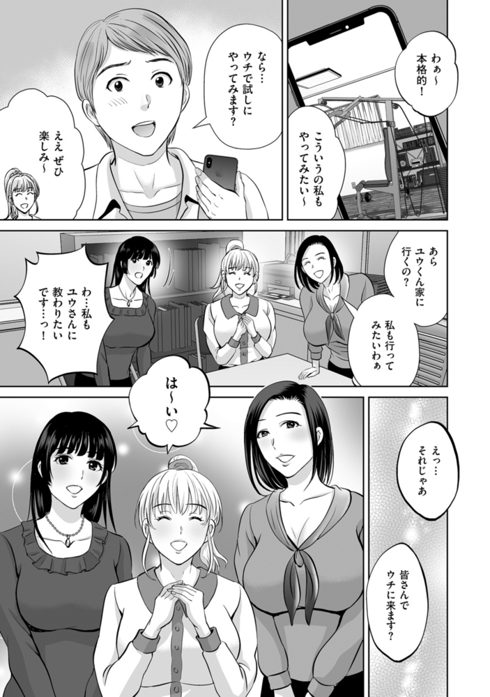 筋トレ器具を大量に持つ大学生・ユウの家にお邪魔することになった、バイトの同僚の人妻三人組。そのうちの一人、お上品な沙織さんのウェアが、下着はおろか乳首までスッケスケ! こっそりデカ乳を揉みしだきつつトレーニング開始♪