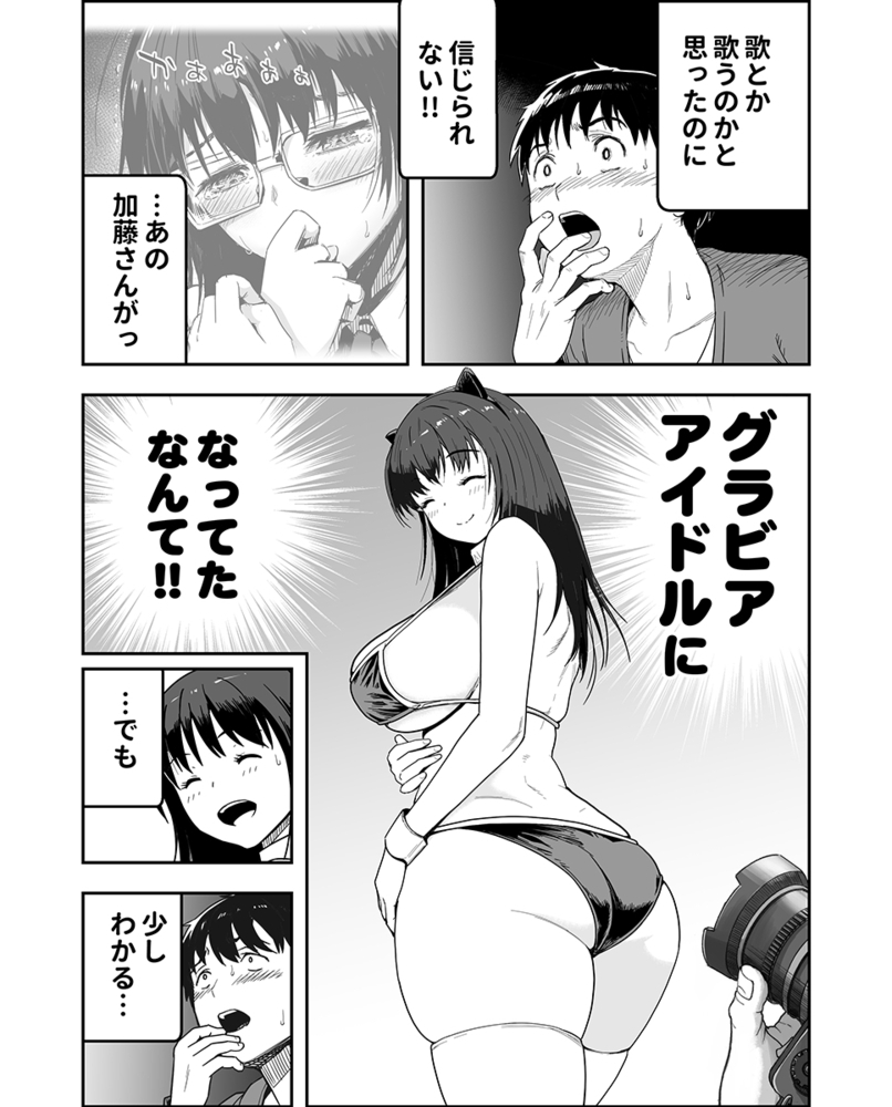 学生の時好きだった加藤さん。チャラ男の同級生、南陽くんの誘いで、今はアイドルになったという彼女の撮影現場に向かった。久しぶりに見た彼女はとても魅力的だけれど、マジックミラーの向こうの撮影現場はどこか異様な雰囲気で…。どんどんエスカレートしていくHな要求、マジックミラーの外から視姦する観客達。目の前でチャラ男の巨根をねじ込まれていく、僕の大好きな加藤さん。そうか、この撮影は はじめから彼女を陥れるための撮影だったんだ…。