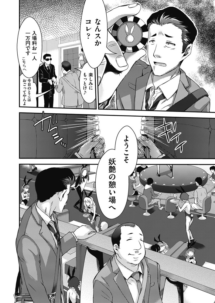 仕事が終わった後に会社の先輩に連れてこられた怪しいクラブ。サングラスの黒服にコインを渡され扉をくぐるとおっぱい丸出しのバニー姿の女のコ達がアルコールを運んだりポールダンスをする広いキャバクラのような場所。そんな女の子を両脇にお酒を呑んでいると、音が鳴って「フィーバータイム」が開始される。入場で渡されたコインを渡すと女の子を好き放題に出来てしまう!?