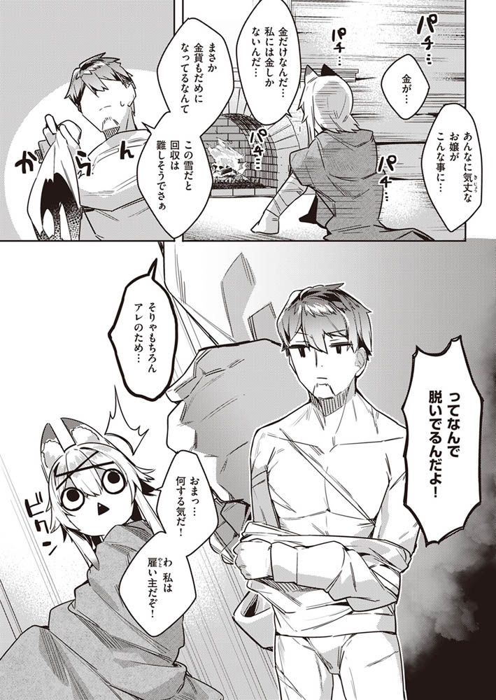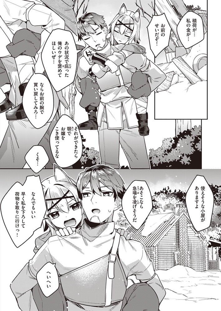 傭兵のヴェルとともに雪道を馬車で進んでいる最中、落下事故を起こし積み荷とお金を失ってしまう。