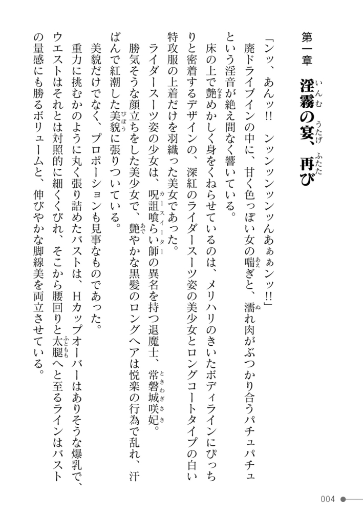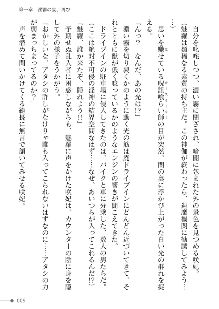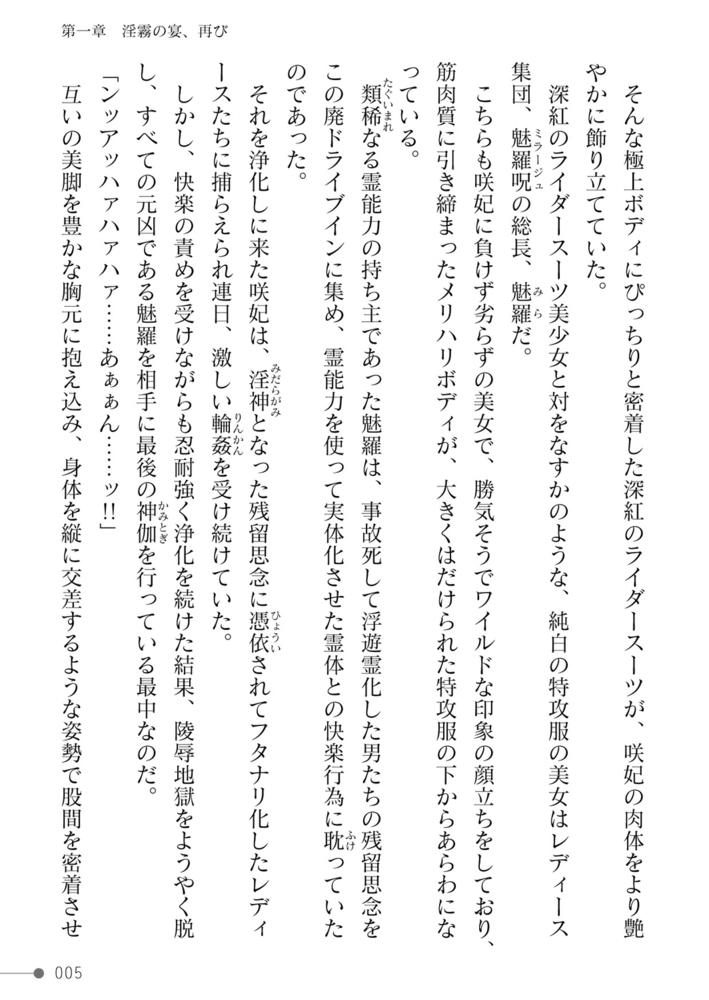 淫神に憑依されたレディース集団、魅羅呪(ミラージュ)を救うべく、総長とバトルファックを挑むライダースーツを纏った退魔士・咲妃。
