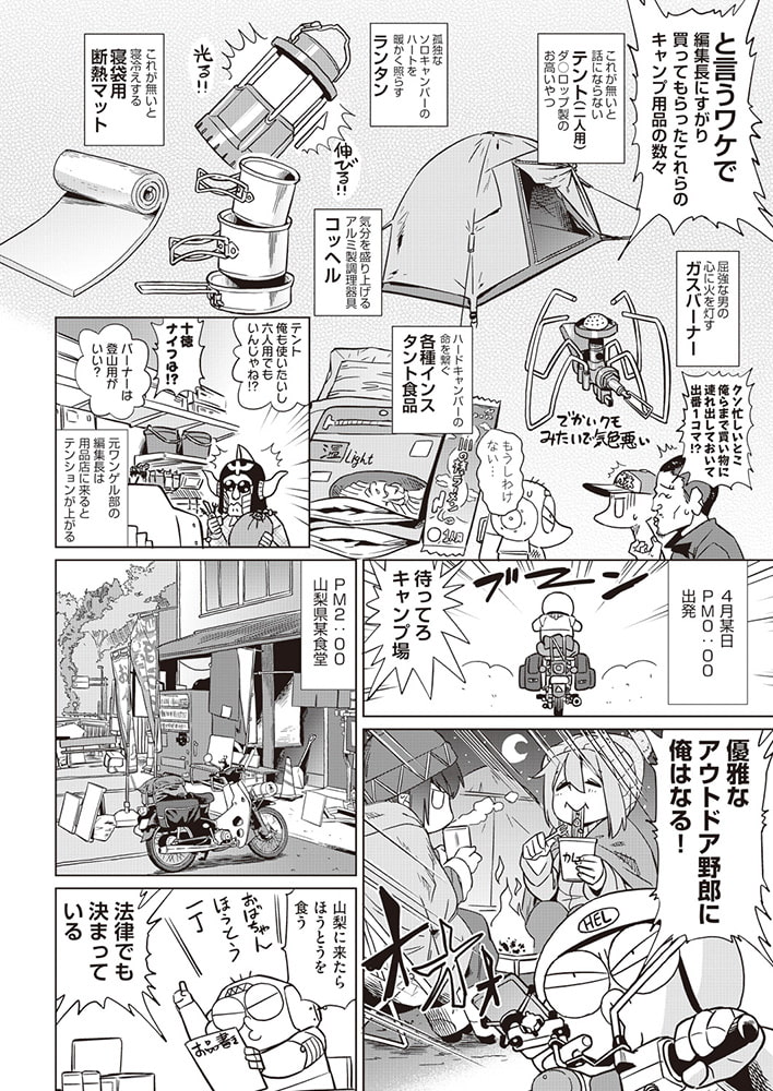 何年も放置されていたカブ旅企画がやっと始動!某ゆるキャンプアニメに影響されたあべ先生。キャンプ道具を編集長に泣きついて揃えてもらいやっと出発したは良いが雨に見舞われた挙句初心者なので想定外なことばかり!?