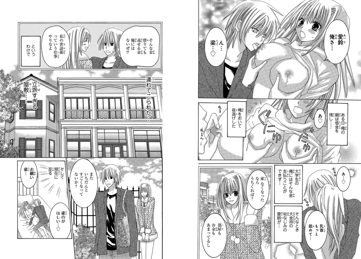 幼なじみで大金持ちのお嬢様・愛鈴(あいり)に借金を肩代わりしてもらった上に、お屋敷に住まわせてもらうことになったオレ。女しかいないお屋敷内では双子のコスプレ妹、パンチラメイド、そして下着姿の幼なじみがオレのまわりでうろうろ。そんな中で男はオレ1人…って、これなんて美少女天国!? そのうえ、美人でナイスバディなお姉さま家庭教師に人気のないところに連れ出され、「カラダの火照りがおさまらないの★ あなたのモノで私を満たして!」なんて誘惑されちゃったよ! 巨乳で挟んでスリスリ、お口でクチュクチュしゃぶられて…