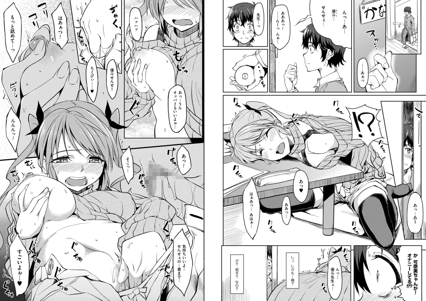 家庭教師先の可奈美ちゃんは、やる気のある生徒で教えがいのある嬉しい生徒。ある日、教えた帰りに財布を忘れたことに気づき、取りに戻ると何と可奈美ちゃんがオナニー中!!? しかも、自分がネタにされている!成り行きで覗いてしまったのだが、気づかれて大泣きされてしまった… そんな可奈美ちゃんをなだめているうちに妙な雰囲気になってしまって、禁断の生徒とのエッチに……