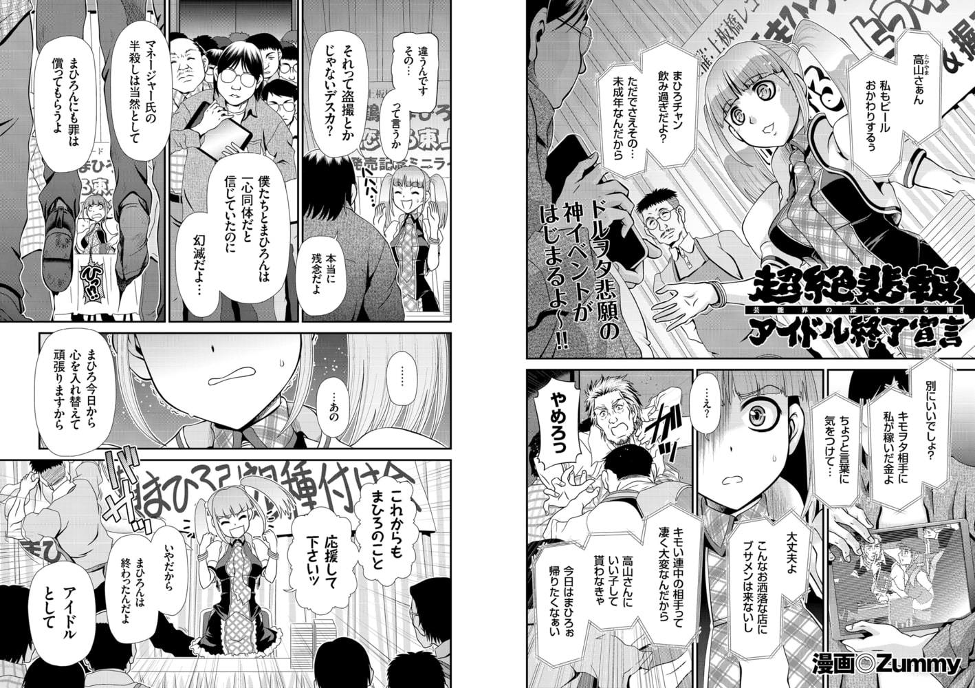 ツインテールが目印の鶴瀬まひろは人気急上昇中のアイドル♪ レコ発ミニライブ&握手会の会場でファンによるスキャンダル暴露が発端となってまさかの種付けミーティングがスタート!! 憤慨するファン一同を前にたじろぎながらも反論するまひろだが、ボコボコにされたマネージャーの姿に本性が発現。その様子にぶち切れたキモオタファンに囲まれたまひろはあっという間にあられもない姿にひん剥かれ穴という穴にオチ○ポをぶち込まれていくのであった…。