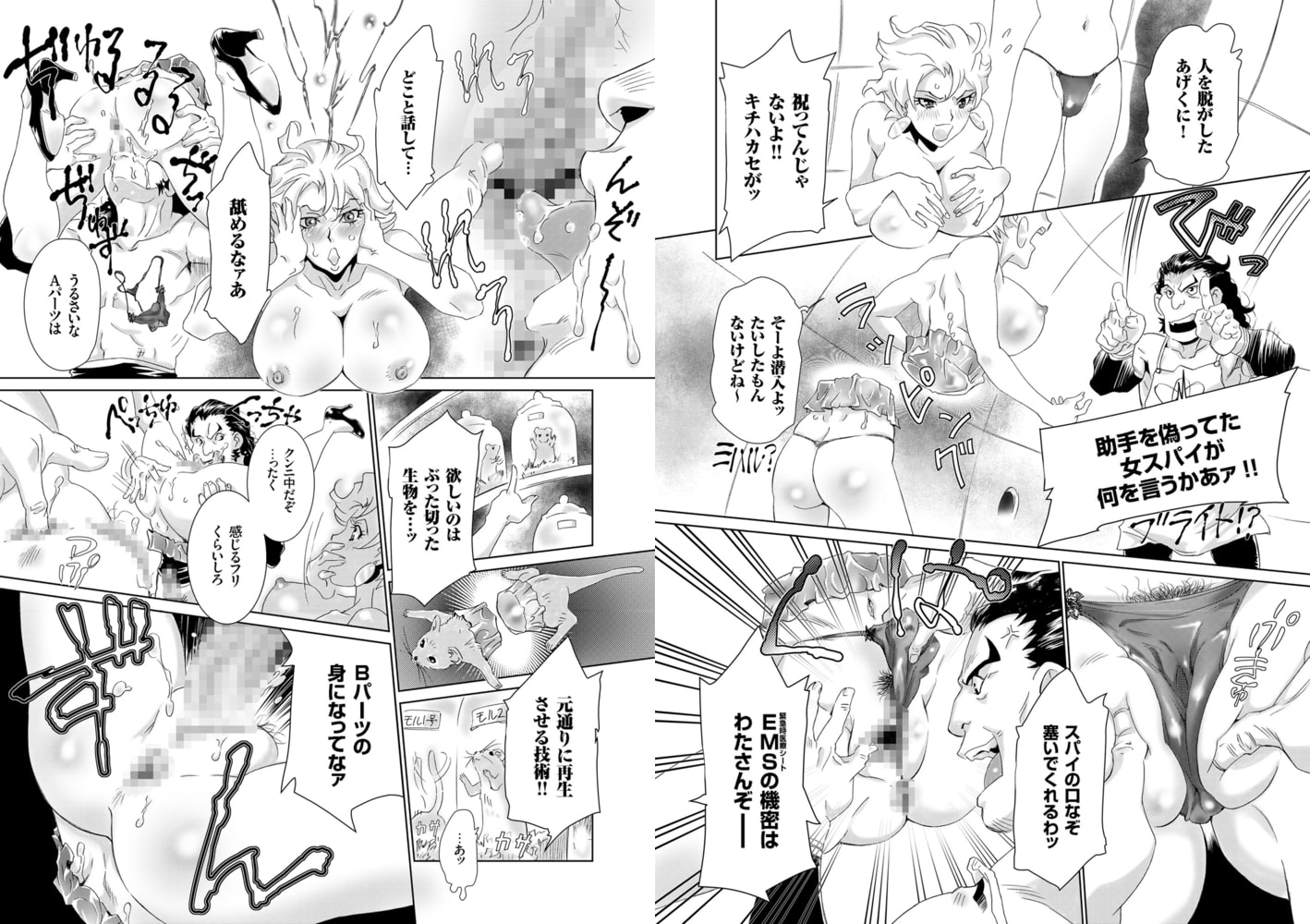 狂博士が開発したEMSこと緊急時医療用シートは傷口に張り付ければ、あら不思議完全止血どころか切り離された人体すらも生存させる画期的なもの。ネズミを分断しての実験が成功というところで今度は人体実験がしたいんじゃー! 研究の機密を持ちだそうとした女スパイという都合の良い被験体が手に入ったところで合体ロボの如く、上半身と下半身を真っ二つにして…マジキチ妄想の最終兵器を目撃せよ!