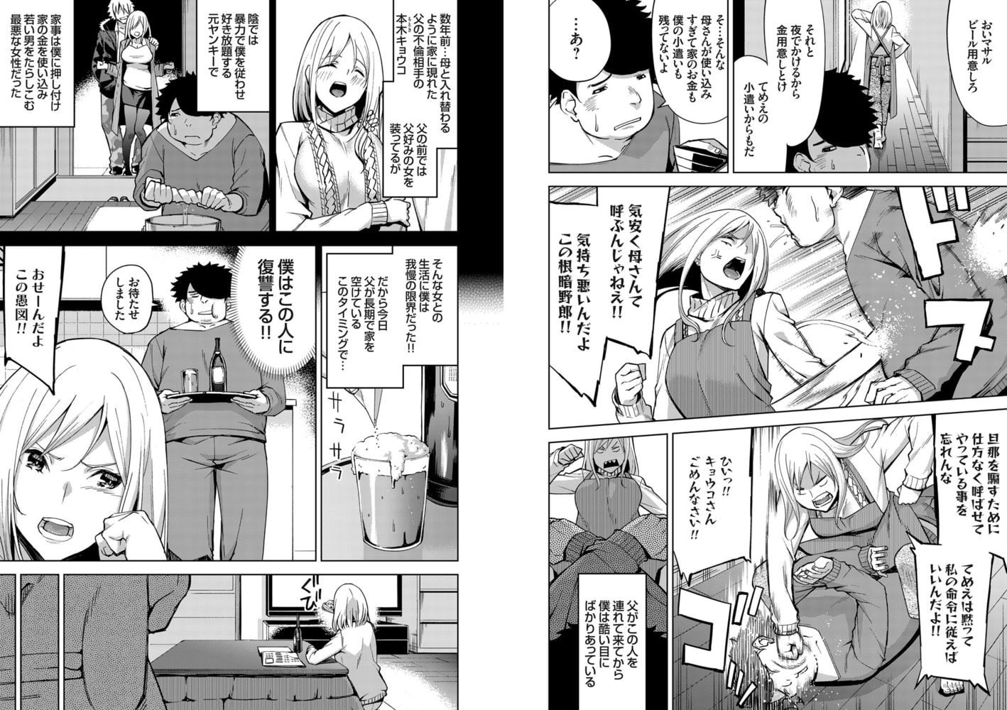 出張に出かける夫の曲がったネクタイを直し、笑顔で見送る妻キョウコ。夫の姿が見えなくなった途端、放った言葉は「旦那の理想を演じるのマジだりぃわ」!?そして息子のマサルにビールを用意させ、自分が出かけるための金を用意しろと命令をするとマサルから「母さん」と呼ばれ大激怒。マサルに殴りかかり、よろけたところを馬乗りになってさらに殴る…。実の母と入れ替わるように家にやって来たキョウコにひどい目にばかり合わされるマサルは父が出張に出たこのタイミングに復讐を計画していた…。そんなことも知らずに出されたビールを飲むキョウコは、そこに混ぜられた睡眠薬で意識を手放す。マサルはキョウコの服を剥ぎベッドに縛るとローションタイプの媚薬からクリームタイプの媚薬と次から次へ全身に擦り込み、そしてアソコには錠剤タイプの媚薬を…。大量の媚薬漬けになったキョウコはいったいどうなってしまうのか…!?