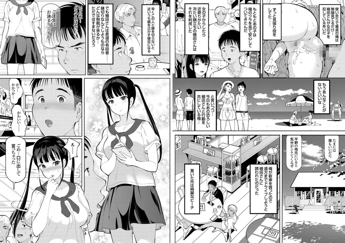 人畜無害そうな穏やかな顔立ちで童貞の樫村(かしむら)。先日、先輩の植田(うえだ)に指示を受け見知らぬ女の子をナンパし、人気のない公園で植田がレ○プを行う最中、見張り番をさせられていた。もうあんなことがないといいと思いつつも、彼は柔道有段者で荒っぽい植田の制裁を恐れており縁を切れずにいた。そんな日々を送る中、新車を買った樫村は夏のある日、植田にドライブに誘われてとあるビーチにたどり着く。そこの海の家で出会った巨乳バイト娘に見とれてしまった樫村は思わず「可愛い…」と口に出してしまうと、それを見逃さず「あいつを犯そう」と誘いをかける植田。作戦を告げられ樫村はバイト娘に声をかけ駐車場に連れ出すことに成功する。隙をつき即座に植田がバイト娘を車に押し込み、騒がないよう昏睡スプレーで眠らせラブホへ向かう。いつもはダシに使われてしまう樫村なのだが今回はなぜか意外な展開に…植田の真意は!?