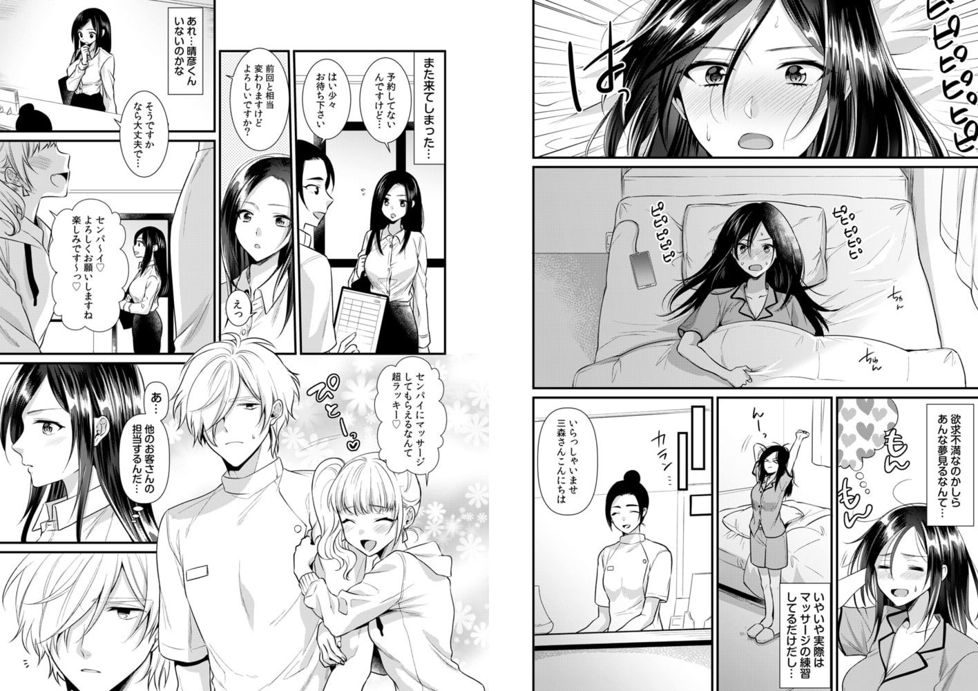 「そんなにソコ擦られたら…ダメ…イっちゃう…!」オイルでぬるぬるになった敏感なトコロを、丁寧に、激しくほぐされて――OLのあおいが住む部屋の隣に、昔可愛がっていた友達の弟・春彦が引っ越してくる。その変わりようにちょっとだけドキッとしていると、春彦が働いているというエステサロンに招待される。翌日、肌面積の広い施術着にドキドキしながらも、気持ちの良いマッサージに身を委ねていると…その手が際どいところに触れ始めて!?(年下相手に…意識したらダメ!でも男の人に触られるの久しぶりで…)カラダが熱くなる中、オイルで胸と乳首を丹念に揉みほぐされて、その手は下にも伸びていき――ダメ、外と中を同時にされたらッ…